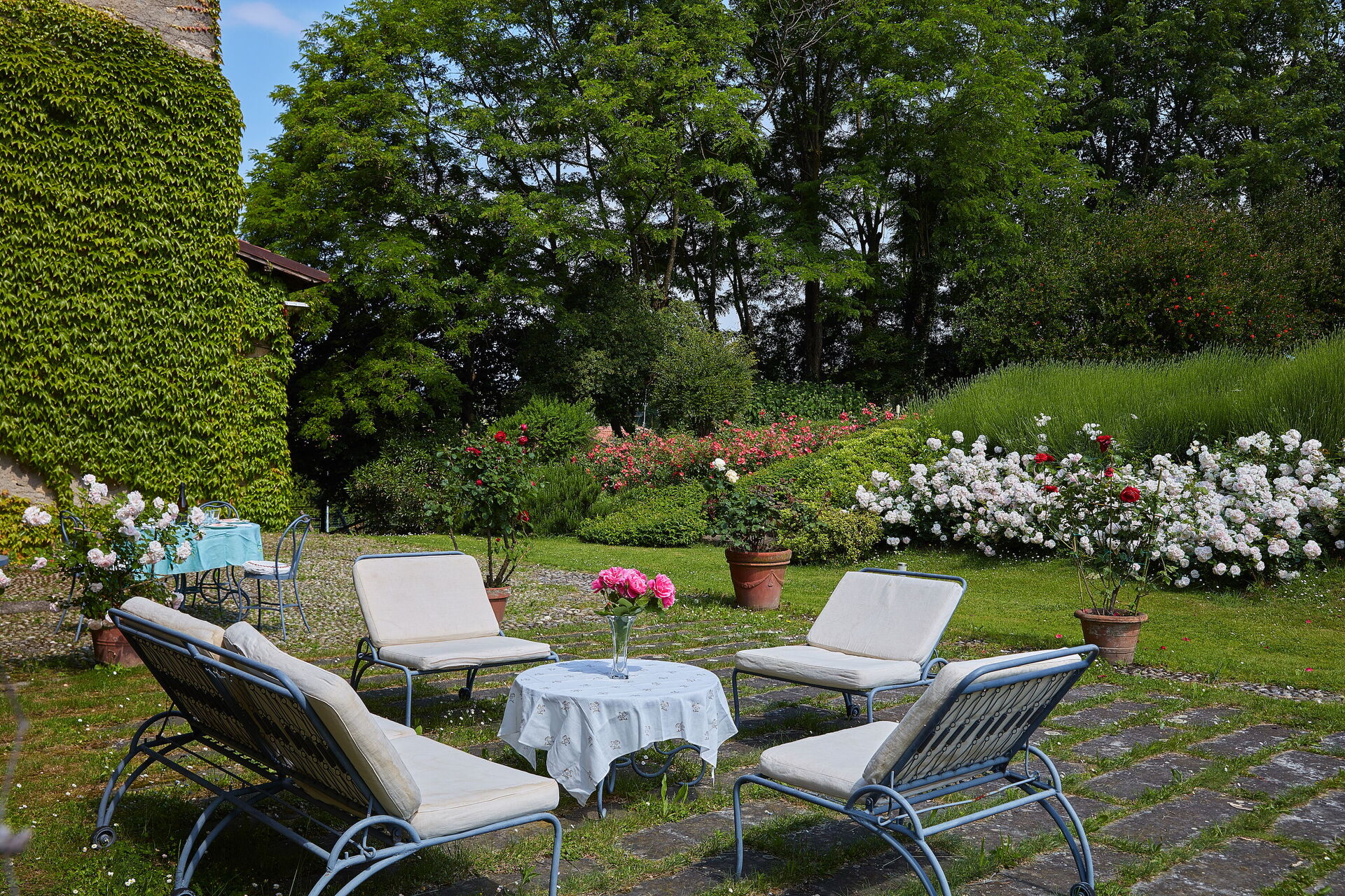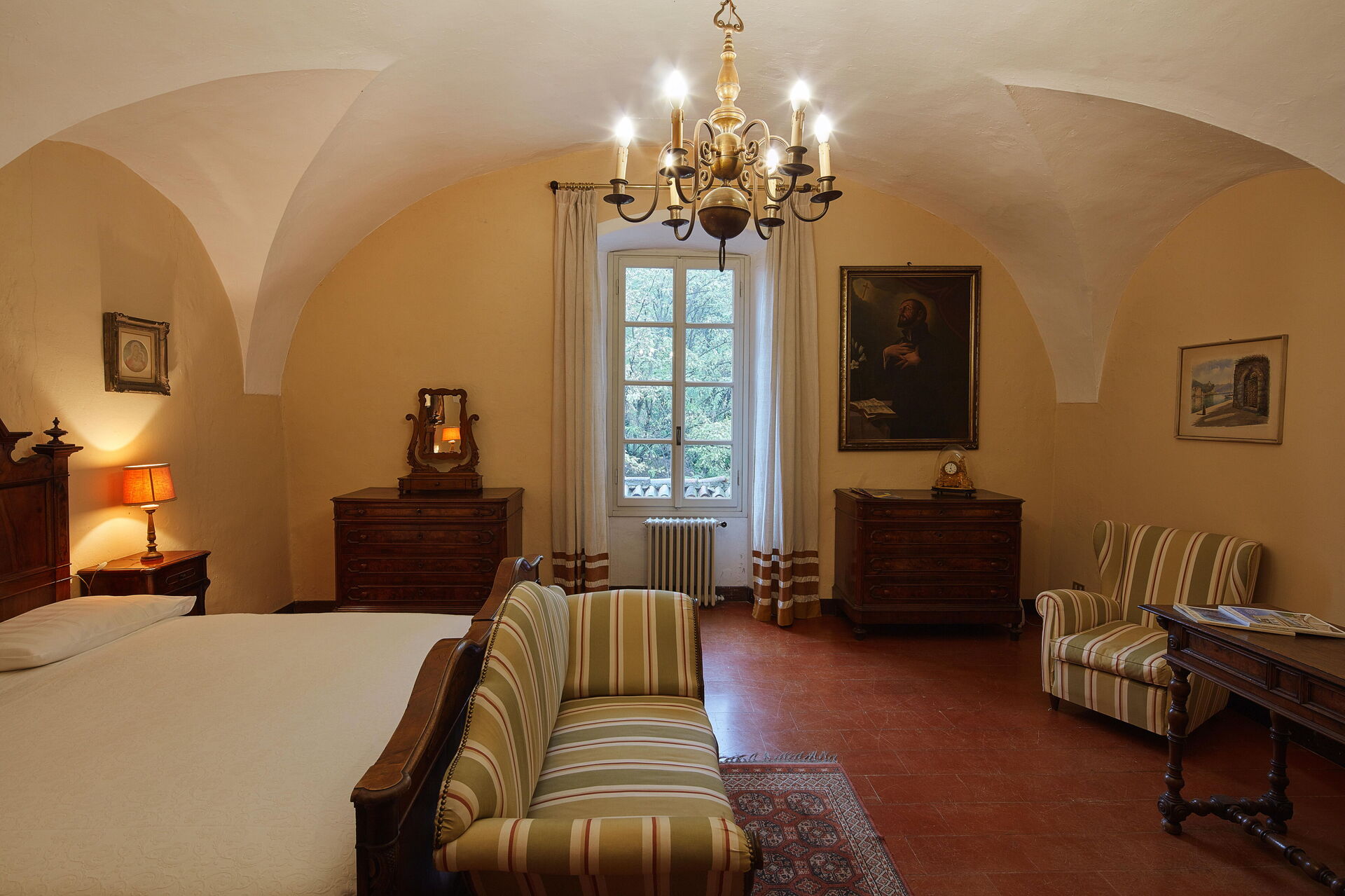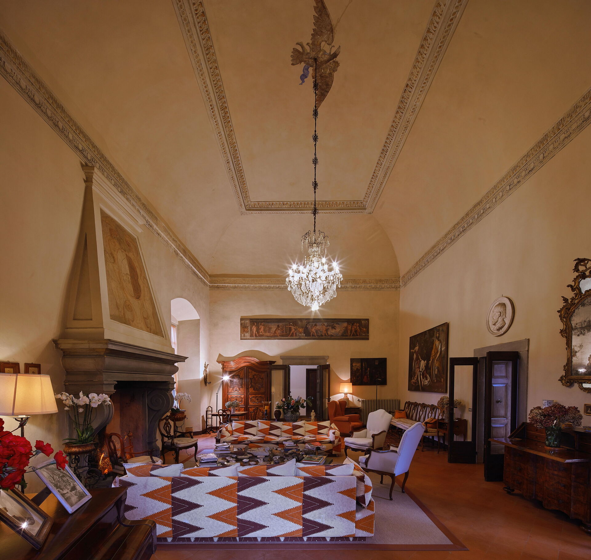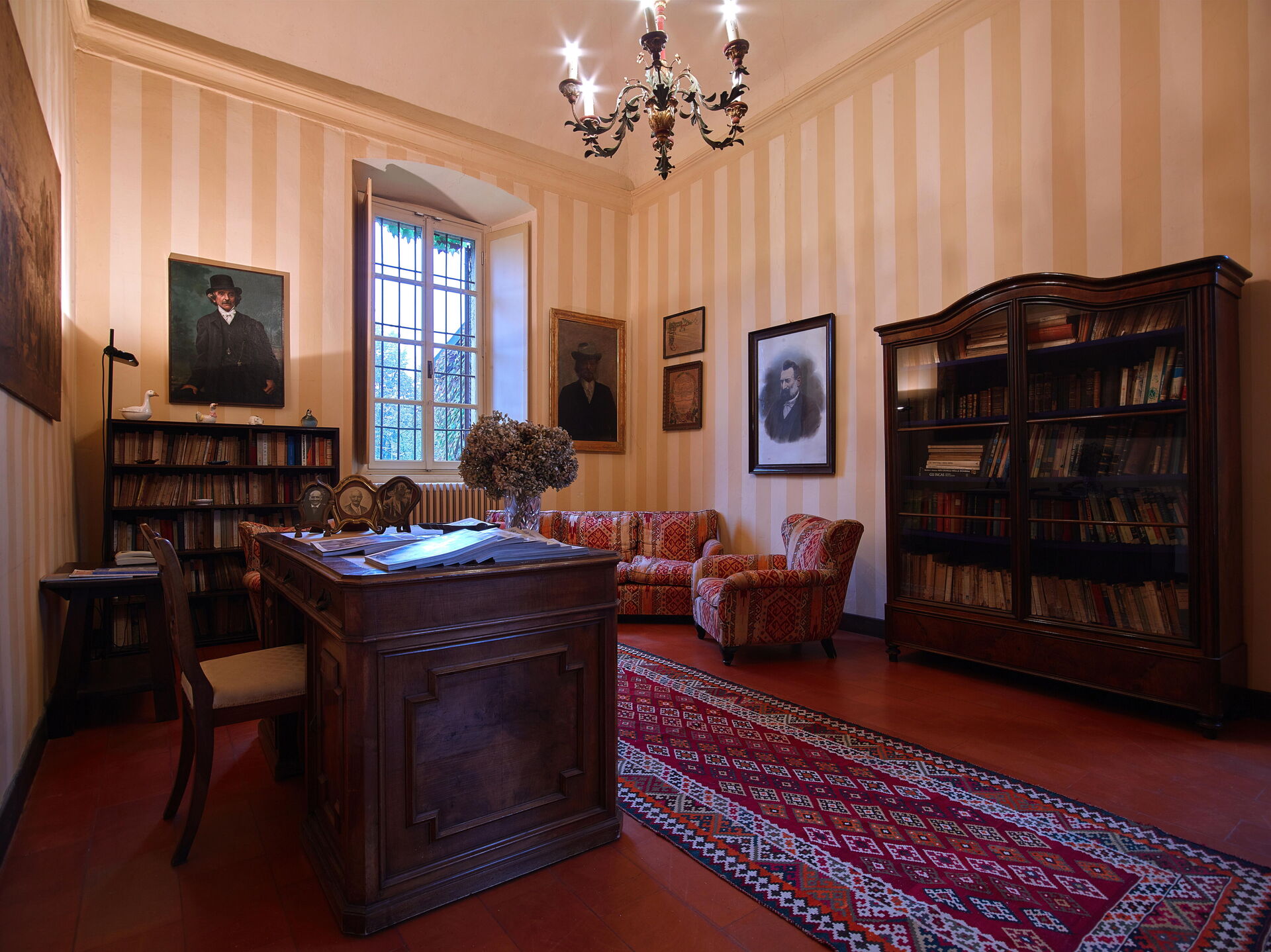 Im Erdgeschoss der Villa Franciacorta befindet sich das Hauptwohnzimmer, das mit Sesseln und Sofas eingerichtet ist, die dem Raum Stil verleihen, und in dem es auch einen Kamin gibt. Man kann sich auch in der Bibliothek entspannen, die mit einem Schreibtisch und einem Sofa ausgestattet ist. Ebenfalls im Erdgeschoss befinden sich zwei weitere Aufenthaltsräume/Arbeitszimmer. Im Erdgeschoss der Villa Franciacorta befinden sich eine große, voll ausgestattete Küche und zwei Esszimmer, die im Stil des 17. Jahrhunderts eingerichtet sind. Außerdem gibt es ein Service-Bad.