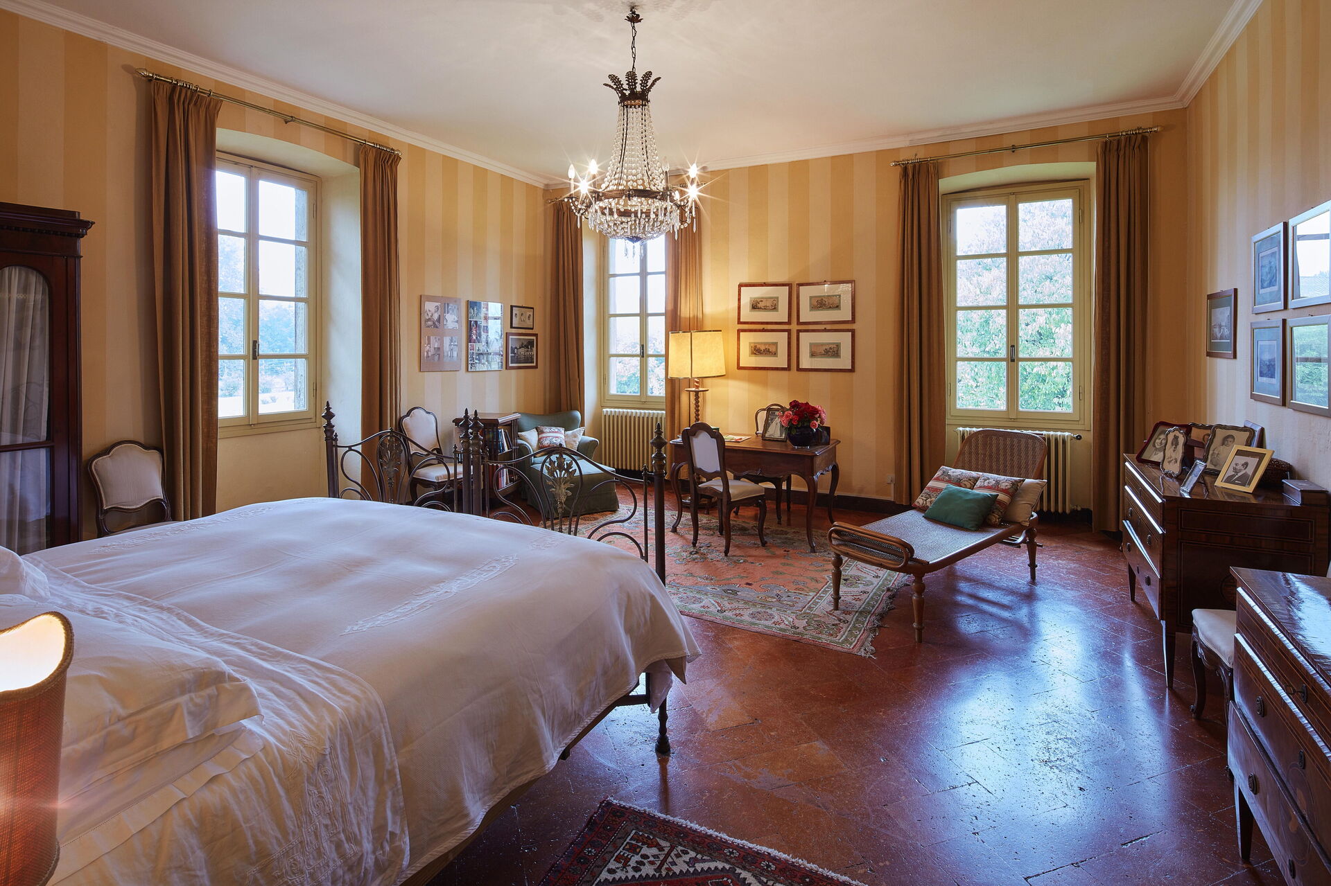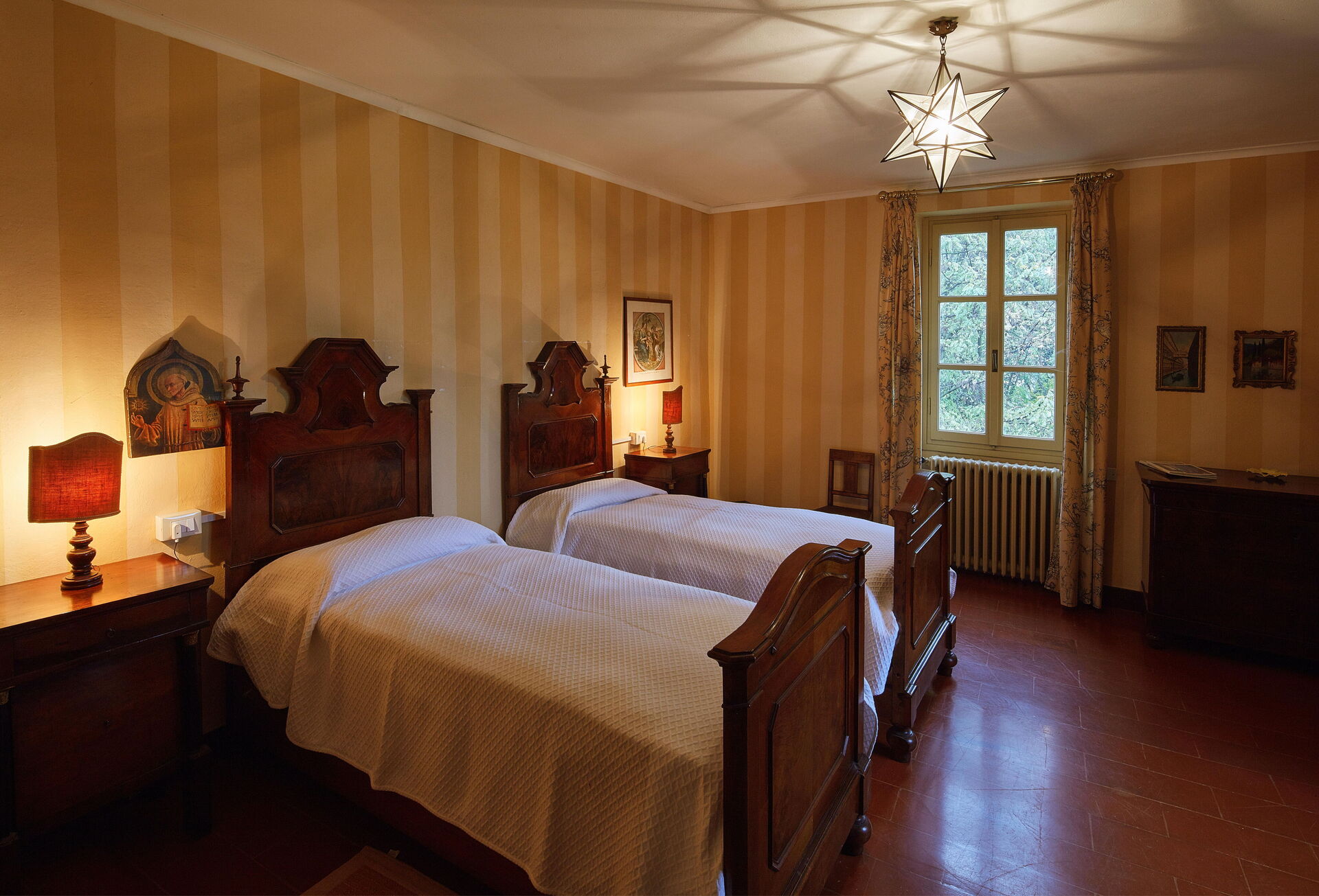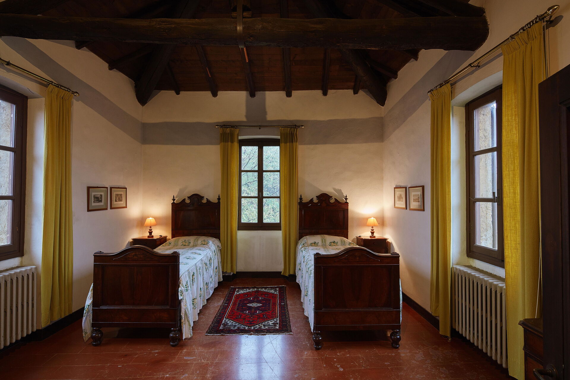 Im ersten Stock befindet sich der Schlafbereich, bestehend aus drei Doppelzimmern und zwei Zweibettzimmern mit getrennten Betten. Von diesen fünf Zimmern haben zwei ein kleines Wohnzimmer mit einem zusätzlichen Schlafsofa.