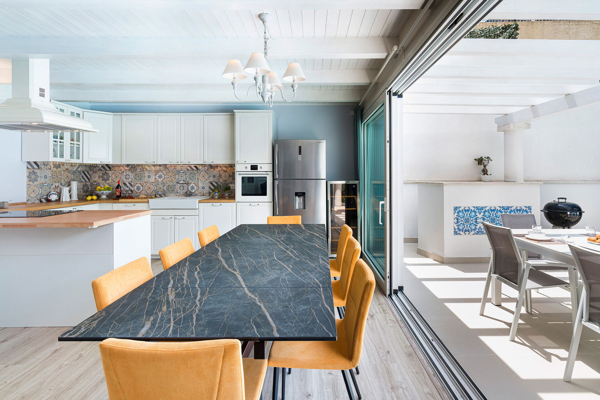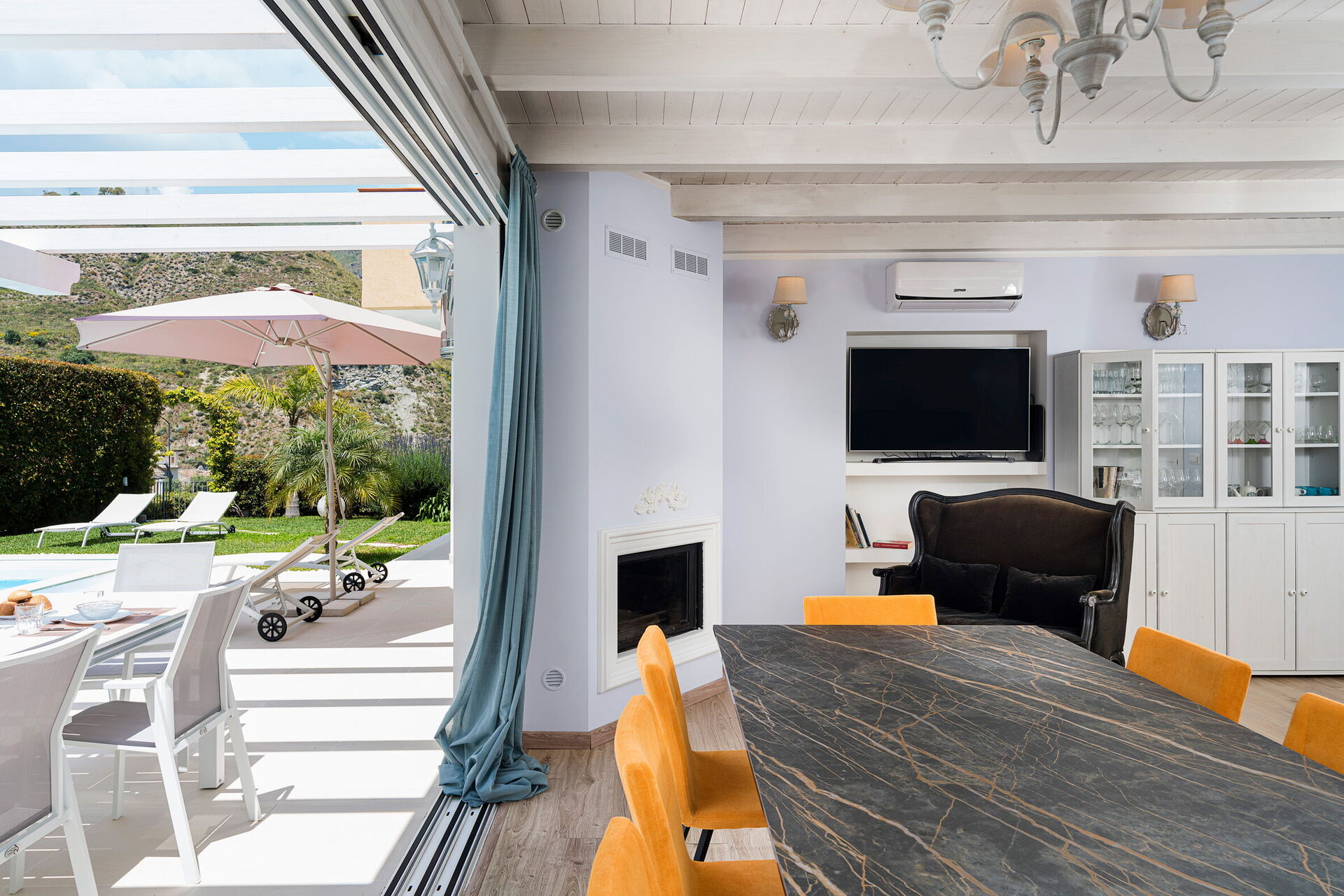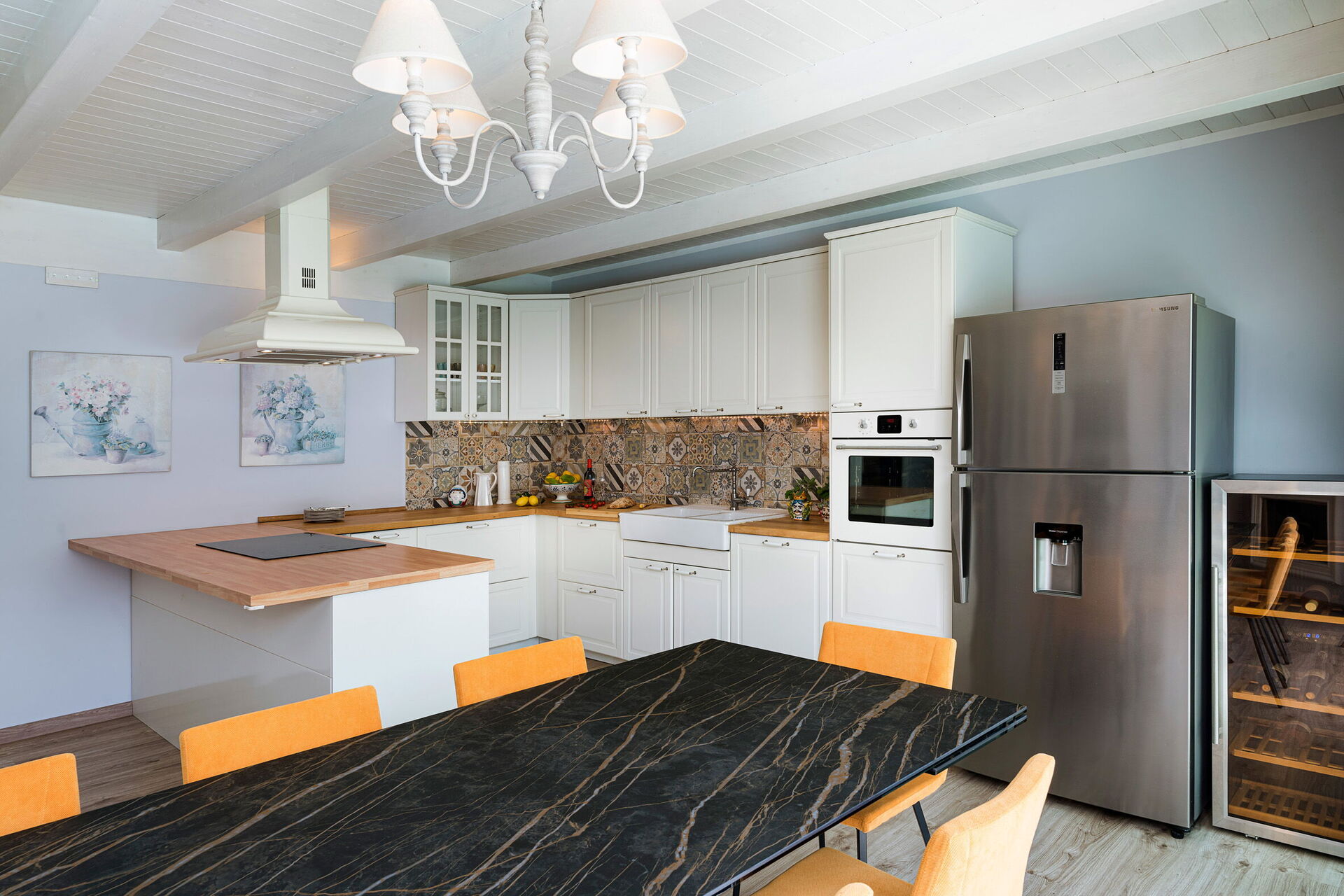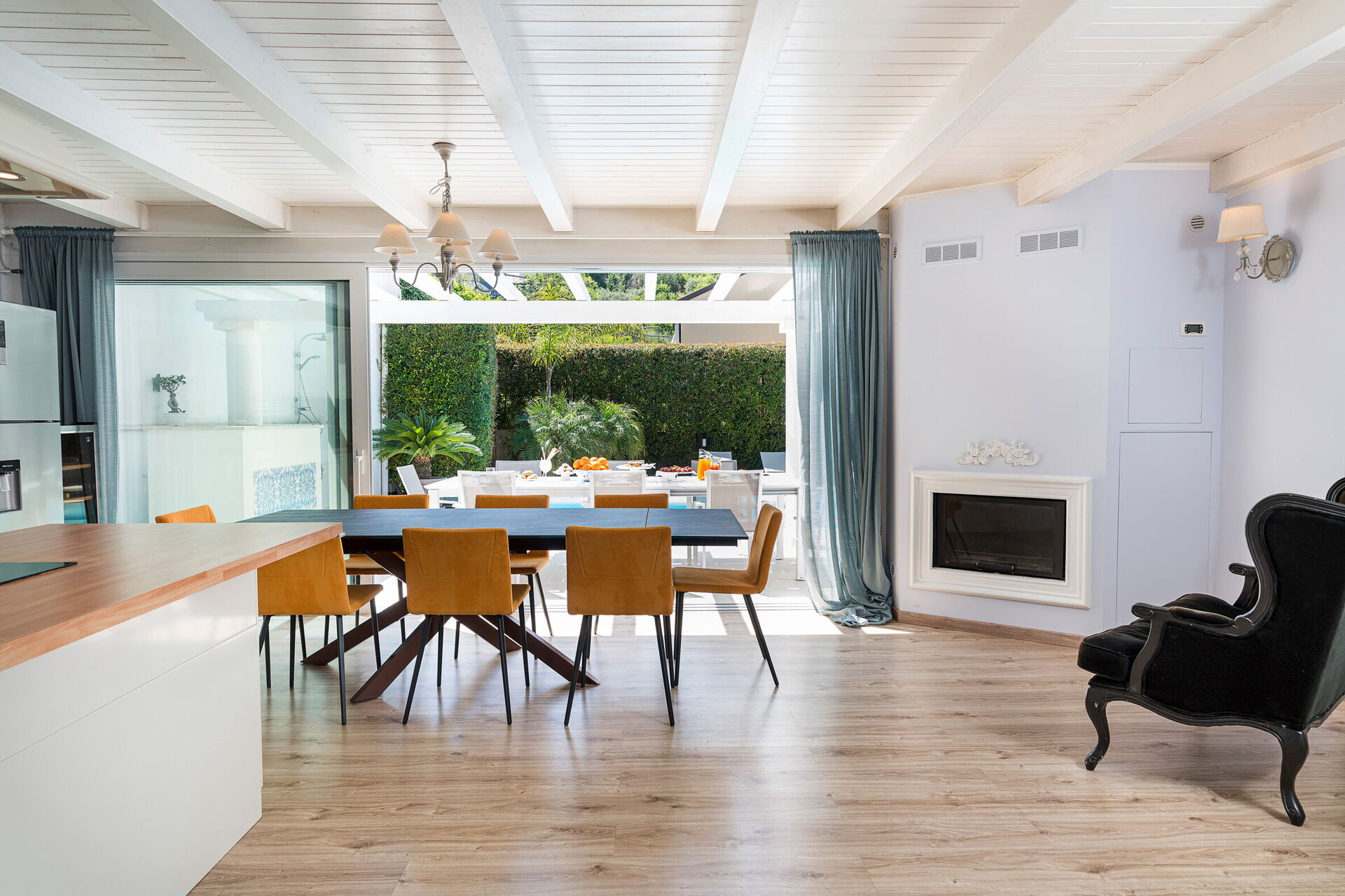 Klimaanlage, Kamin, gut ausgestattete Küche, Ofen, Tiefkühler, Kühlschrank, Internet, WiFi Internet, Spülmaschine, Amerikanische Kaffeemaschine, Mikrowelle, Herd, Rauchmelder, Kinderhochstuhl, Esstisch, Toaster, Sessel, Satelliten-TV, Ausgang auf die Terrasse