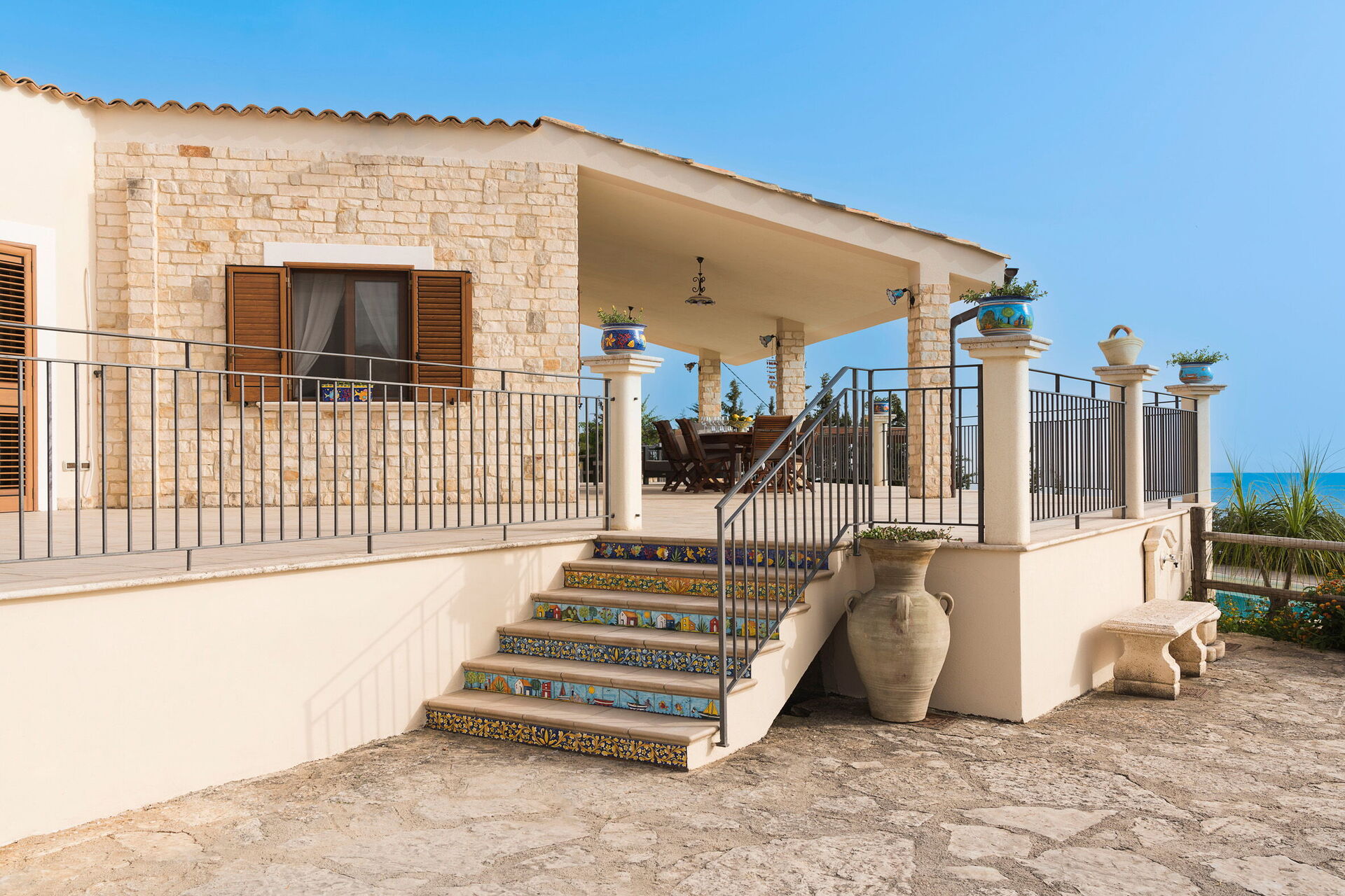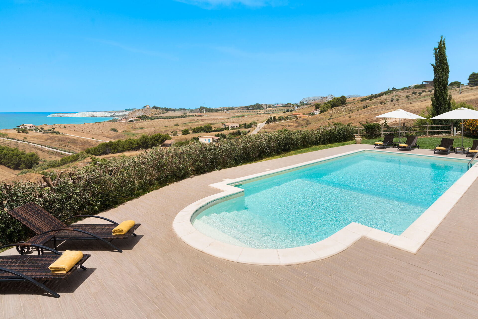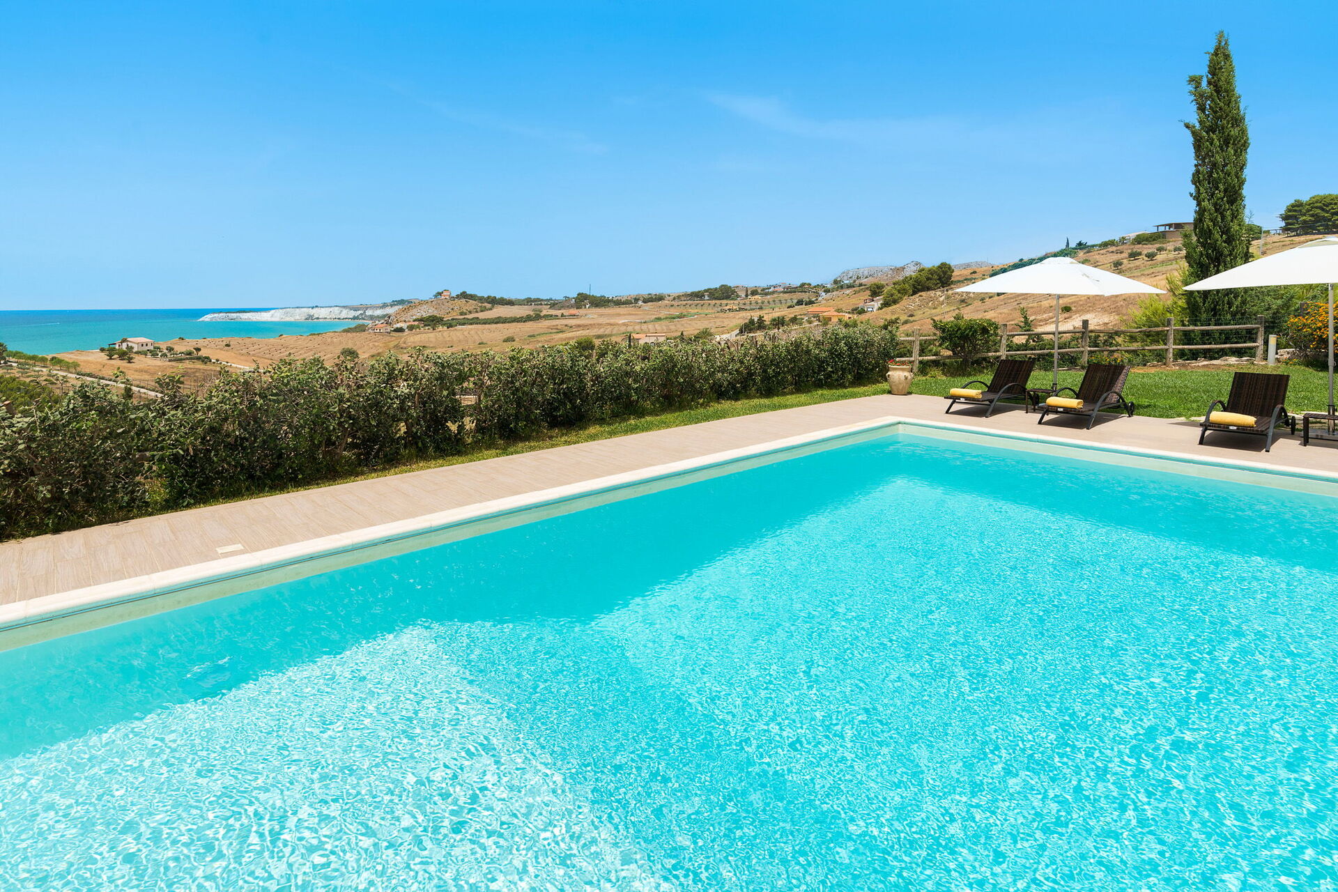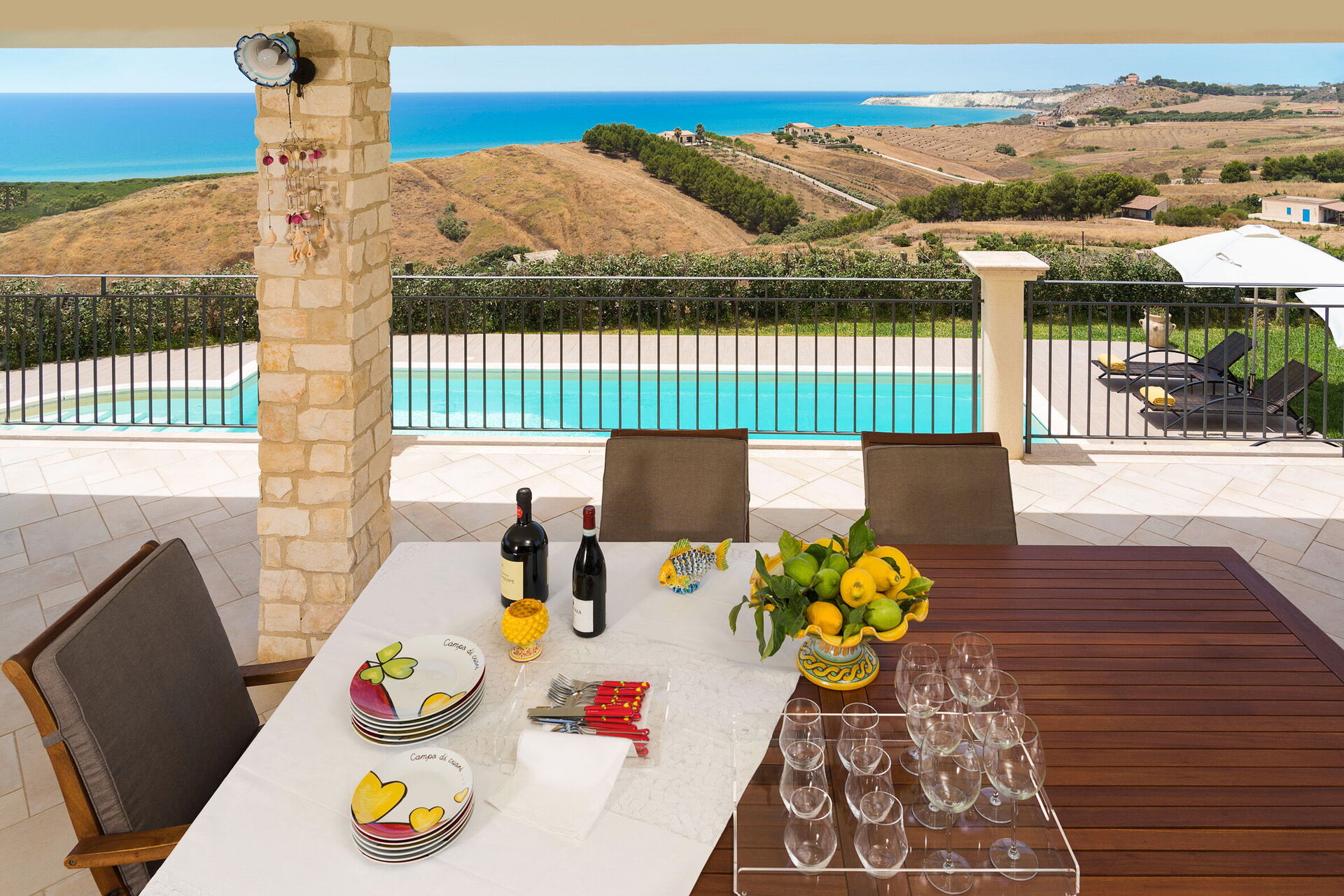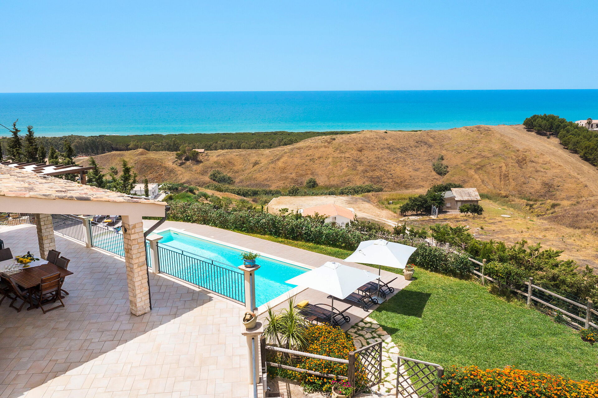 Villa Vistamare ist ein prestigeträchtiges Anwesen mit privatem Swimmingpool (5x10 m, Tiefe 1,20-2,20 m) in Panoramalage in der Nähe des Naturschutzgebiets Torre Salsa, in der Nähe von Agrigento, im Süden Siziliens. Die Villa erstreckt sich über das Erdgeschoss und verfügt über große Terrassen zum Entspannen im Freien. Sie liegt nur 700 Meter vom Sandstrand von Bovo Marina entfernt, einem der schönsten und unberührtesten an der Südküste Siziliens. Ideale Lage für einen erholsamen Urlaub am Meer und gleichzeitig ein hervorragender Ausgangspunkt für die Erkundung der Schönheit Südsiziliens. Zu den nahe gelegenen Sehenswürdigkeiten zählen die Strände und Naturschutzgebiete Torre Salsa und Foce del Fiume Platani, die Klippen der Scala dei Turchi, das berühmte Tal der Tempel von Agrigent sowie die Städte Sciacca und Selinunte.
