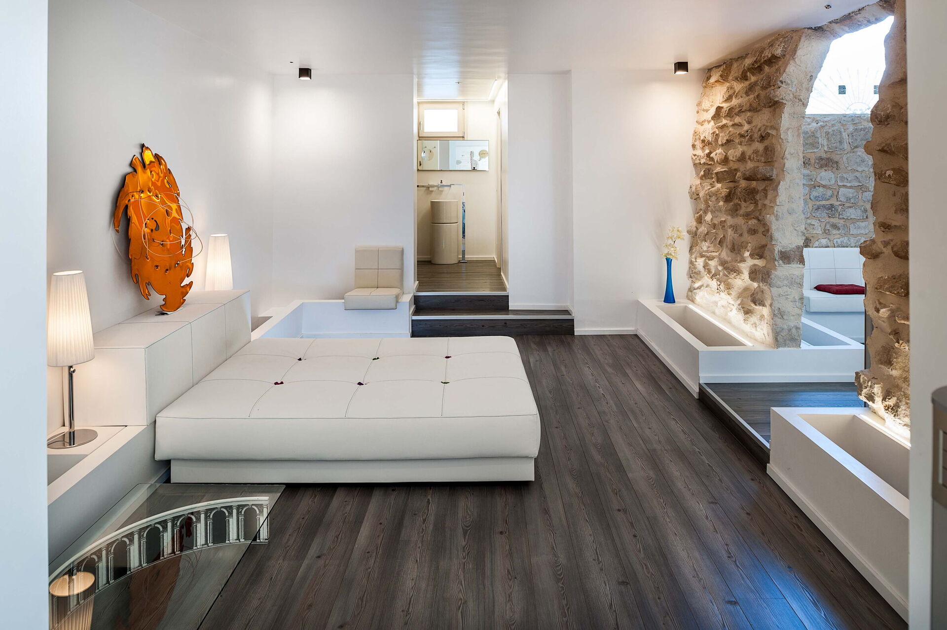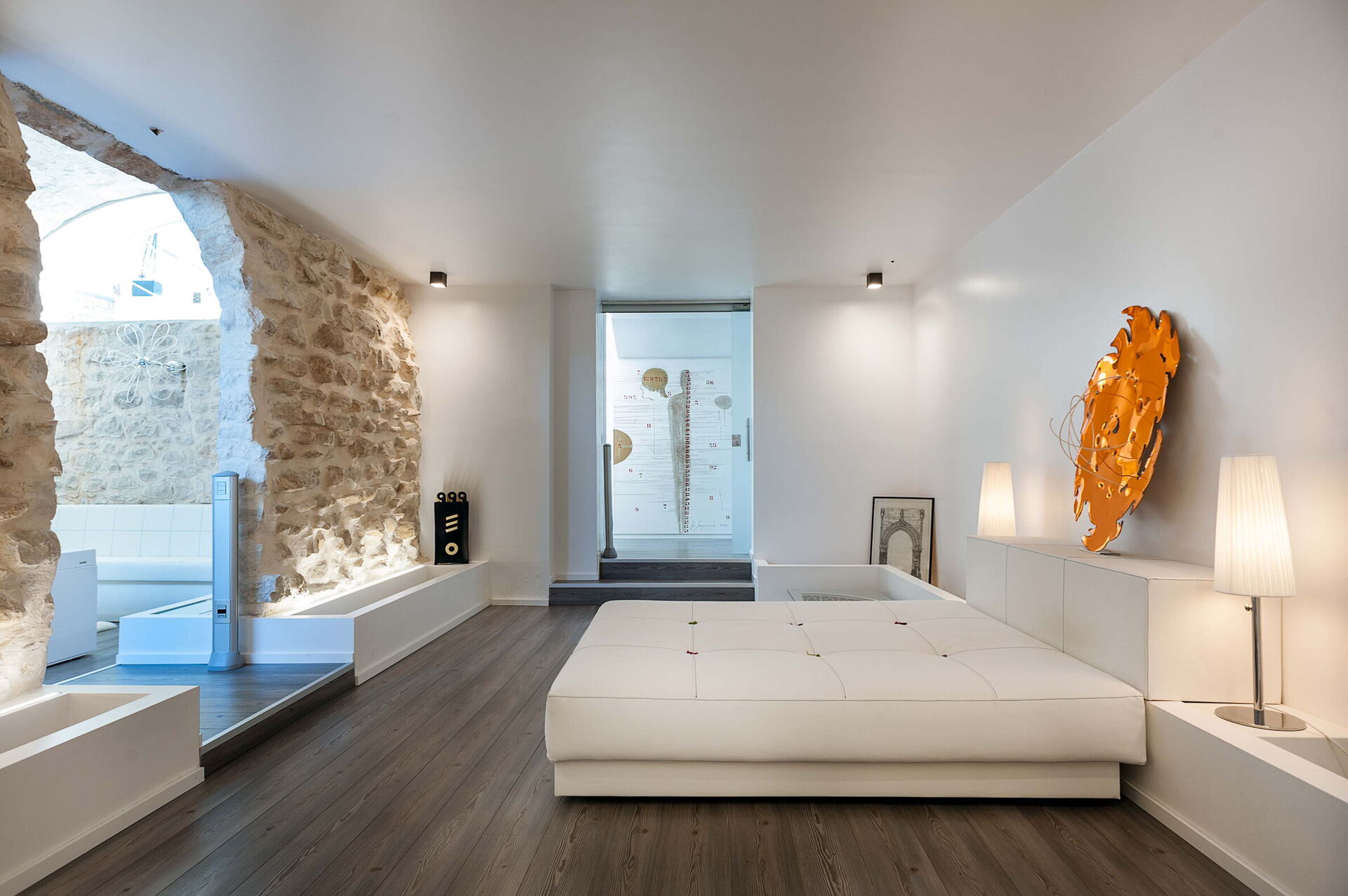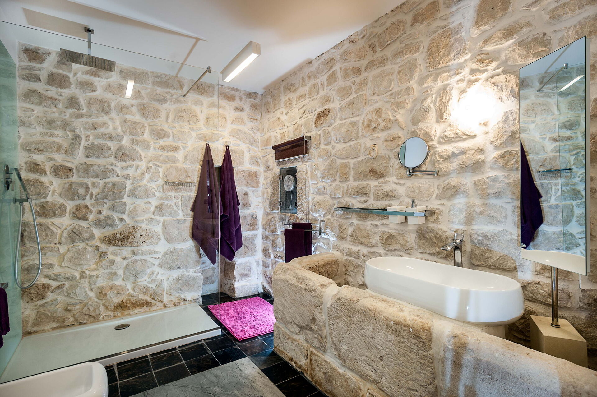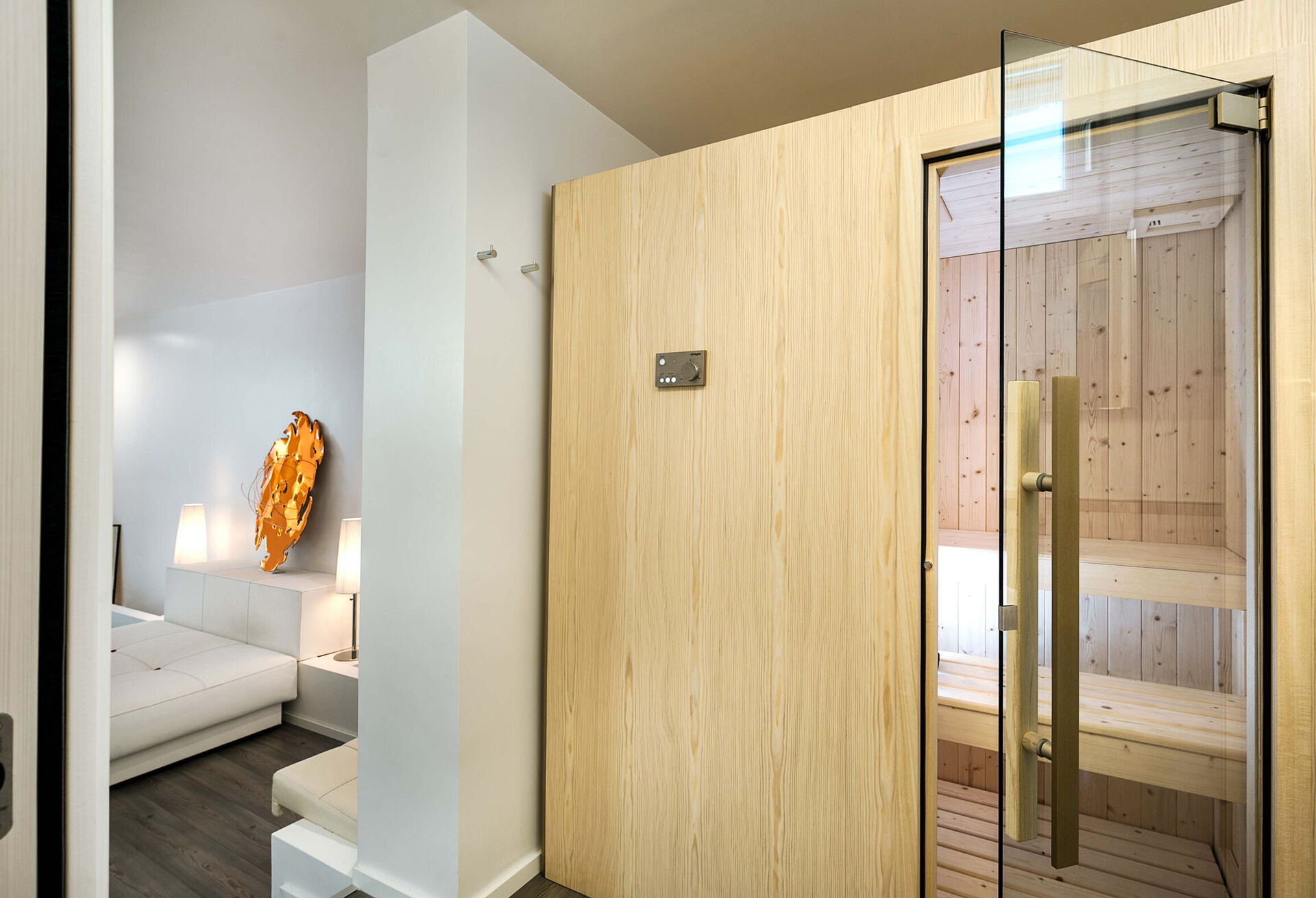 Erdgeschoss: großes Wohnzimmer, Küche, 3 Doppelzimmer mit Bad mit Dusche. Untergeschoss: Wellnessbereich (Sauna, Hydromassagewanne, 1 Badezimmer mit Dusche). Anhang: 1 Doppelzimmer mit Bad mit Dusche.