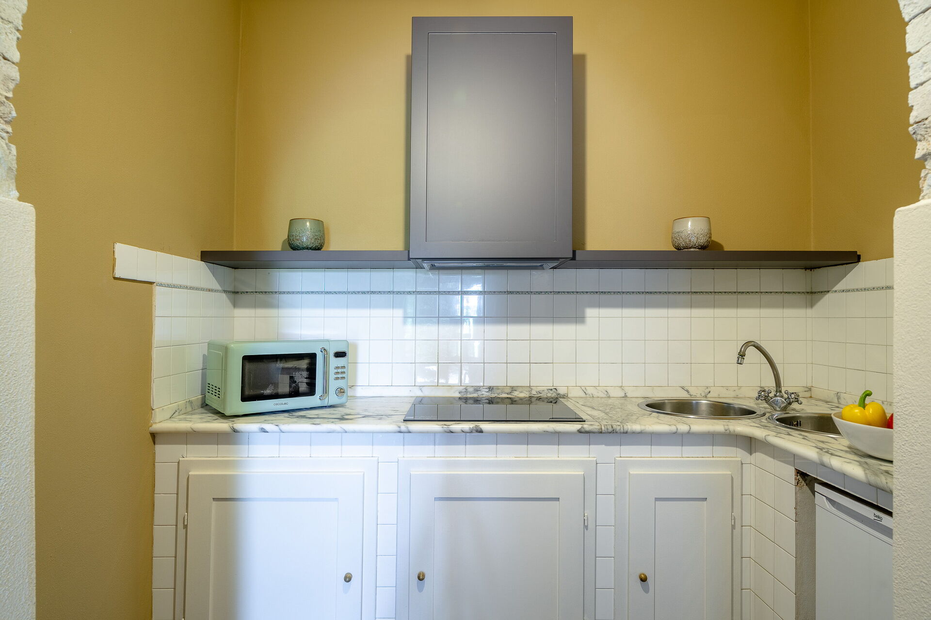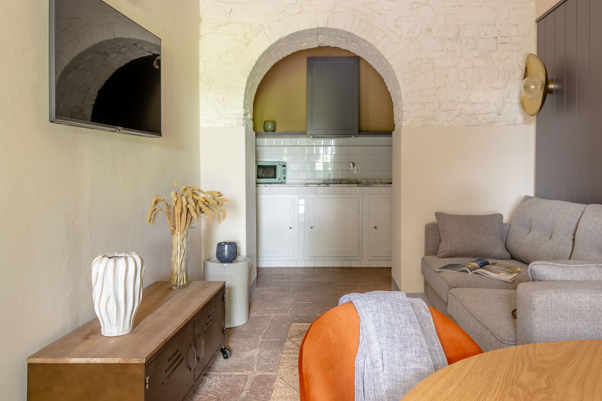 Der Eingangsbereich öffnet sich zu einem hellen Wohnzimmer mit Smart-TV, das sich perfekt zum Entspannen oder für Unterhaltungszwecke eignet. Die separate, voll ausgestattete Küche verfügt über einen Induktionsherd und ist ideal für alle, die auch im Urlaub gerne kochen. Der Schlafbereich umfasst ein gemütliches Doppelzimmer, das ebenfalls mit einem Smart-TV ausgestattet ist, während das moderne Badezimmer über eine komfortable Dusche verfügt. Eine funktionale und gut eingerichtete Umgebung, die für maximalen Komfort zu jeder Jahreszeit konzipiert ist.