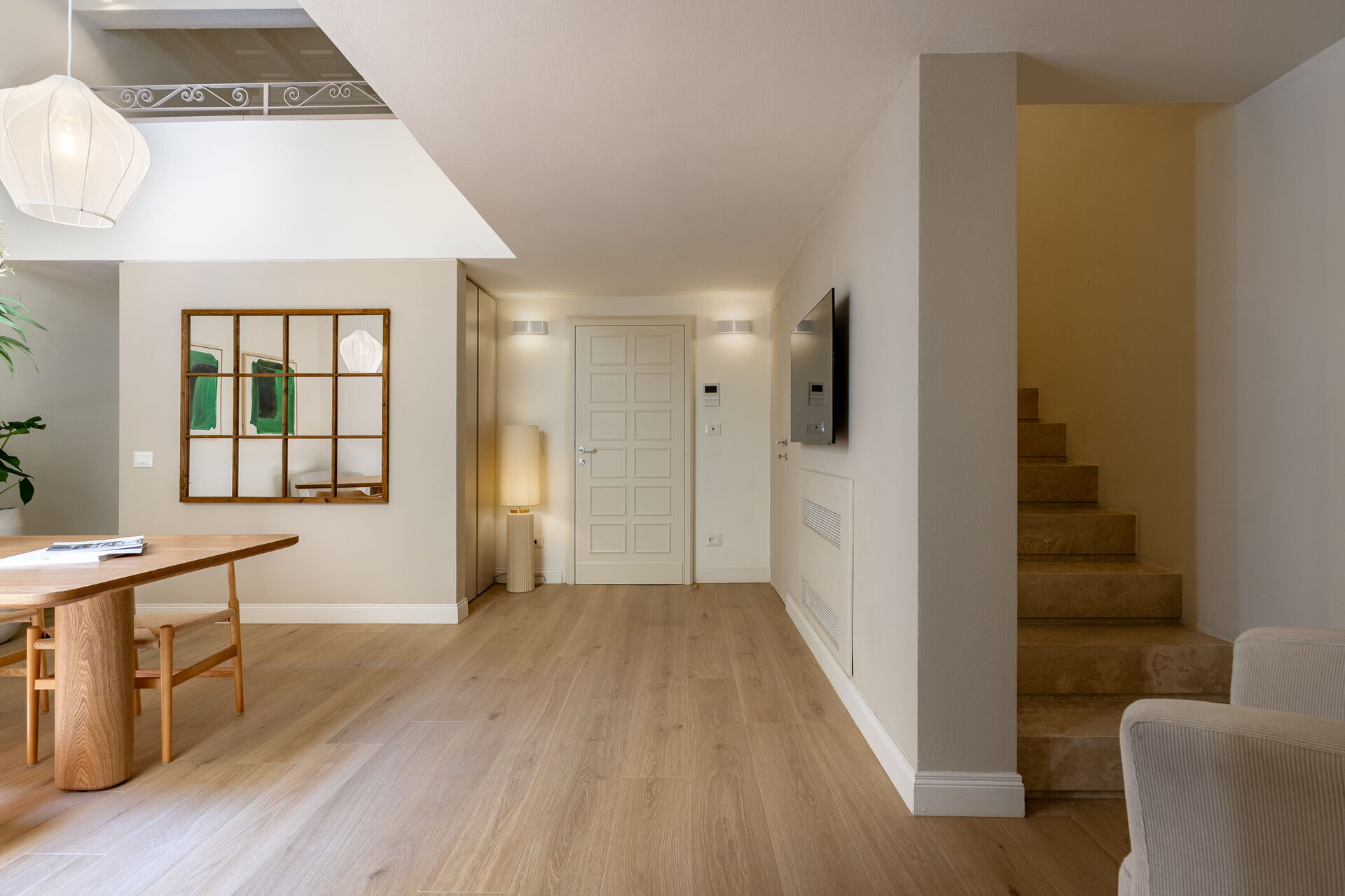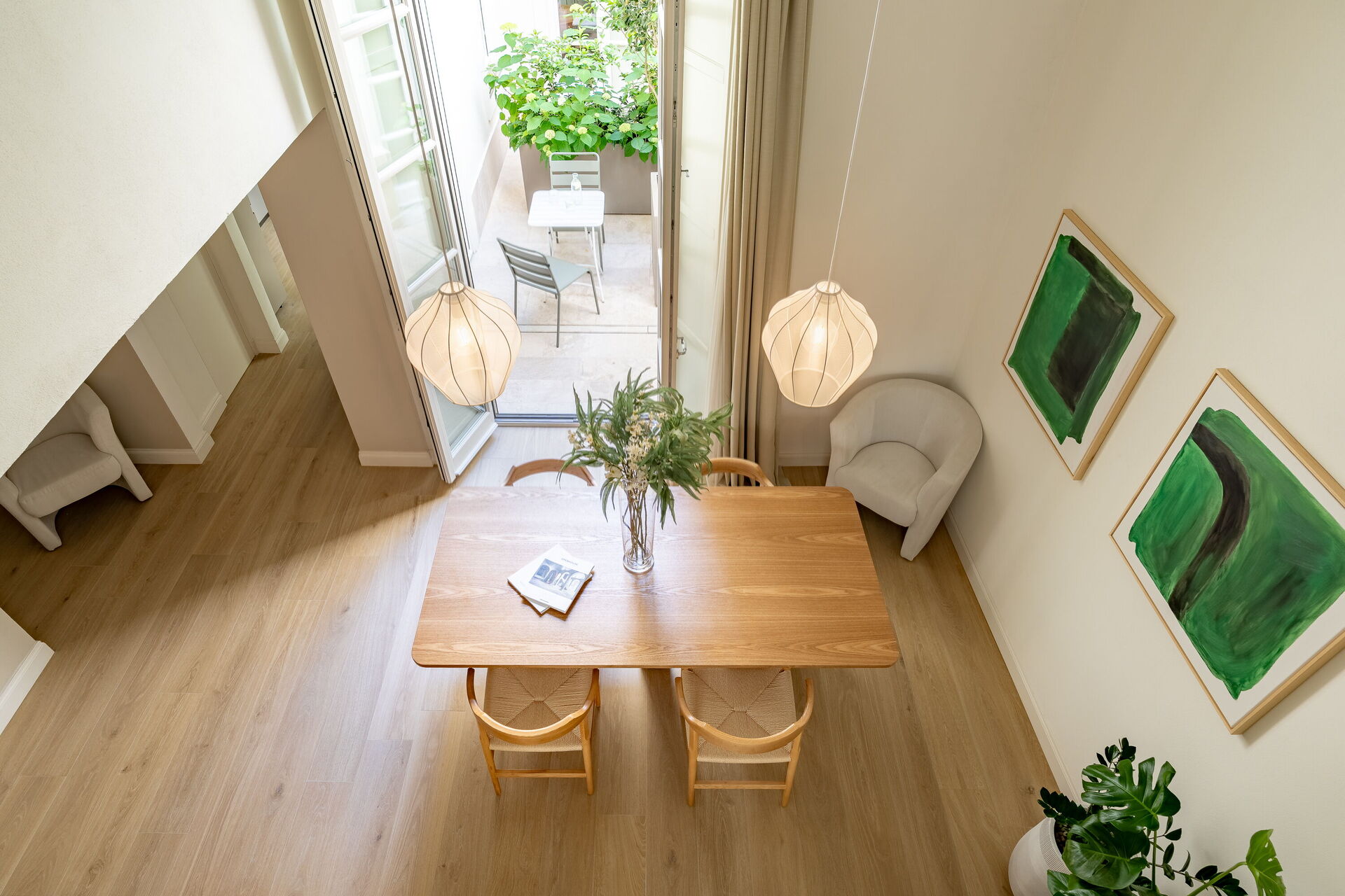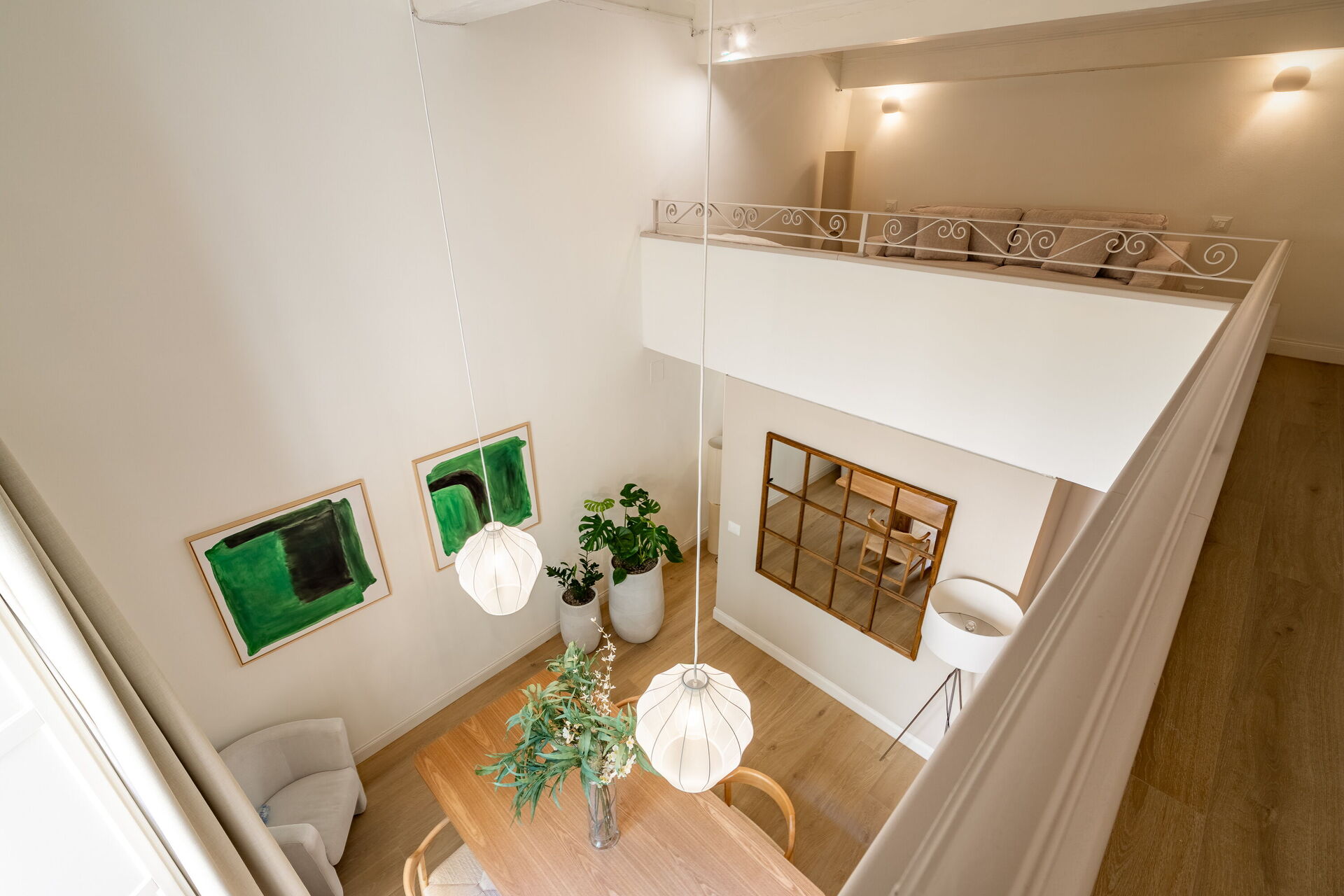 Wohnung auf zwei Ebenen, bestehend aus einem hellen Wohnzimmer mit kleinem Garten, Küche, Mezzanin mit Schlafsofa, Schlafzimmer mit Doppelbett, Bad