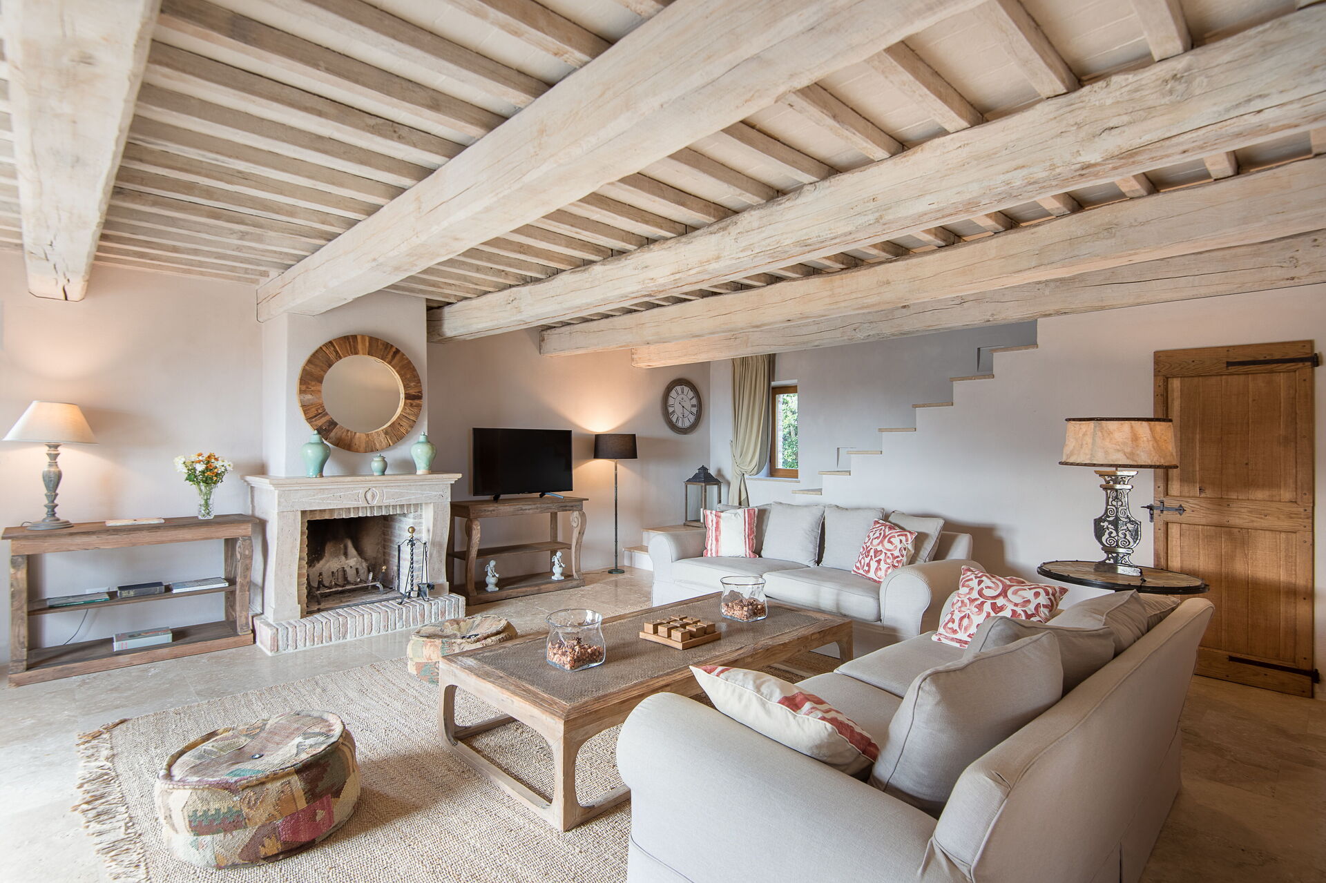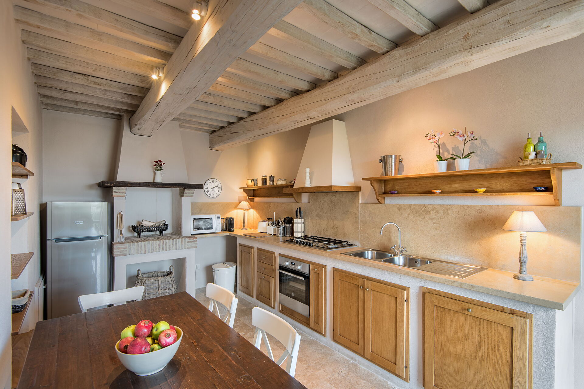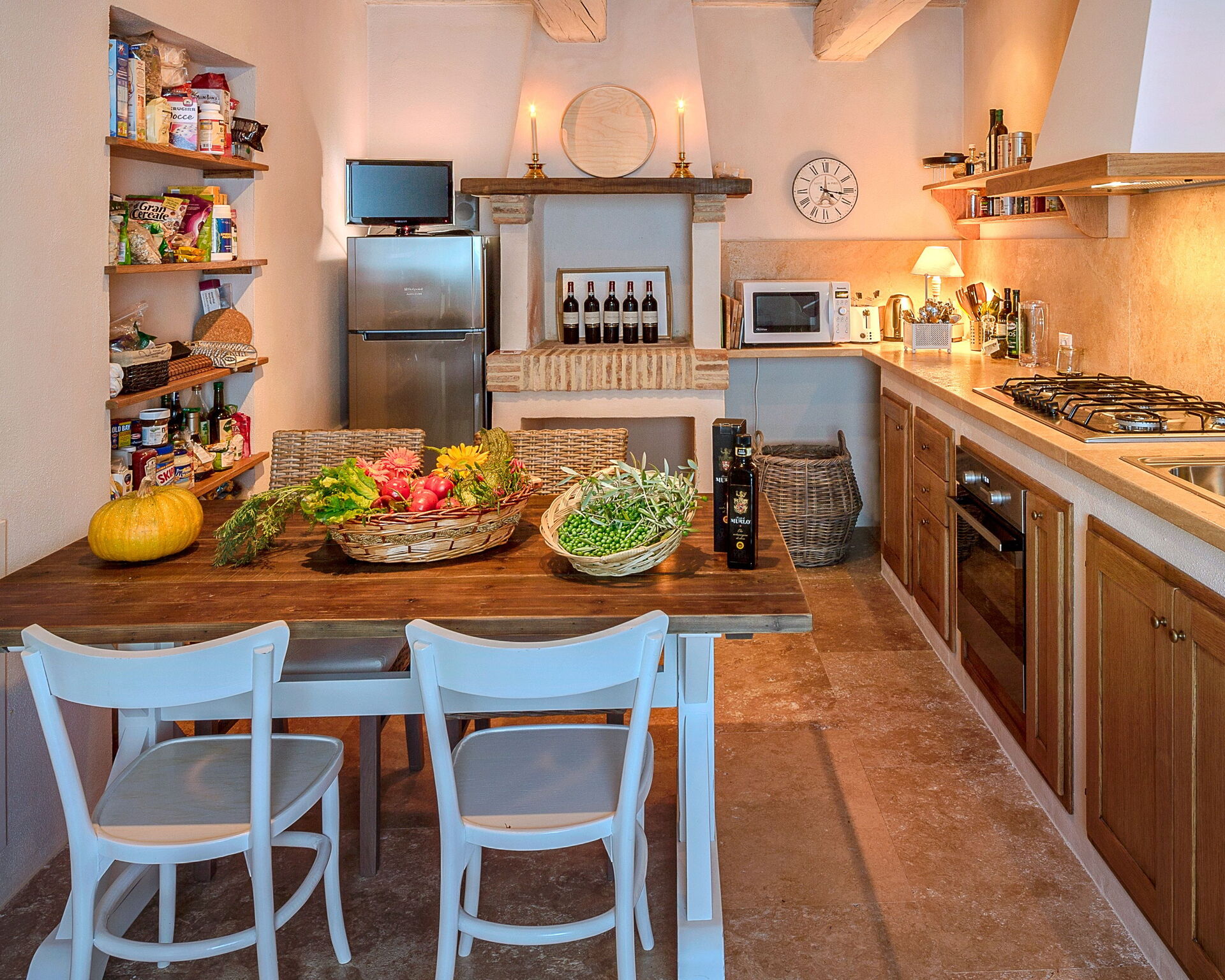 Villa Santa Croce verfügt über ein geräumiges Wohnzimmer mit einem Kamin, Sofas und einem Ausgang ins Freie. Für Unterhaltung sorgen ein SMART-TV mit Flachbildschirm und Satellitenkanälen, ein DVD-Player und ein Bluetooth-Musikplayer. Eine voll ausgestattete Küche mit zwei Kühlschränken, einem Ofen und einer Mikrowelle.