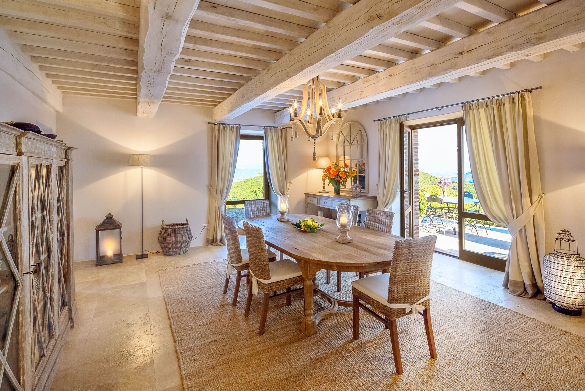 Am Tisch direkt vor der Küche mit Blick auf den Pool können Sie ein köstliches Frühstück genießen. Für ein Abendessen bei Sonnenuntergang unter der romantischen Pergola gibt es einen großen Tisch für 8 Personen.