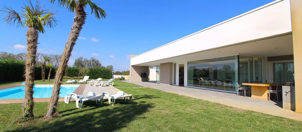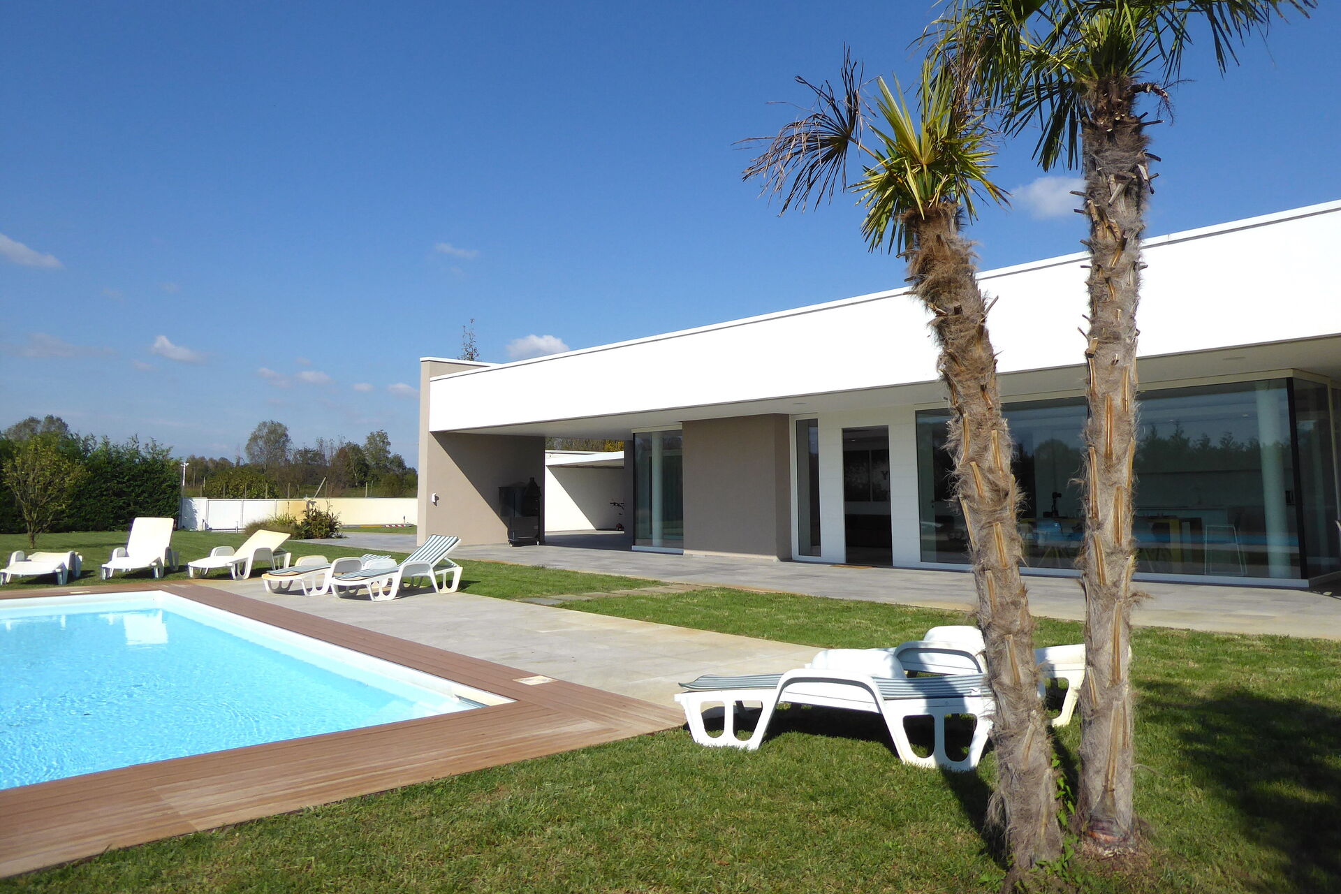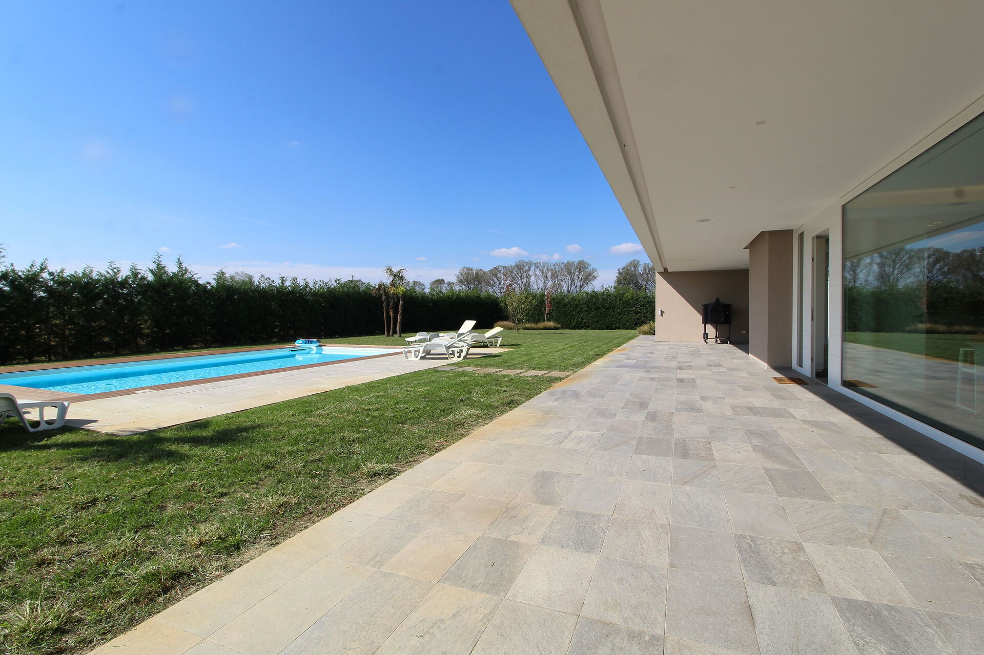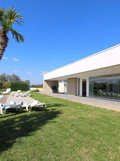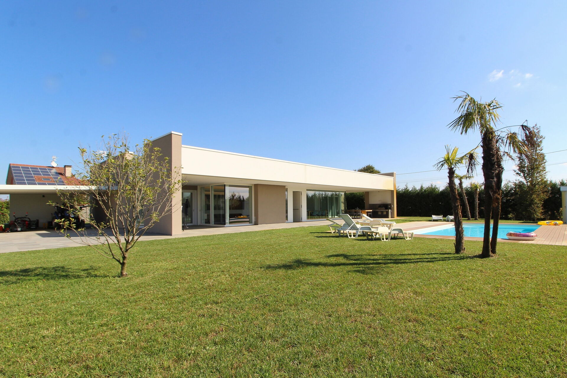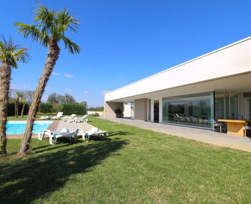 Freistehende Designervilla mit privatem Pool und komplett eingezäuntem Garten. Die Villa erstreckt sich über eine Etage und zeichnet sich durch große Fenster mit Blick auf den Garten und den ein Salz Swimmingpool aus (4,5 x 9 1,35mt). Die Lage im Grünen, mit Blick auf die Euganeischen Hügel, garantiert Ruhe und Frieden für die Gäste, die den Garten und den Pool in absoluter Privatsphäre genießen können. Die Villa verfügt über eine große Veranda von 120 Quadratmetern, unter der man nach dem Grillen gemütlich zu Abend essen kann, mit einem Soundsystem, das von jedem mobilen Gerät über Bluetooth verbunden werden kann.