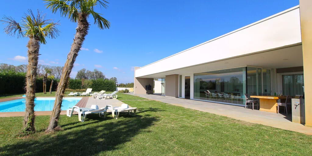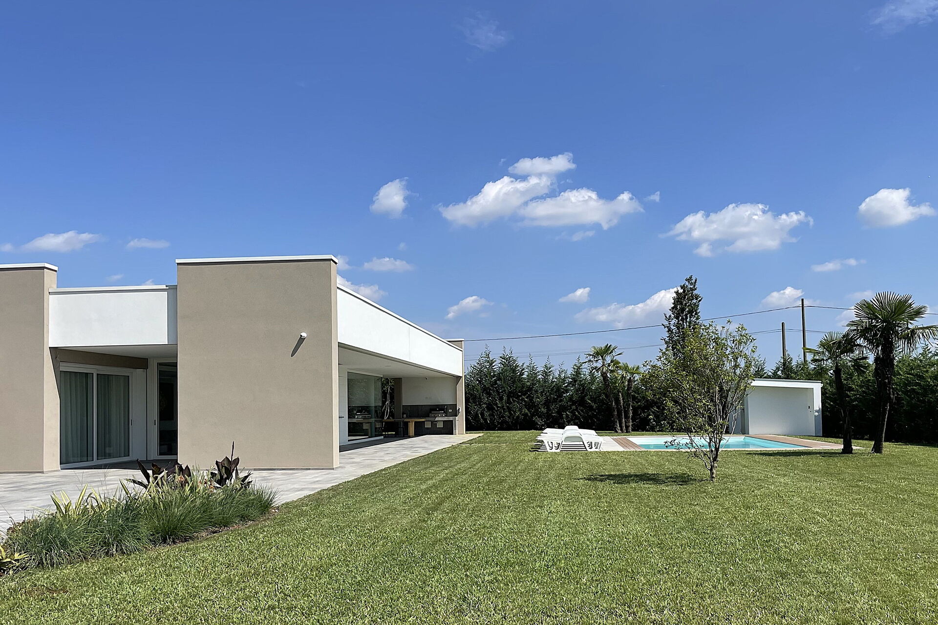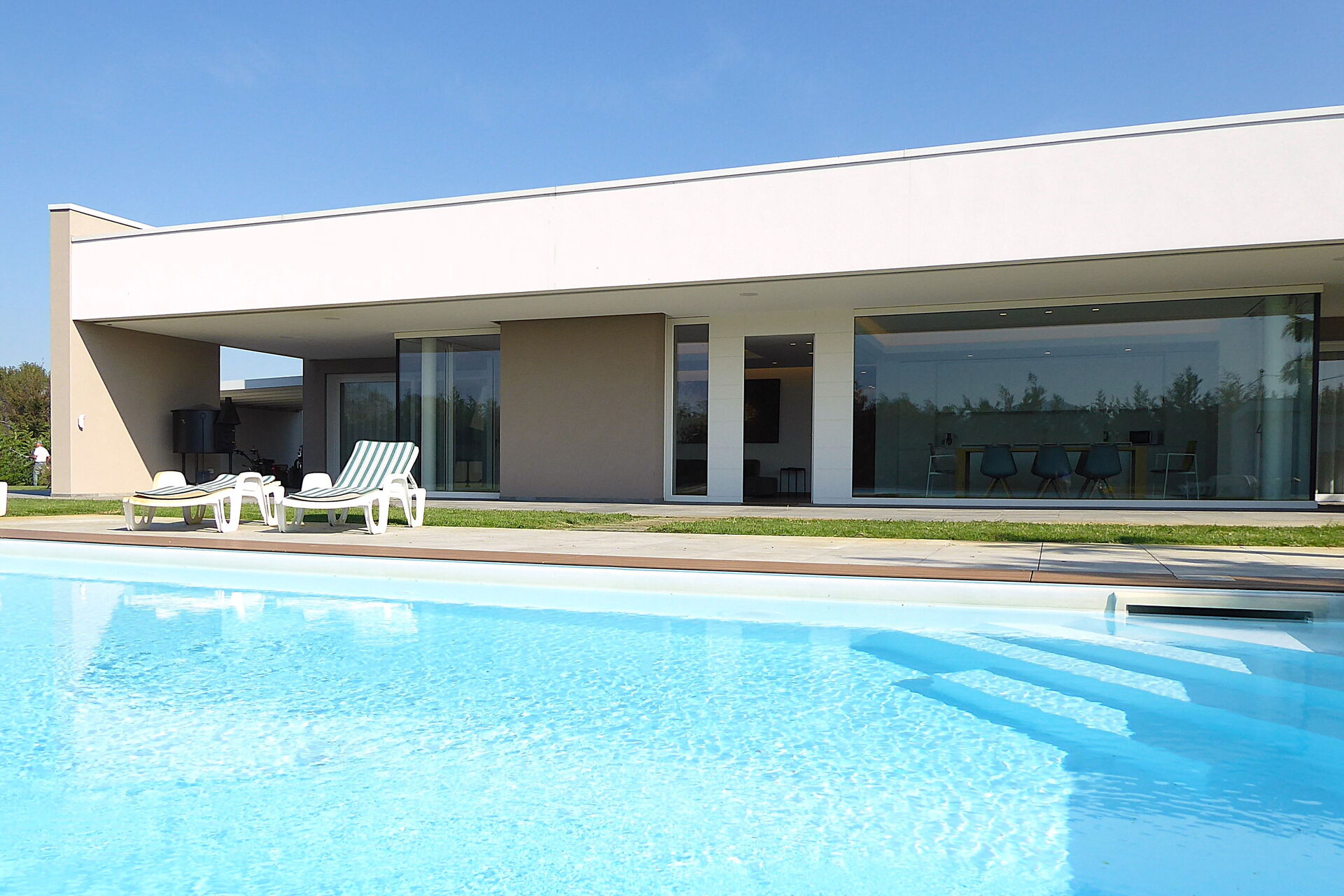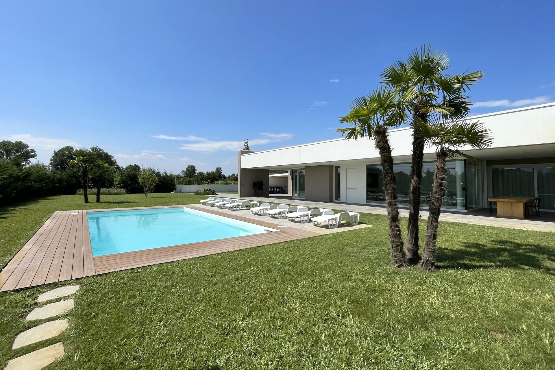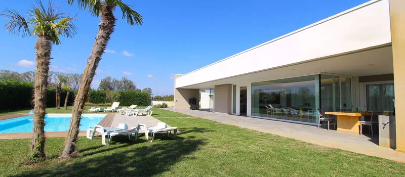 Freistehende Designervilla mit privatem Pool und komplett eingezäuntem Garten. Die Villa erstreckt sich über eine Etage und zeichnet sich durch große Fenster mit Blick auf den Garten und den ein Salz Swimmingpool aus (4,5 x 9 1,35mt). Die Lage im Grünen, mit Blick auf die Euganeischen Hügel, garantiert Ruhe und Frieden für die Gäste, die den Garten und den Pool in absoluter Privatsphäre genießen können. Die Villa verfügt über eine große Veranda von 120 Quadratmetern, unter der man nach dem Grillen gemütlich zu Abend essen kann, mit einem Soundsystem, das von jedem mobilen Gerät über Bluetooth verbunden werden kann.