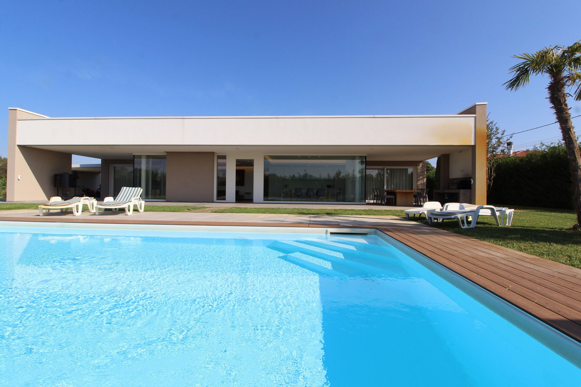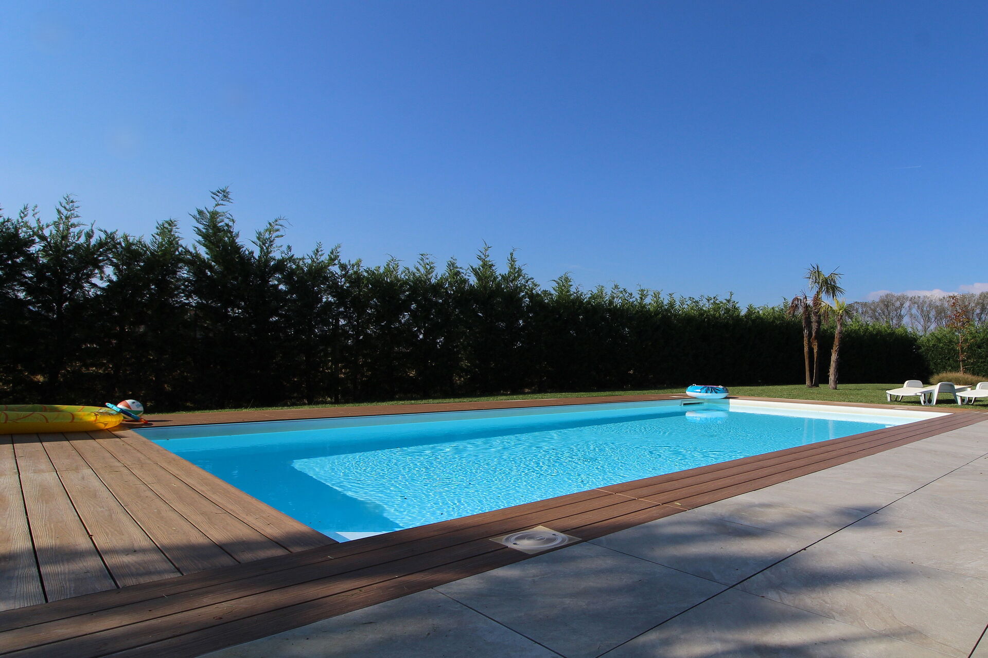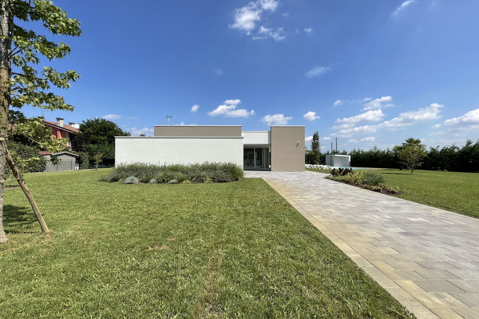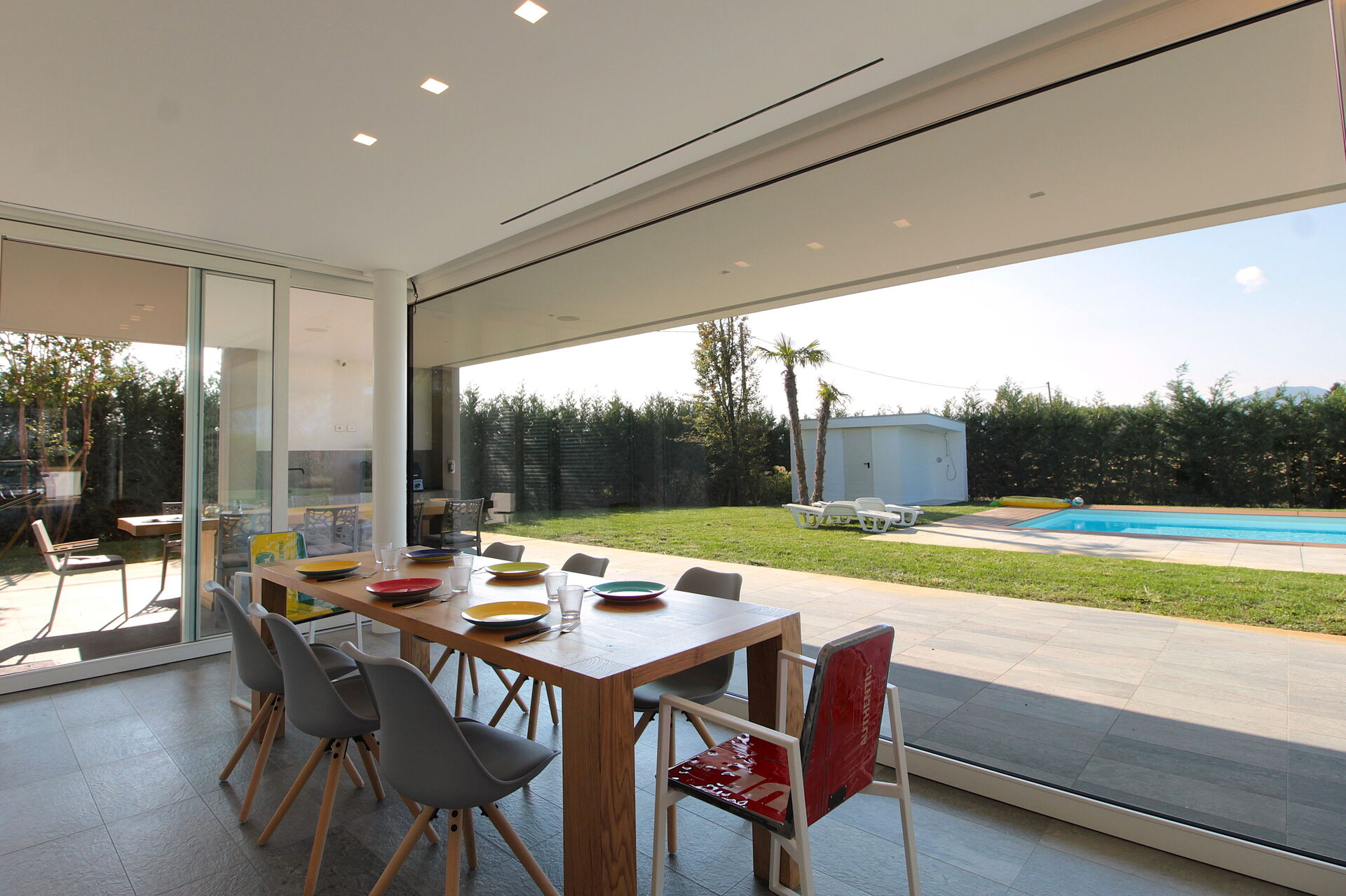 Freistehende Designervilla mit privatem Pool und komplett eingezäuntem Garten. Die Villa erstreckt sich über eine Etage und zeichnet sich durch große Fenster mit Blick auf den Garten und den ein Salz Swimmingpool aus (4,5 x 9 1,35mt). Die Lage im Grünen, mit Blick auf die Euganeischen Hügel, garantiert Ruhe und Frieden für die Gäste, die den Garten und den Pool in absoluter Privatsphäre genießen können. Die Villa verfügt über eine große Veranda von 120 Quadratmetern, unter der man nach dem Grillen gemütlich zu Abend essen kann, mit einem Soundsystem, das von jedem mobilen Gerät über Bluetooth verbunden werden kann.