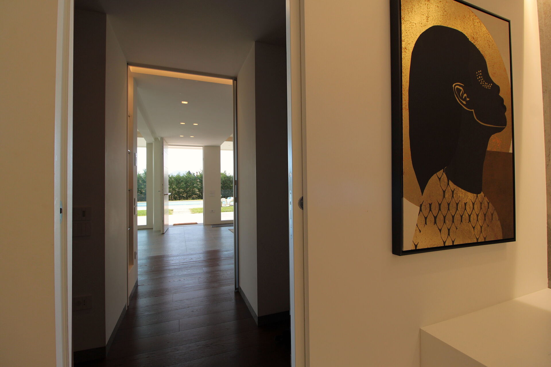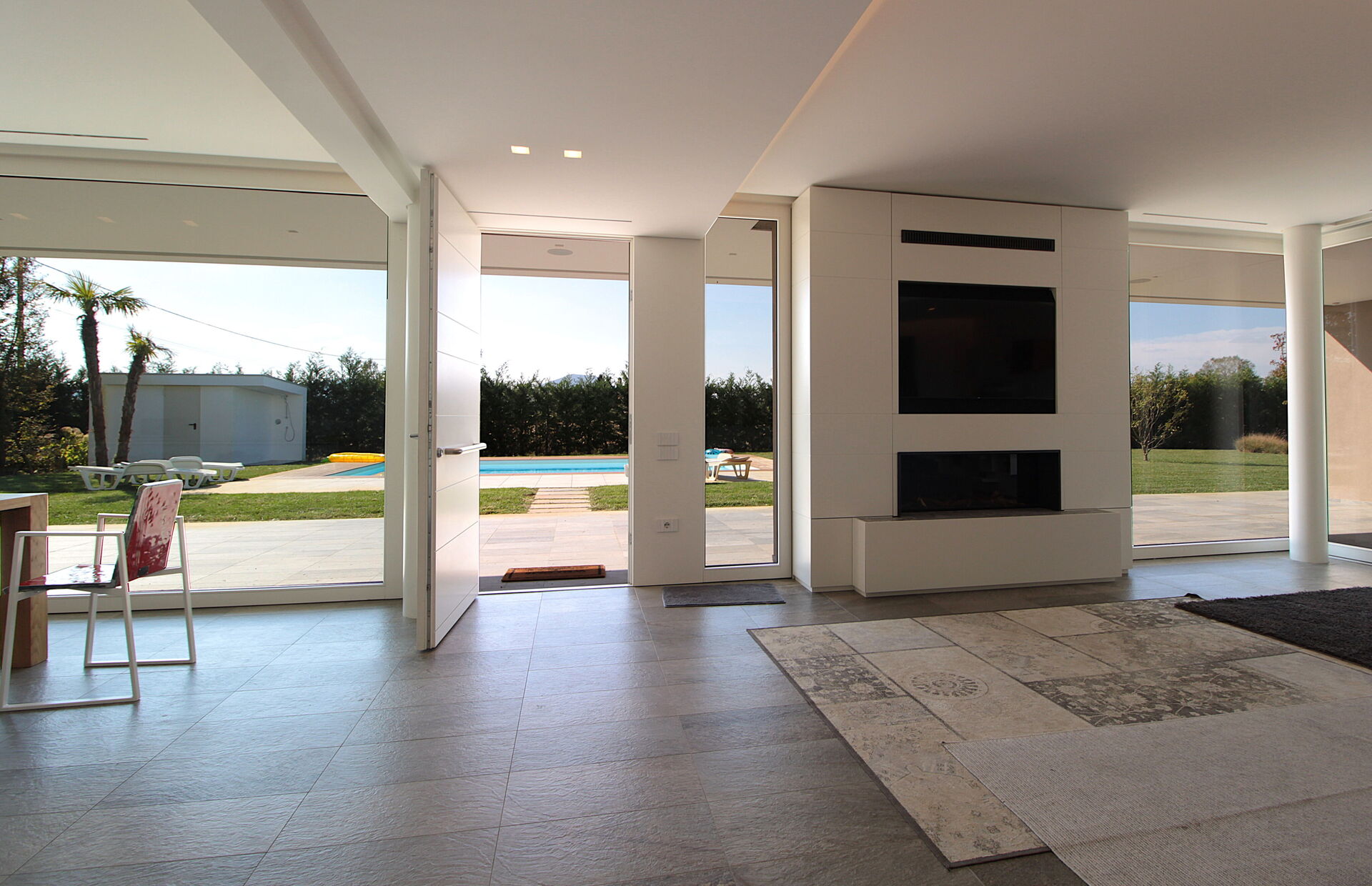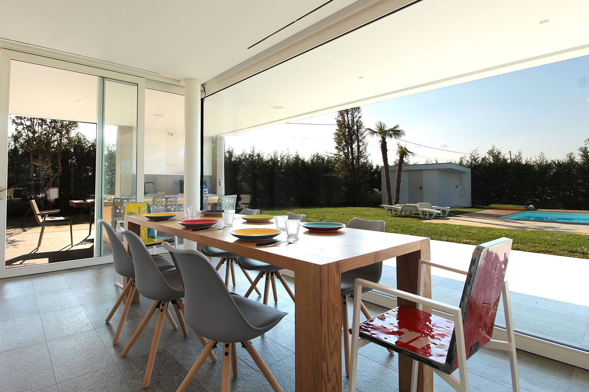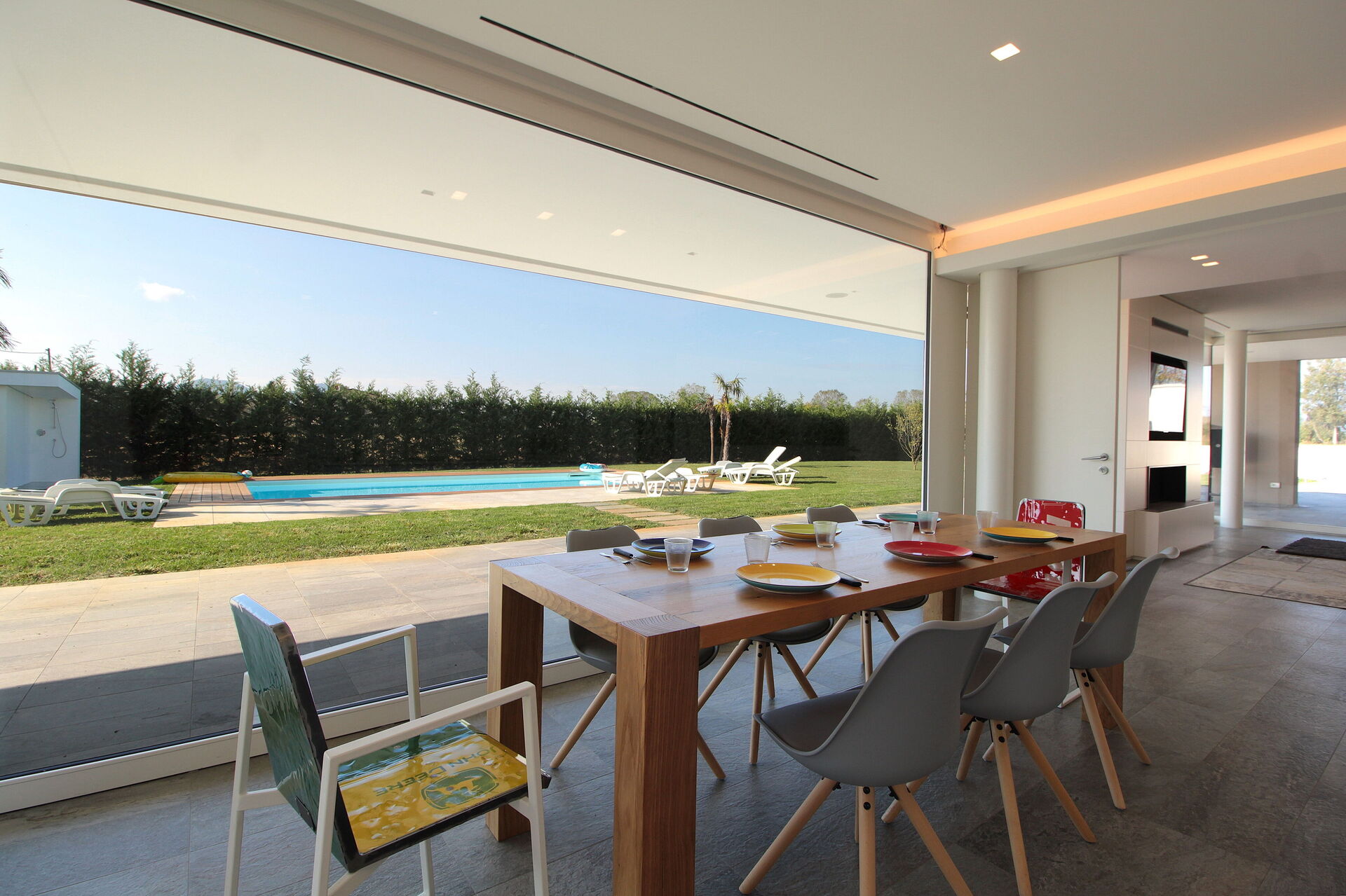 Freistehende Designervilla mit privatem Pool und komplett eingezäuntem Garten. Die Villa erstreckt sich über eine Etage und zeichnet sich durch große Fenster mit Blick auf den Garten und den ein Salz Swimmingpool aus (4,5 x 9 1,35mt). Die Lage im Grünen, mit Blick auf die Euganeischen Hügel, garantiert Ruhe und Frieden für die Gäste, die den Garten und den Pool in absoluter Privatsphäre genießen können. Die Villa verfügt über eine große Veranda von 120 Quadratmetern, unter der man nach dem Grillen gemütlich zu Abend essen kann, mit einem Soundsystem, das von jedem mobilen Gerät über Bluetooth verbunden werden kann.