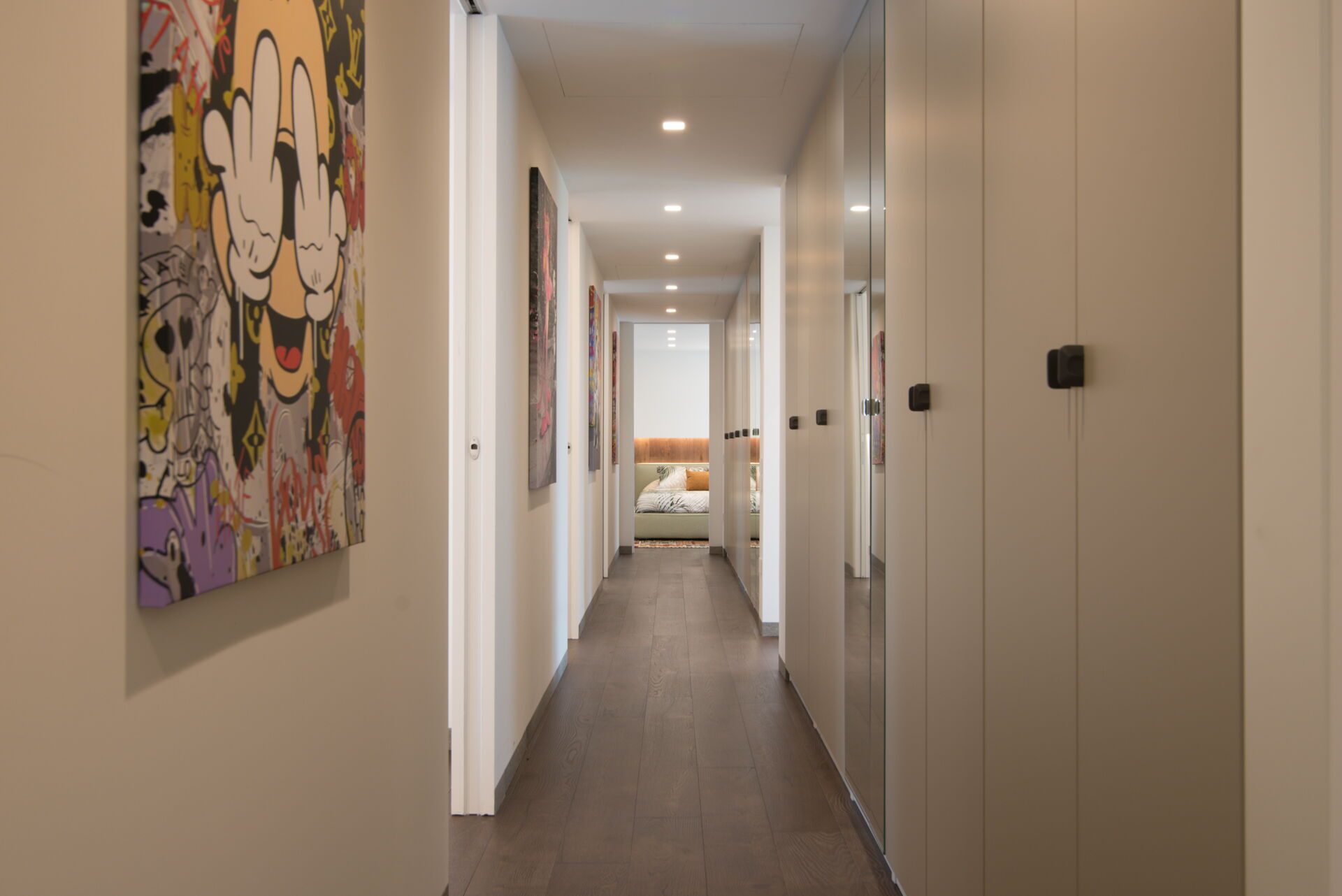 Der Schlafbereich besteht aus 4 Schlafzimmern, 3 Doppelzimmern und 1 mit zwei Einzelbetten, von denen eines über ein eigenes Bad verfügt. Ein zweites Badezimmer 4 x 4 befindet sich auf dem Flur.
