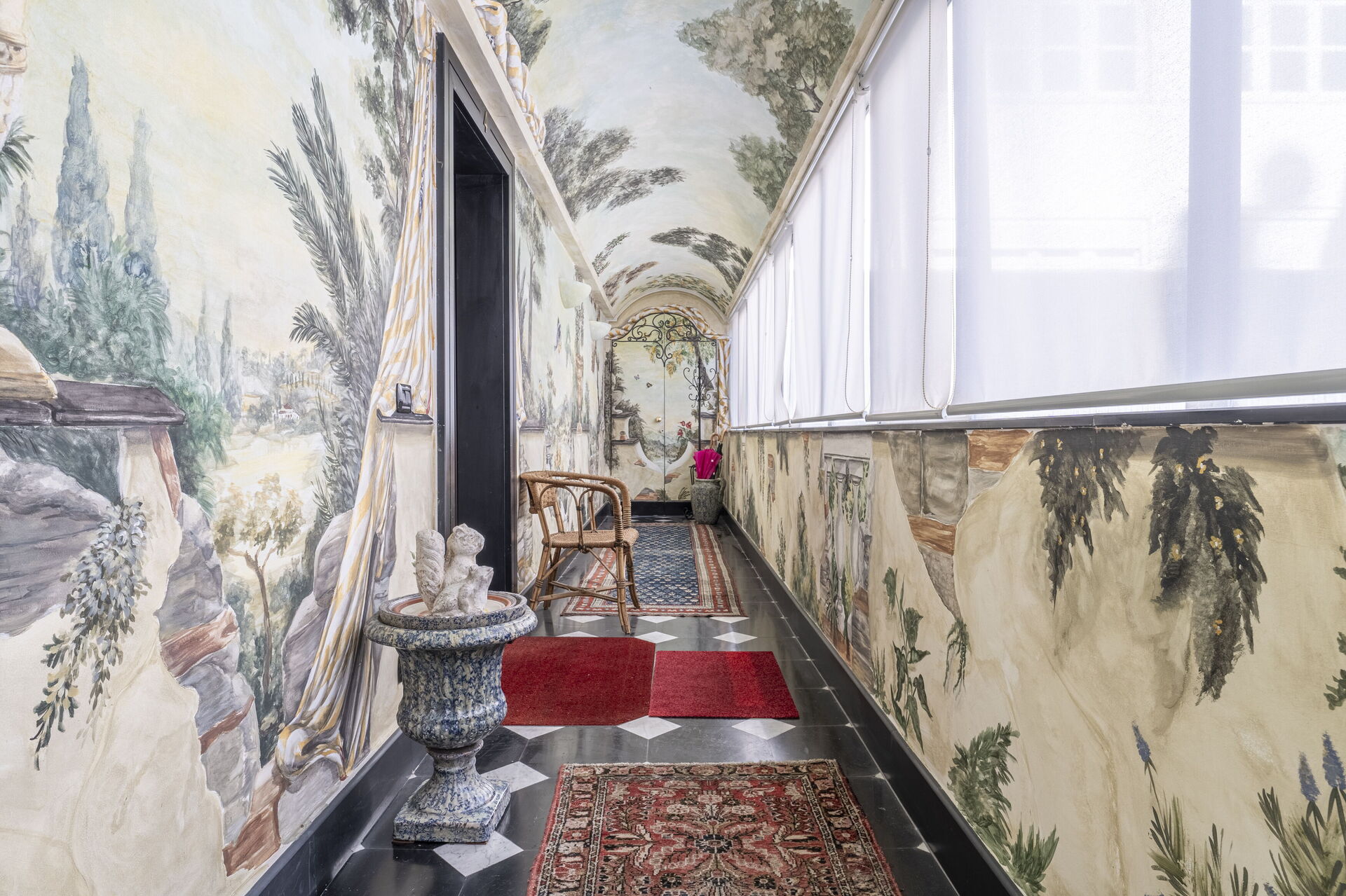 On accède à l'appartement par un couloir lumineux décoré de fresques caractéristiques. L'appartement se compose d'un grand salon meublé d'un canapé confortable, d'une télévision et d'une cuisine (équipée d'un lave-vaisselle, d'un four, d'une plaque de cuisson et d'un réfrigérateur). La salle de bains est équipée d'une baignoire à usage de douche.