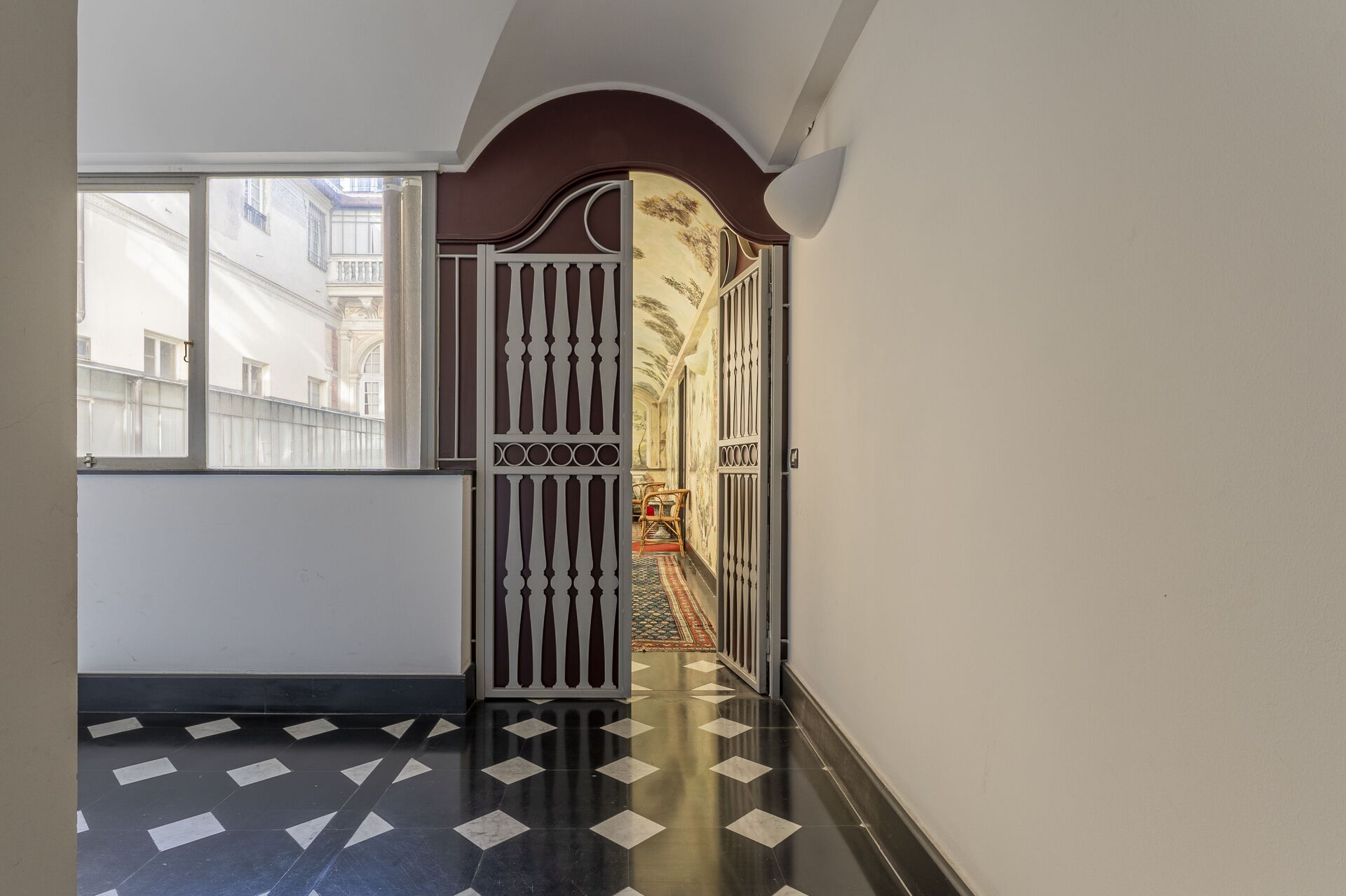 L'appartement est situé au deuxième étage d'une résidence historique avec de larges escaliers et des ascenseurs.