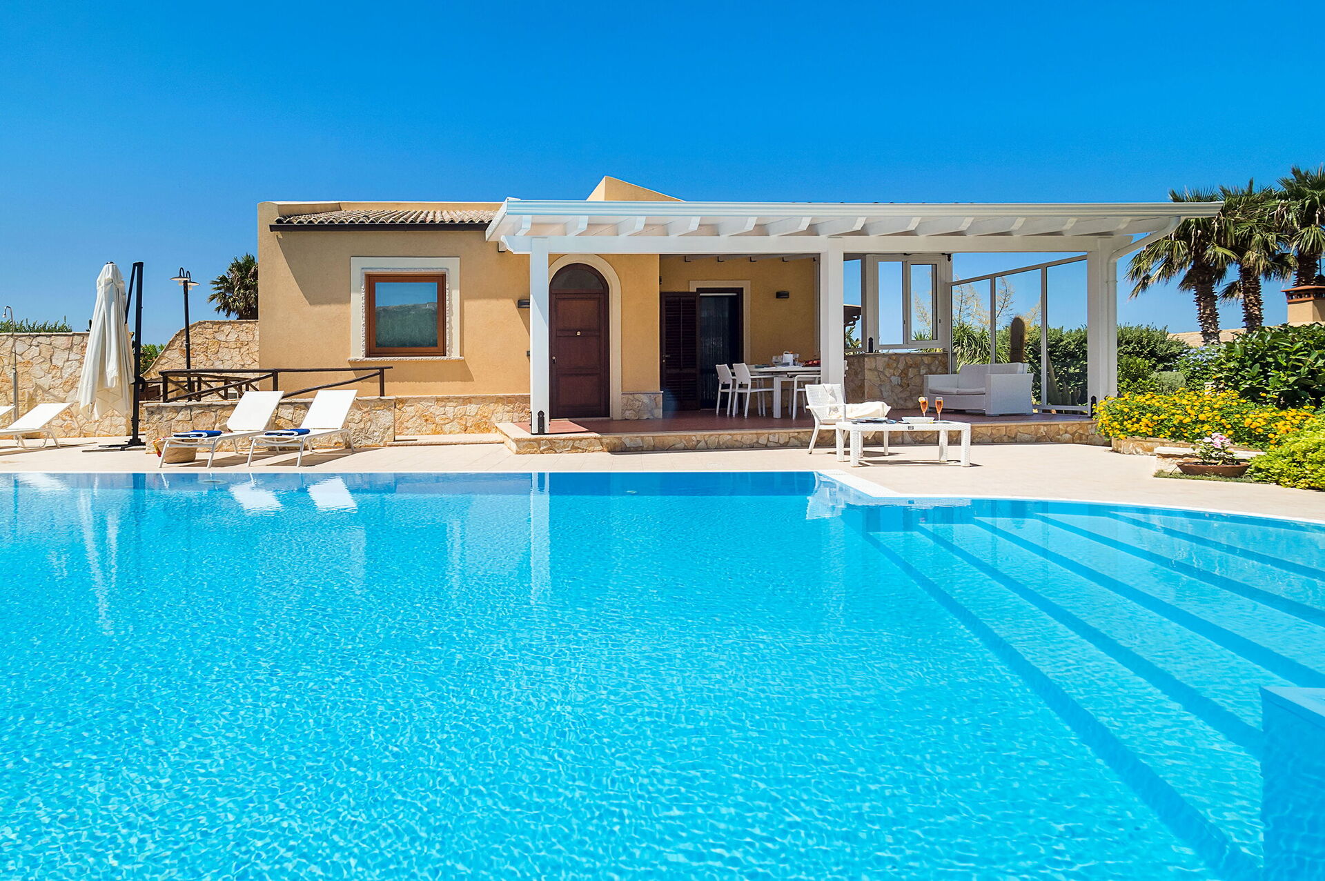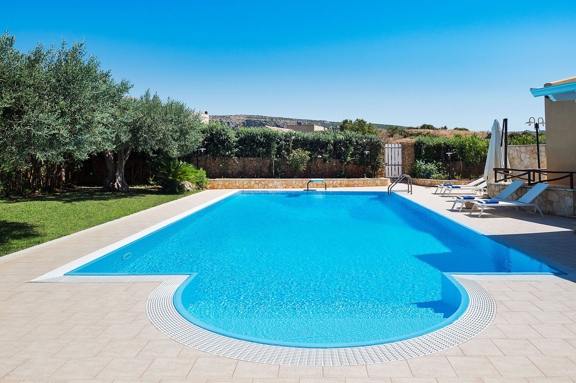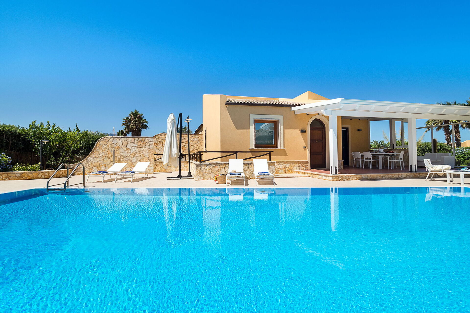 L'espace extérieur de la villa est caractérisé par une belle piscine privée (dimensions : 12,00 x 6,00 profondeur : 1,20-2,70) équipée de chaises longues, de parasols et d'une douche extérieure à l'usage exclusif des hôtes.