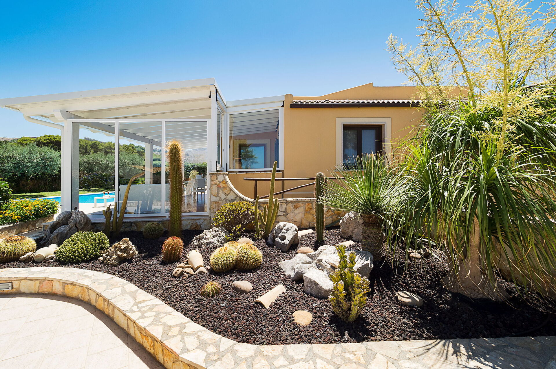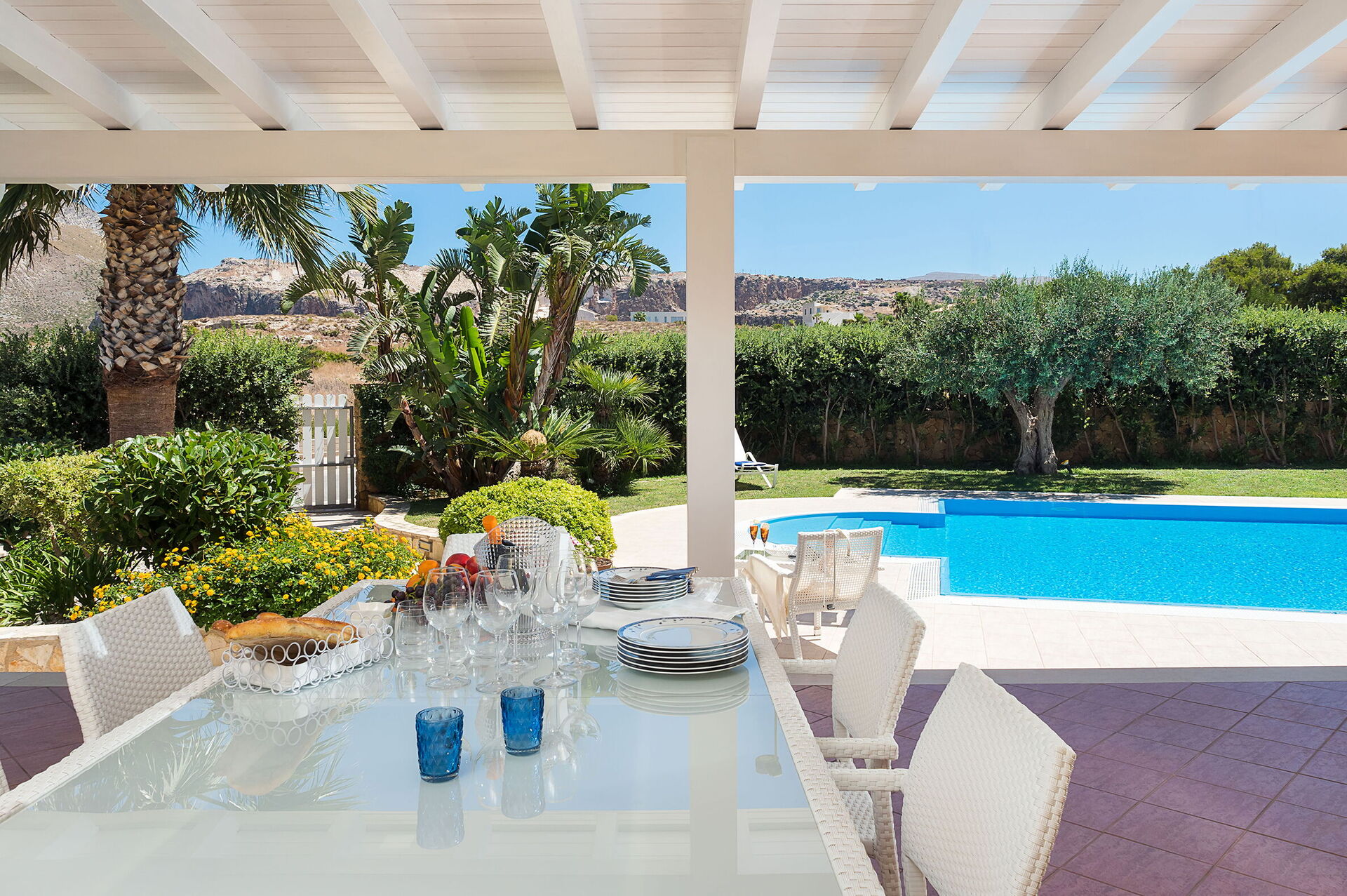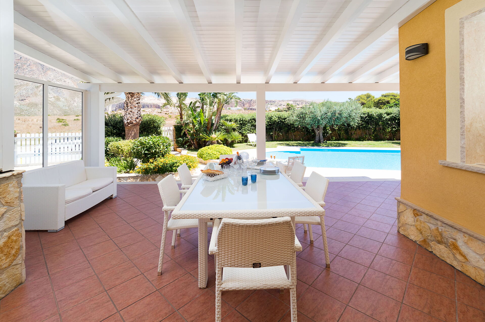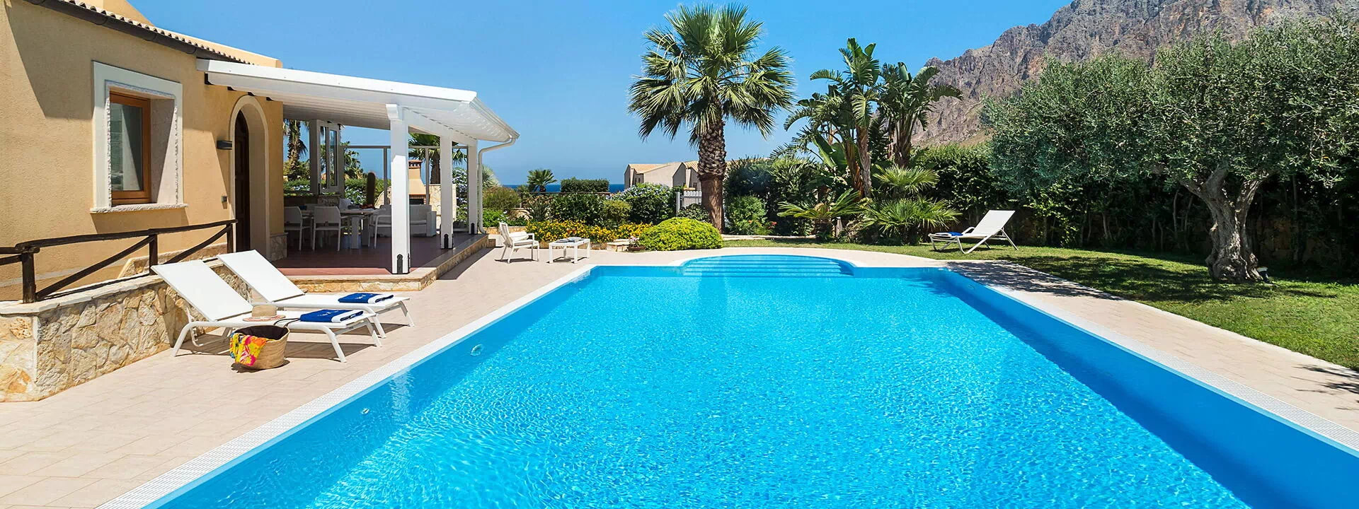 L'espace extérieur de la villa est caractérisé par une belle piscine privée (dimensions : 12,00 x 6,00 profondeur : 1,20-2,70) équipée de chaises longues, de parasols et d'une douche extérieure à l'usage exclusif des hôtes.