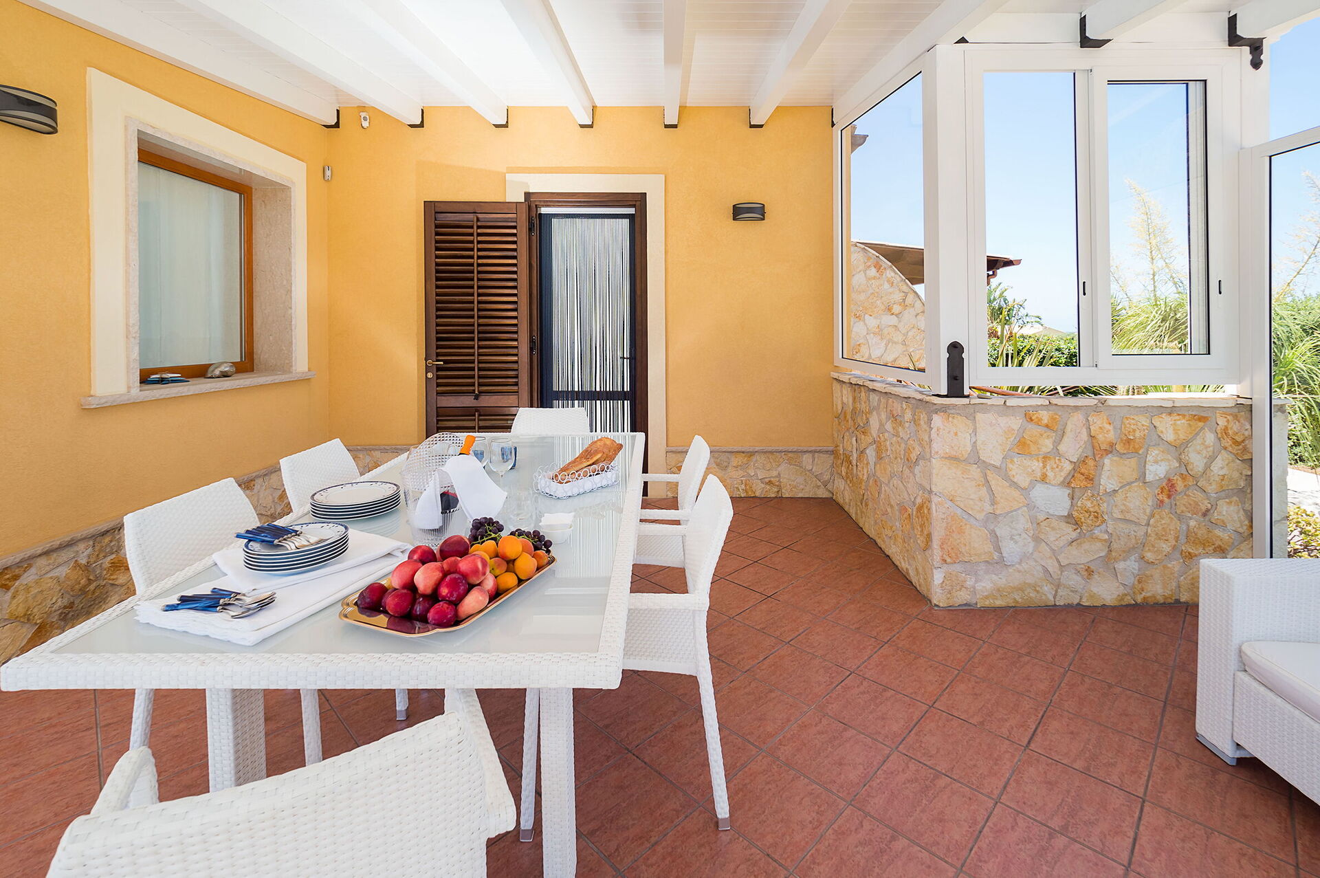 La véranda ombragée est meublée d'une table et de chaises pour les repas en plein air, ainsi que d'un canapé confortable pour se détendre. Il y a également un coin barbecue et un jardin.