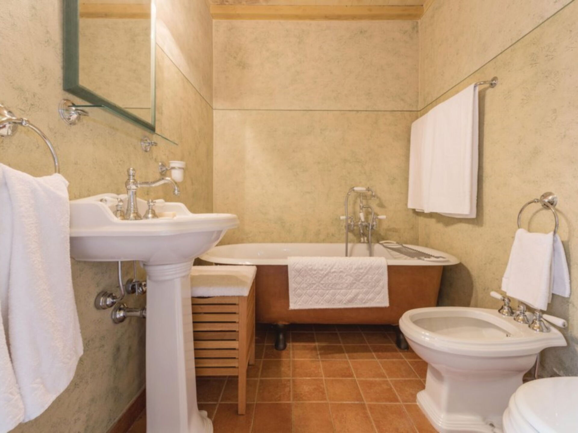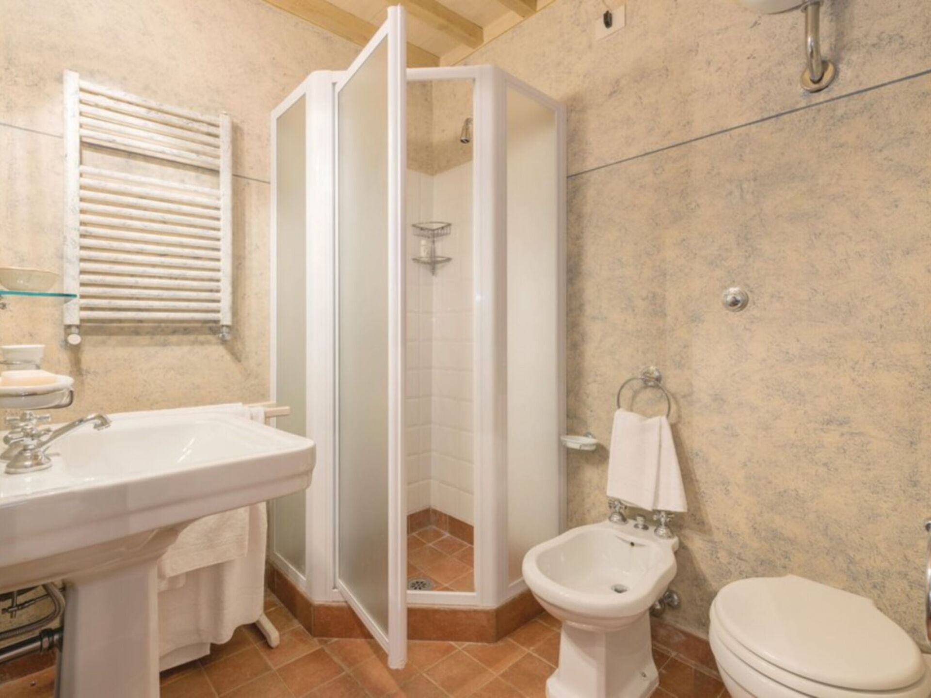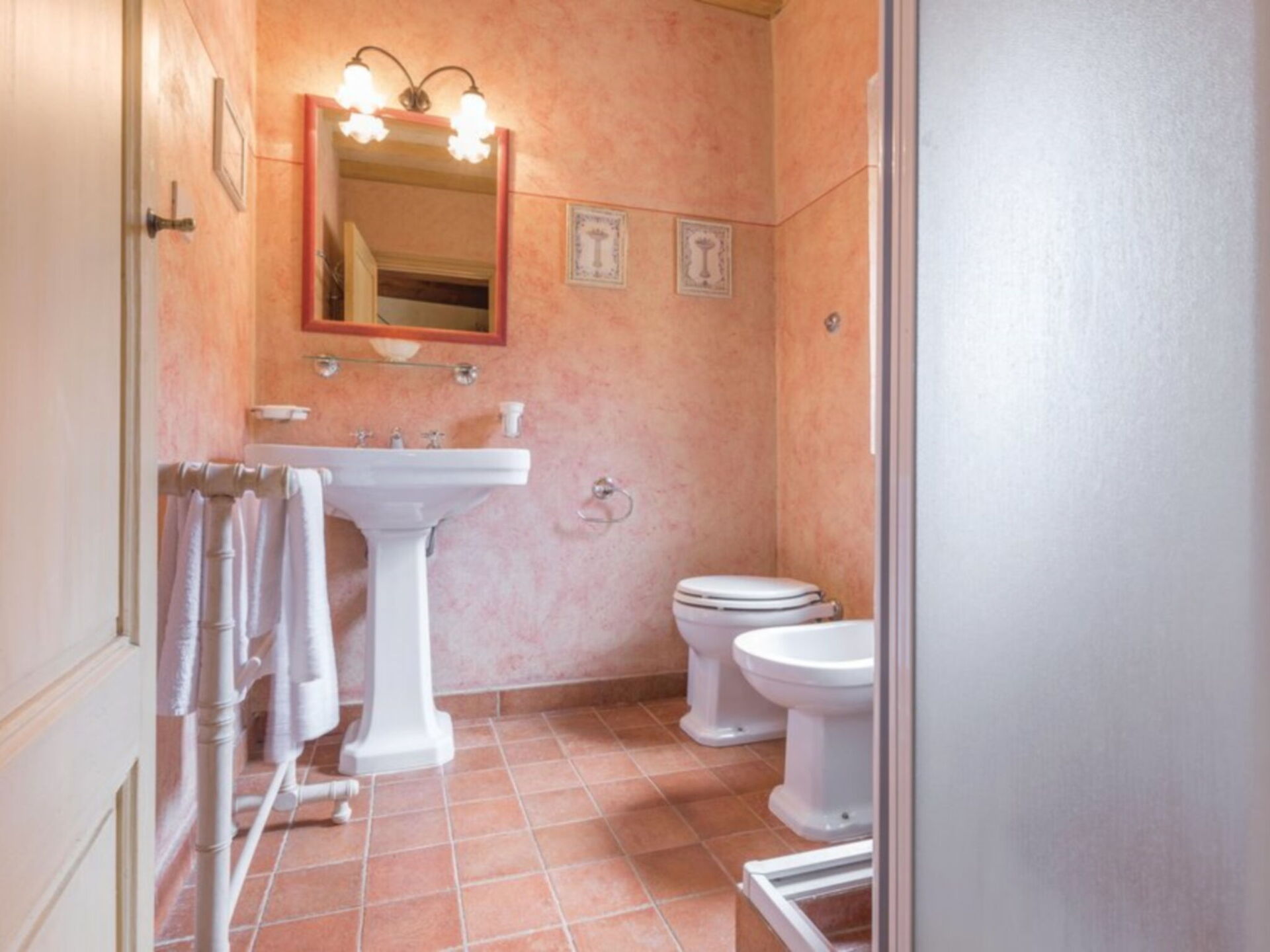 Au deuxième étage: 1 chambre double avec lit double et salle de bain avec baignoire / douche (wc / bidet); 1 chambre avec deux lits simples; 1 salle de bain avec baignoire / douche (WC / bidet); 1 suite avec lit double et salle de bain avec baignoire / douche (WC / bidet).