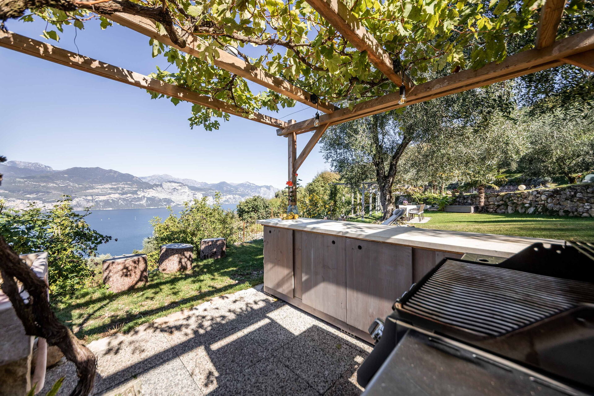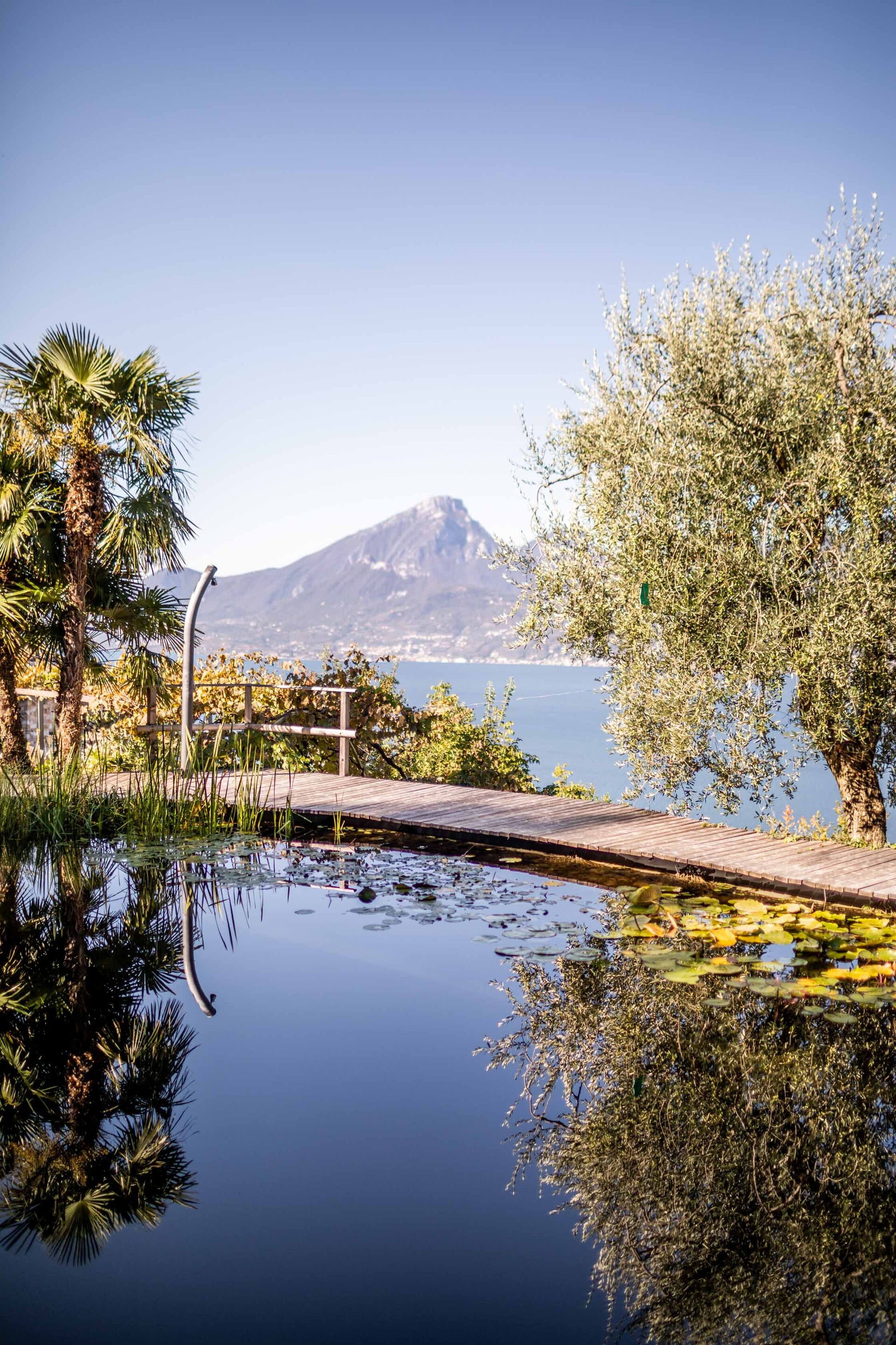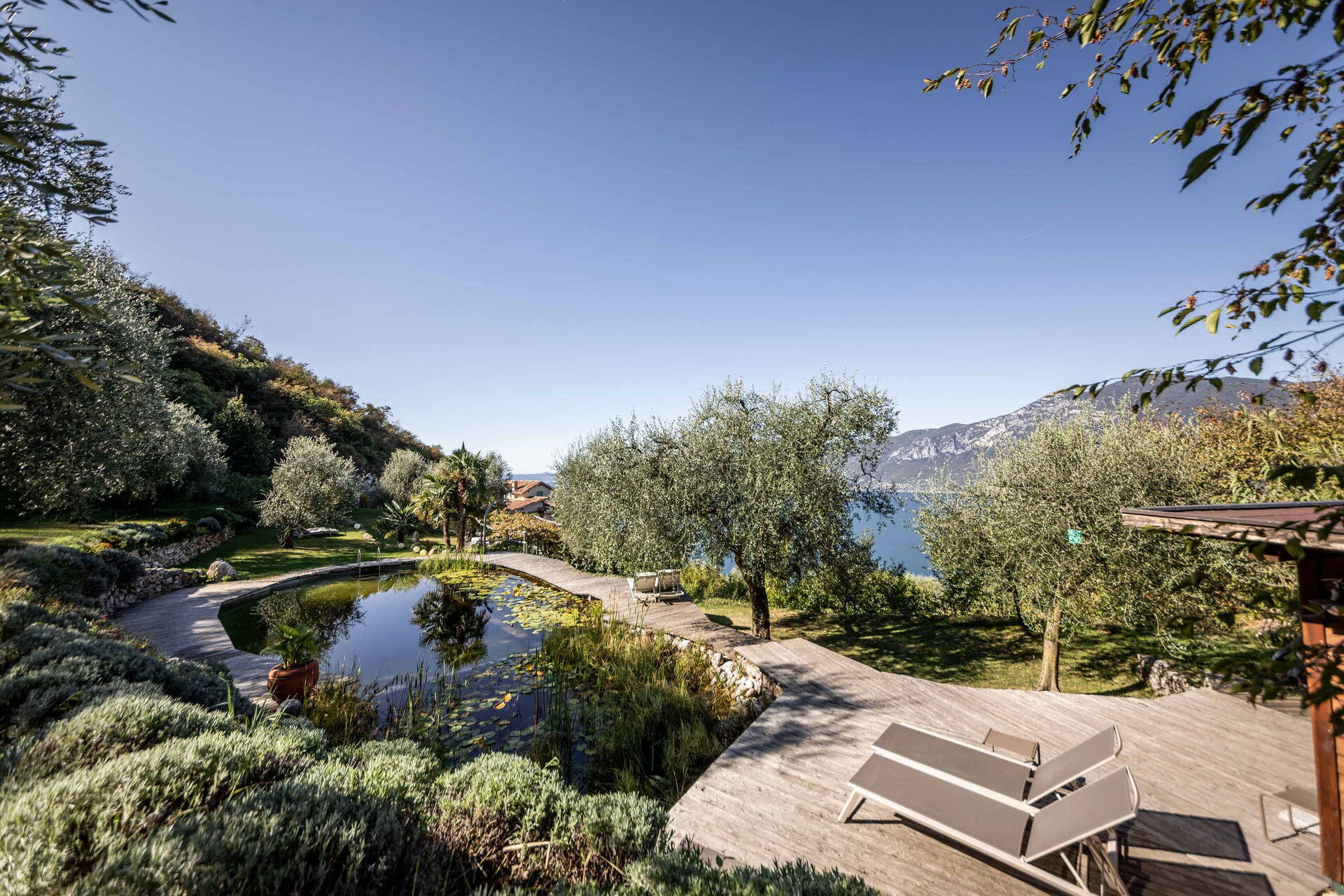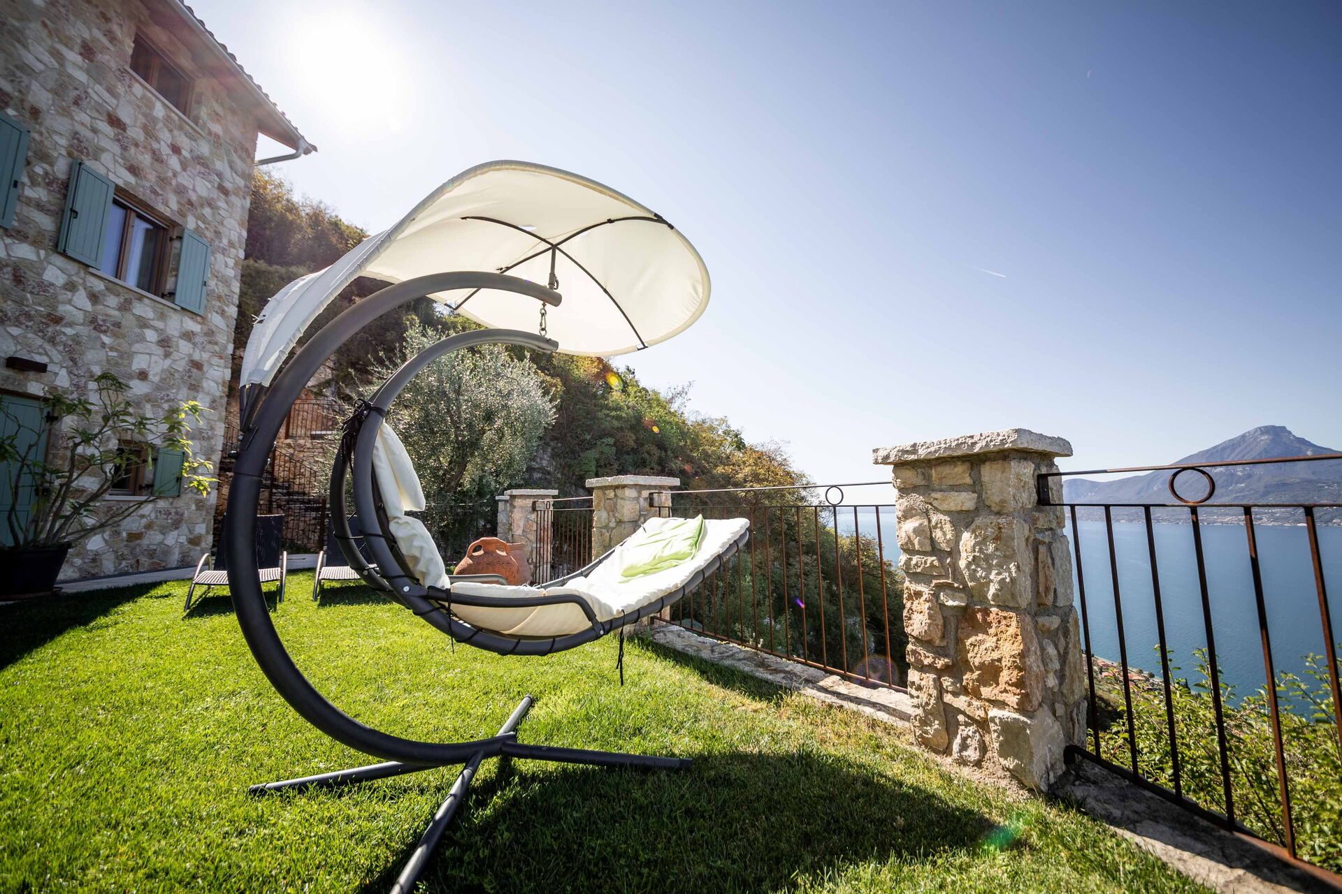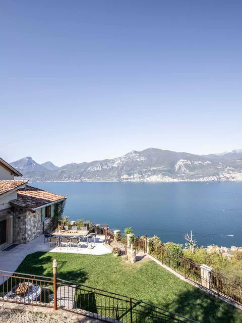 Le grand solarium du jardin - avec chaises longues, parasols et balançoires - est desservi par un petit étang de baignade, où vous pourrez nager parmi les nénuphars et les plantes aquatiques ou rester à l'ombre d'une banane ou d'autres arbres tropicaux, et une magnifique terrasse avec jacuzzi chauffé, pour s'immerger et profiter d'un peu de détente même les jours et soirs plus frais. Sur une autre terrasse, cependant, une grande table en bois avec des chaises vous permettra de déjeuner et de dîner dans un cadre unique juste au-dessus des eaux du lac de Garde, vous faisant profiter du frisson d'être vraiment suspendu entre ciel et terre. Un coin de paradis où vous trouverez également un espace barbecue à déguster notamment à la tombée de la nuit pour un apéritif ou pour un barbecue de groupe.