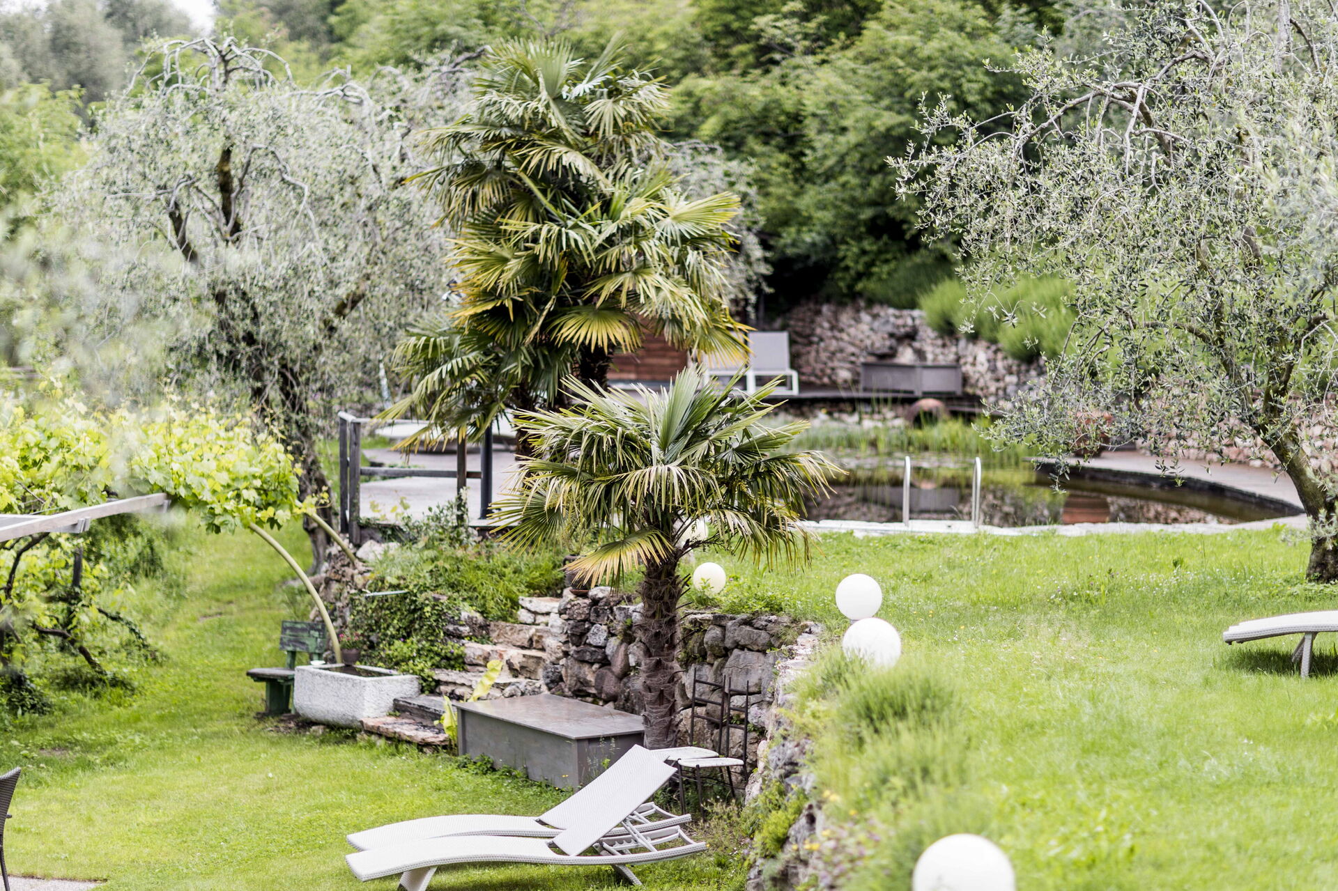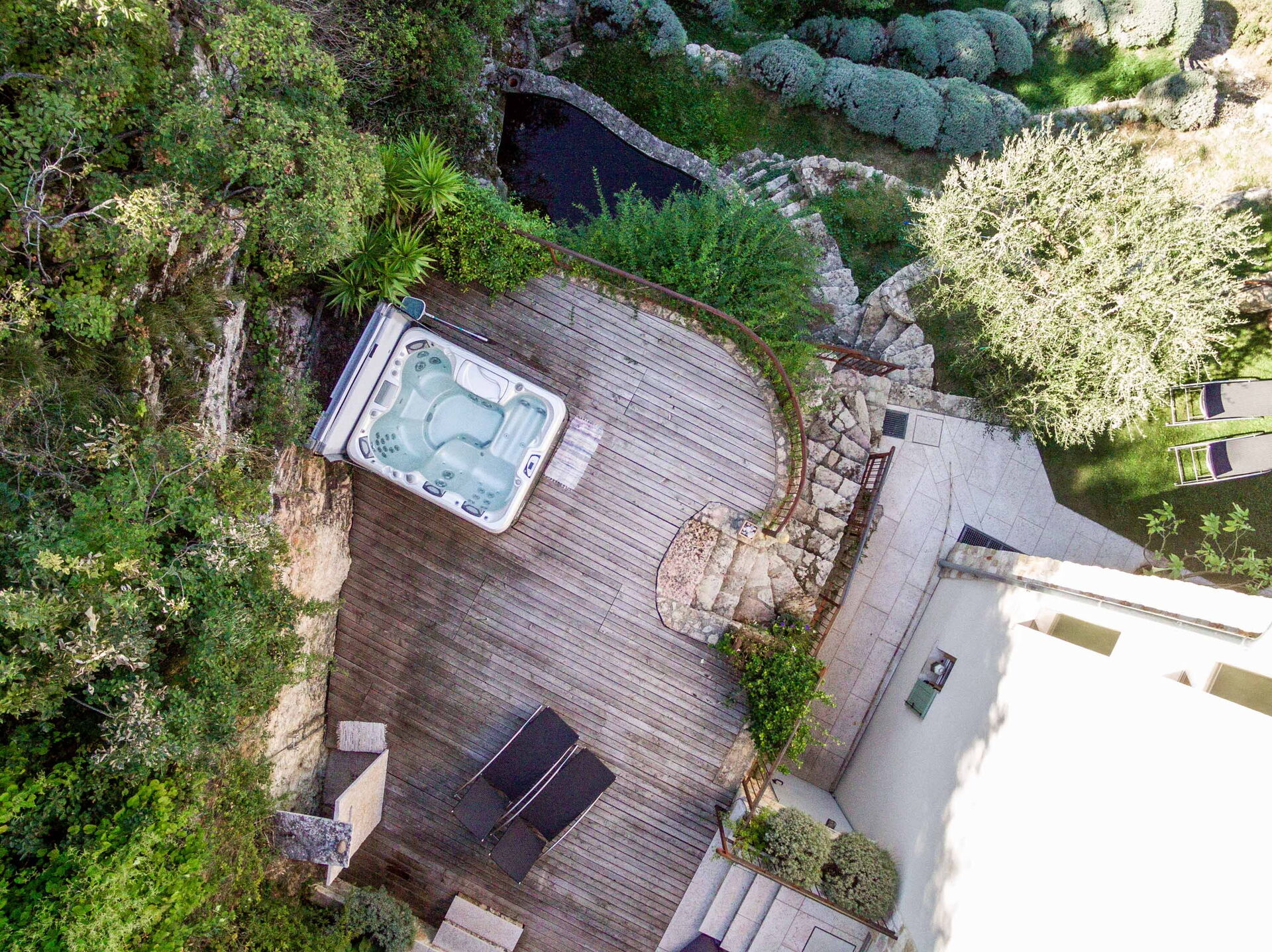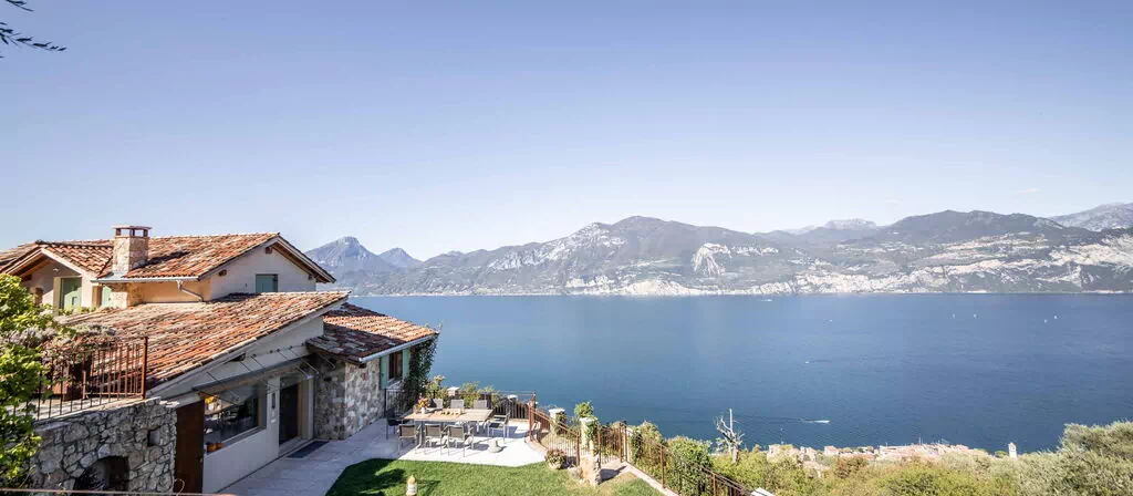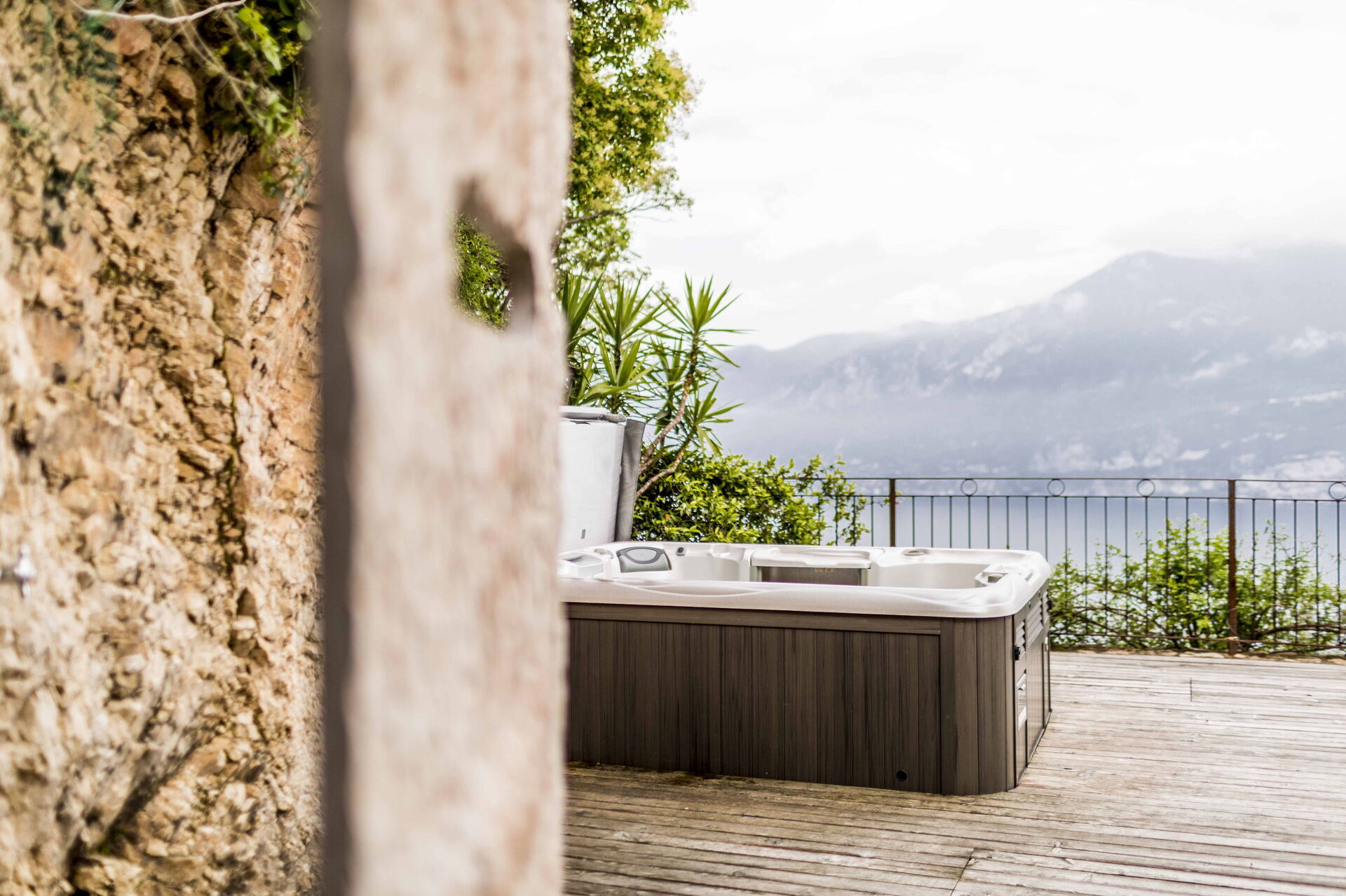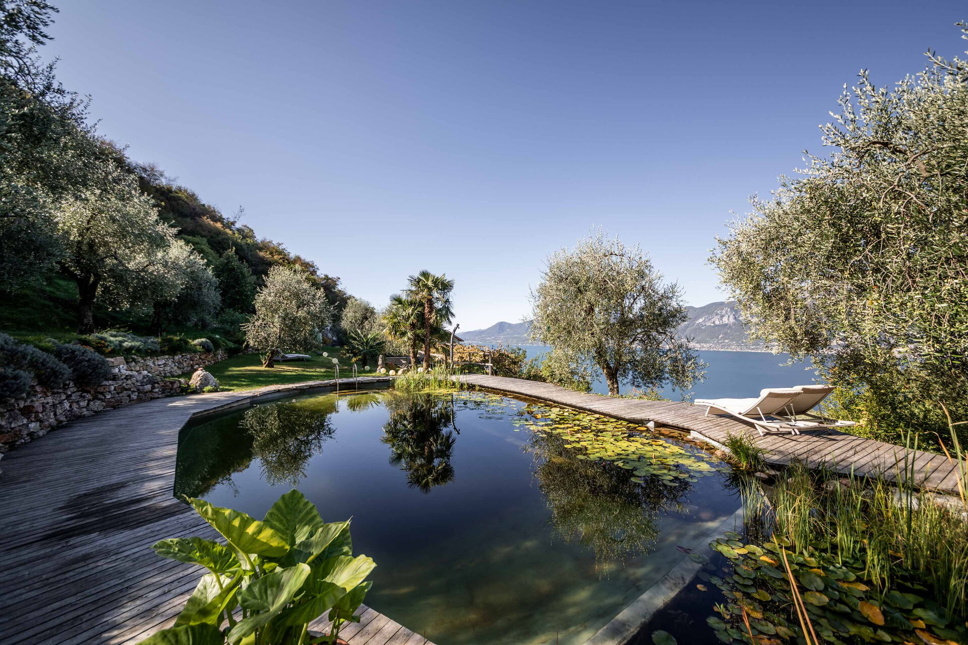Le grand solarium du jardin - avec chaises longues, parasols et balançoires - est desservi par un petit étang de baignade, où vous pourrez nager parmi les nénuphars et les plantes aquatiques ou rester à l'ombre d'une banane ou d'autres arbres tropicaux, et une magnifique terrasse avec jacuzzi chauffé, pour s'immerger et profiter d'un peu de détente même les jours et soirs plus frais. Sur une autre terrasse, cependant, une grande table en bois avec des chaises vous permettra de déjeuner et de dîner dans un cadre unique juste au-dessus des eaux du lac de Garde, vous faisant profiter du frisson d'être vraiment suspendu entre ciel et terre. Un coin de paradis où vous trouverez également un espace barbecue à déguster notamment à la tombée de la nuit pour un apéritif ou pour un barbecue de groupe.