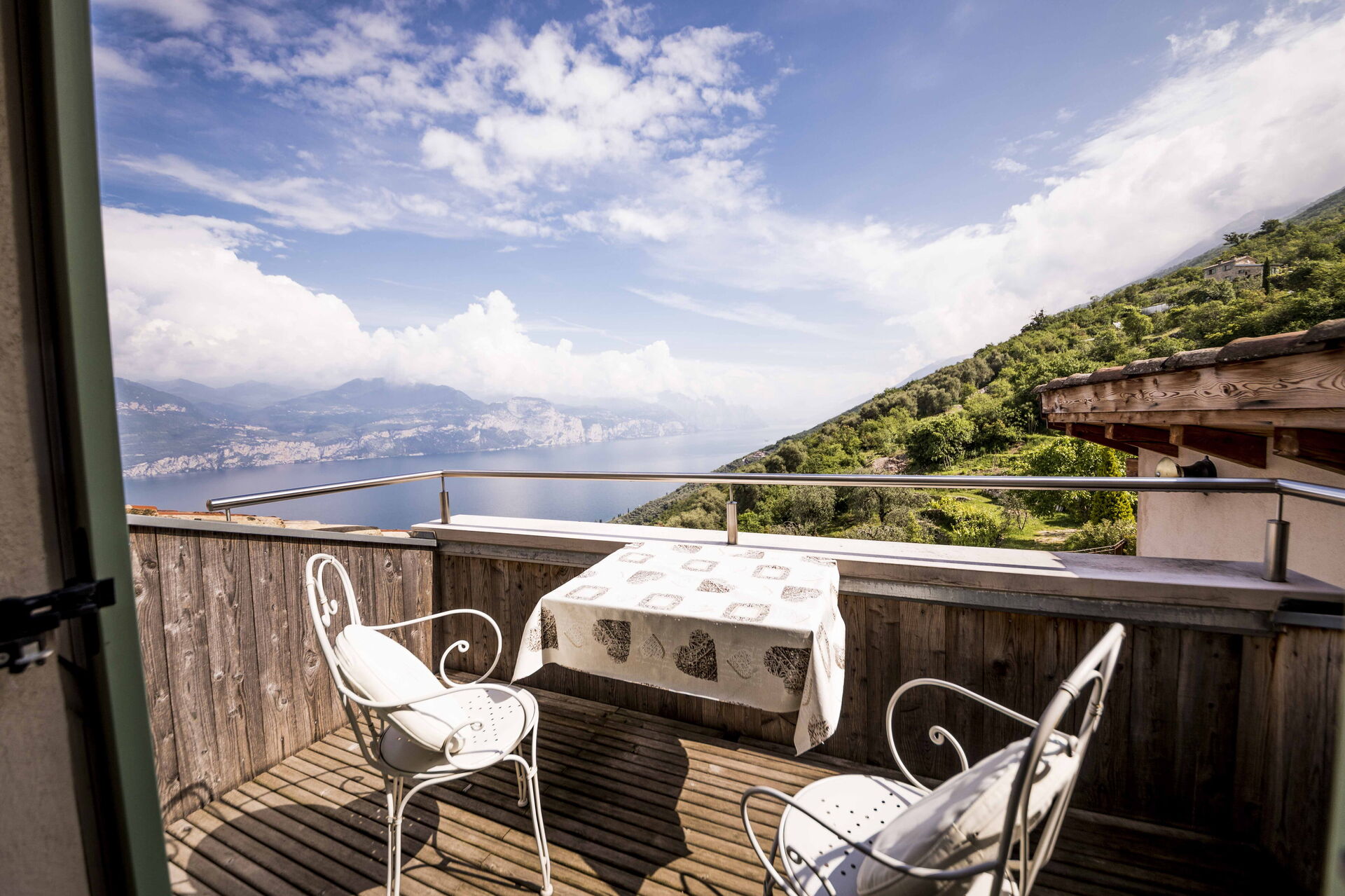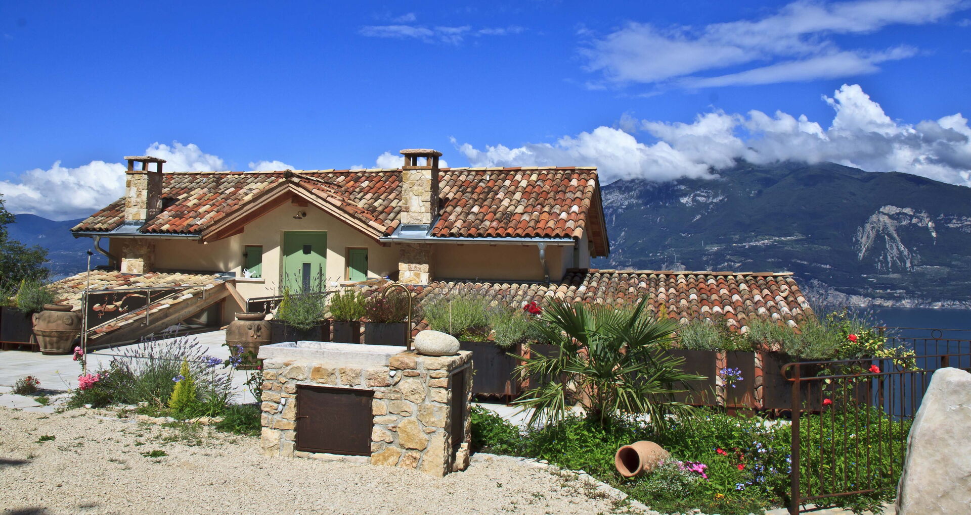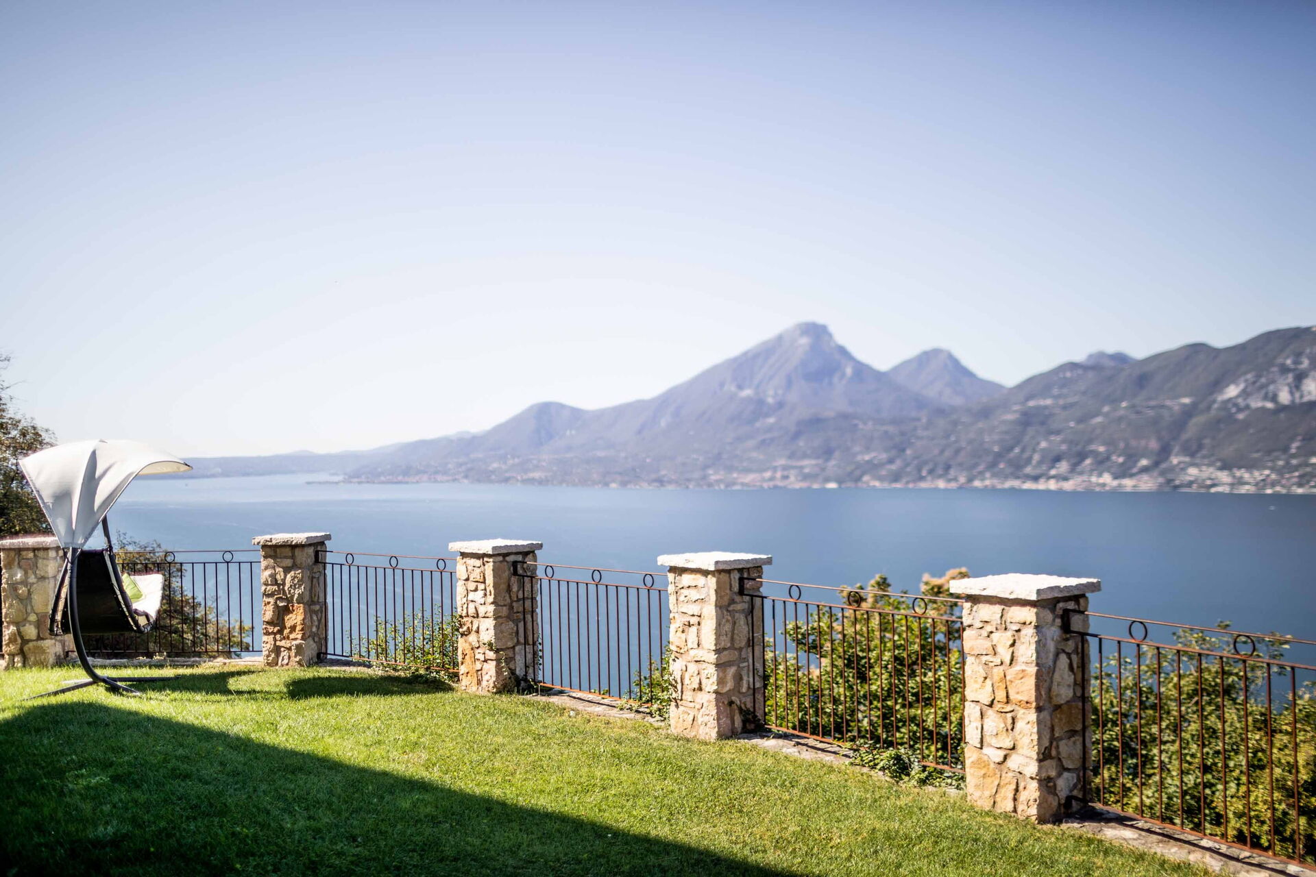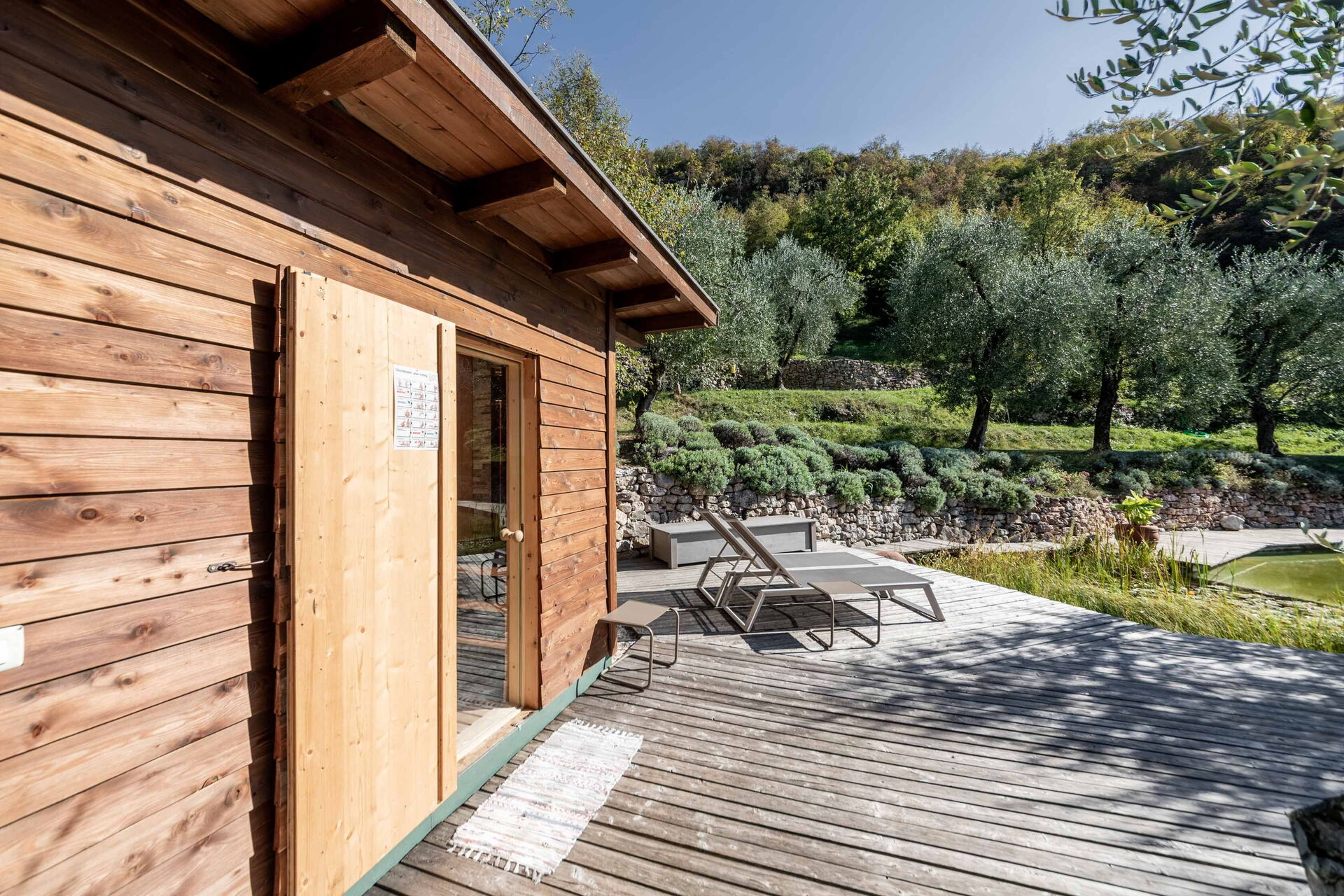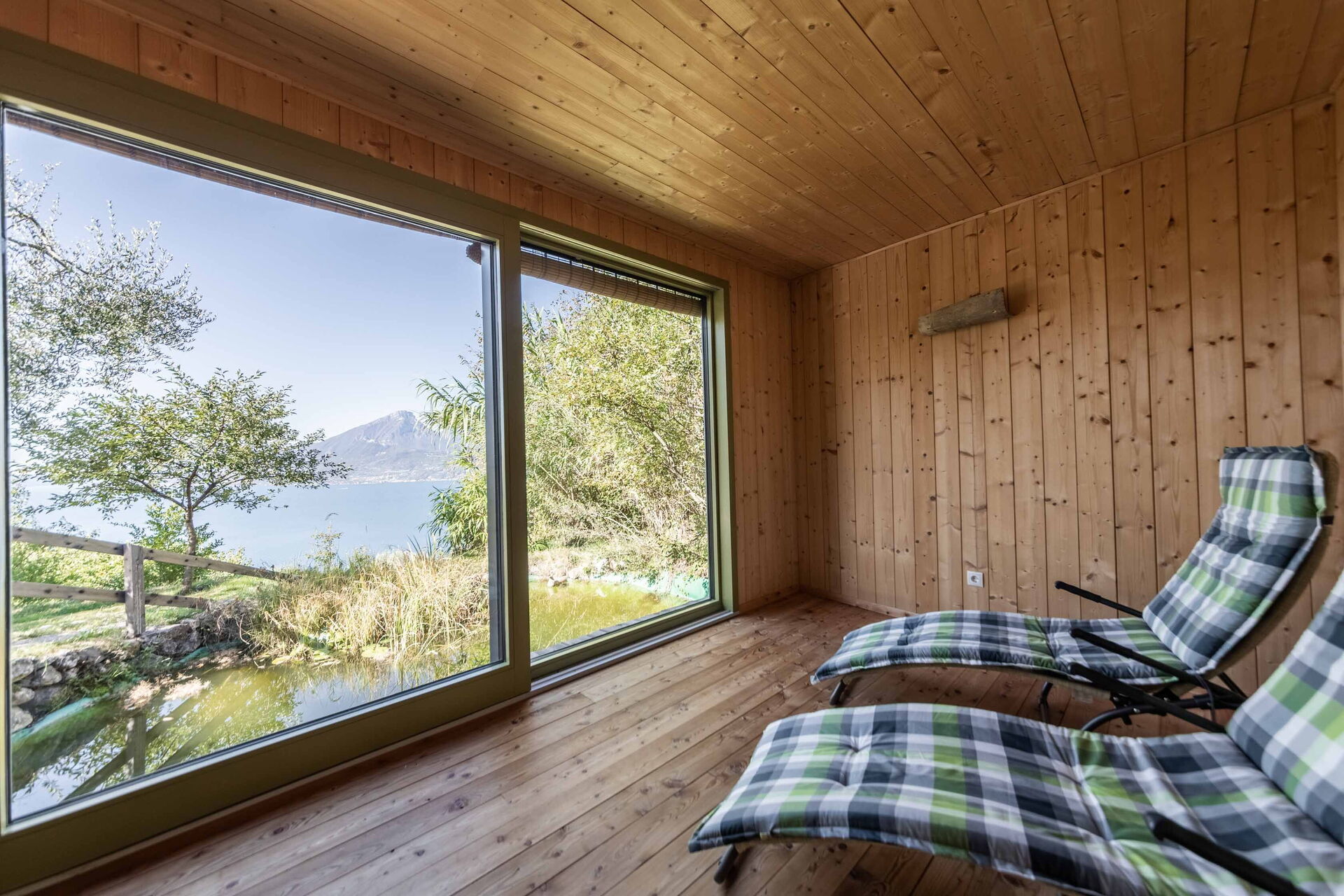 Le grand solarium du jardin - avec chaises longues, parasols et balançoires - est desservi par un petit étang de baignade, où vous pourrez nager parmi les nénuphars et les plantes aquatiques ou rester à l'ombre d'une banane ou d'autres arbres tropicaux, et une magnifique terrasse avec jacuzzi chauffé, pour s'immerger et profiter d'un peu de détente même les jours et soirs plus frais. Sur une autre terrasse, cependant, une grande table en bois avec des chaises vous permettra de déjeuner et de dîner dans un cadre unique juste au-dessus des eaux du lac de Garde, vous faisant profiter du frisson d'être vraiment suspendu entre ciel et terre. Un coin de paradis où vous trouverez également un espace barbecue à déguster notamment à la tombée de la nuit pour un apéritif ou pour un barbecue de groupe.