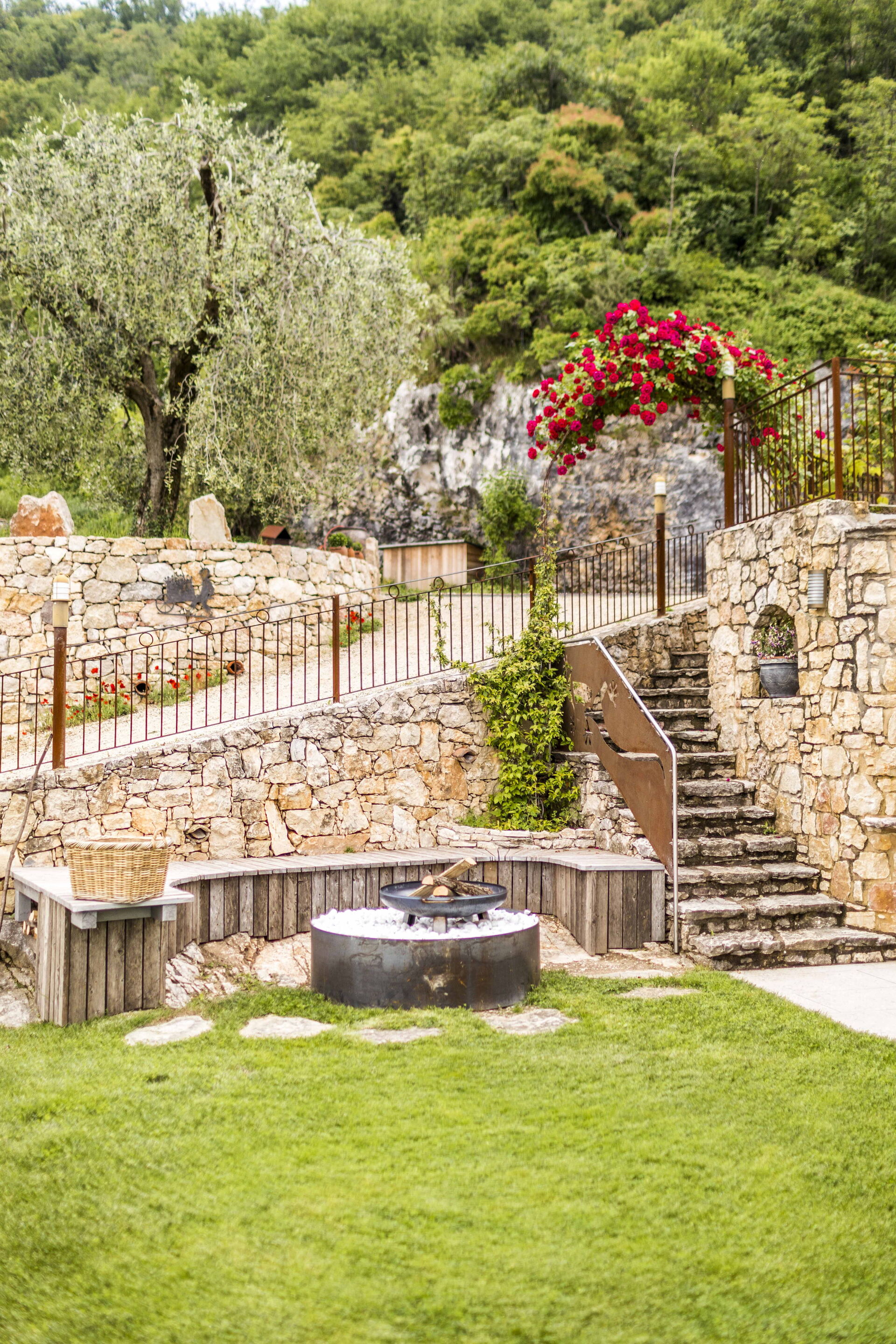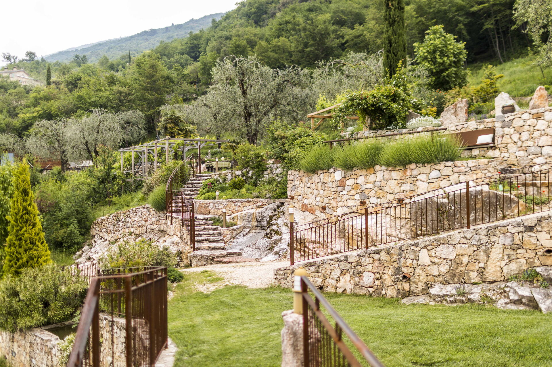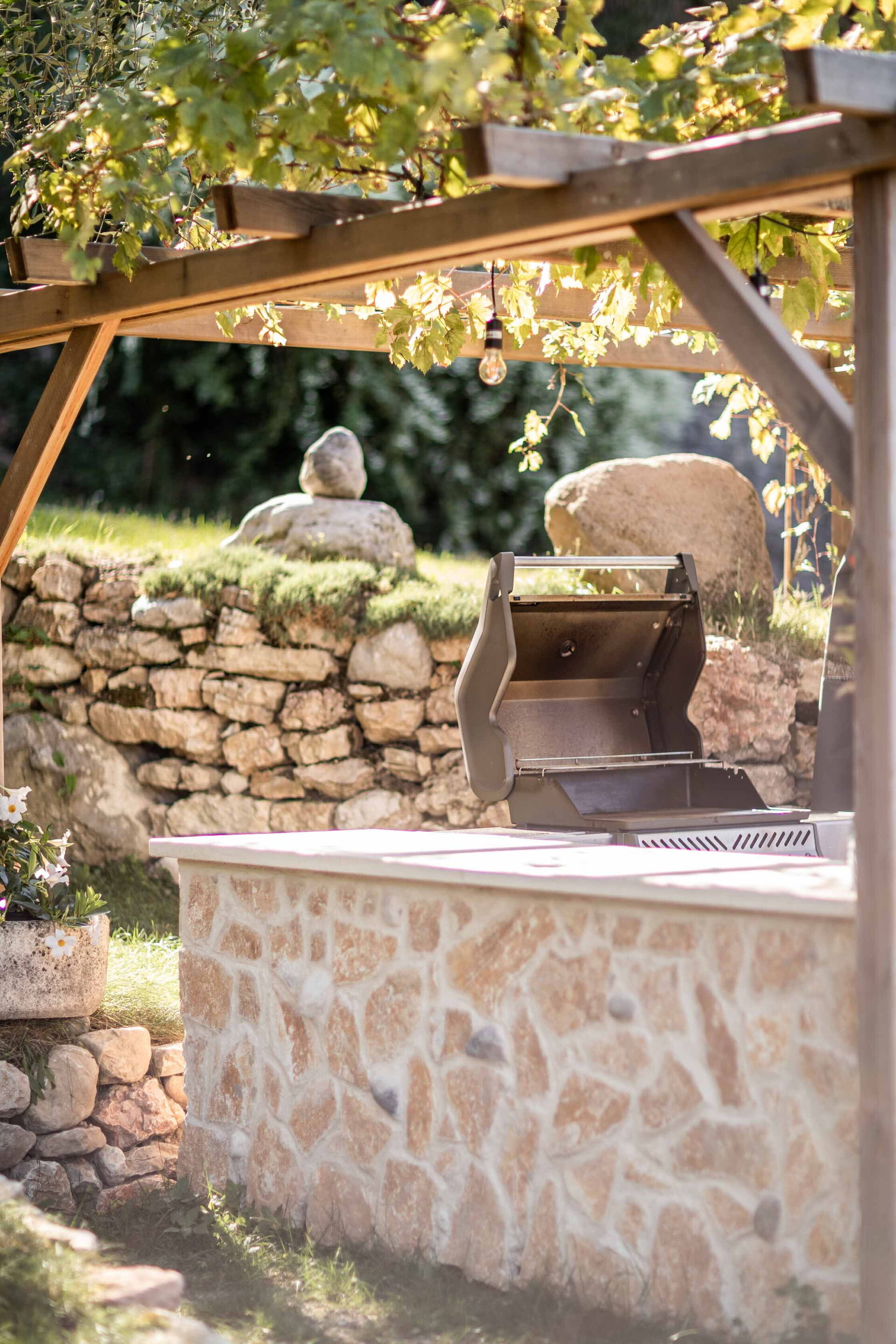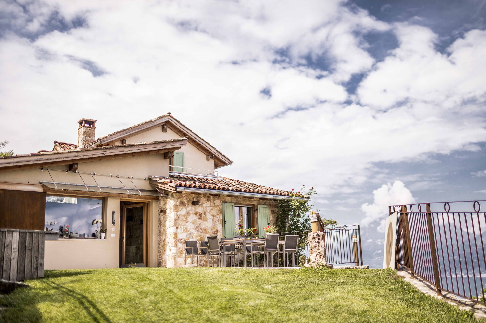 Le grand solarium du jardin - avec chaises longues, parasols et balançoires - est desservi par un petit étang de baignade, où vous pourrez nager parmi les nénuphars et les plantes aquatiques ou rester à l'ombre d'une banane ou d'autres arbres tropicaux, et une magnifique terrasse avec jacuzzi chauffé, pour s'immerger et profiter d'un peu de détente même les jours et soirs plus frais. Sur une autre terrasse, cependant, une grande table en bois avec des chaises vous permettra de déjeuner et de dîner dans un cadre unique juste au-dessus des eaux du lac de Garde, vous faisant profiter du frisson d'être vraiment suspendu entre ciel et terre. Un coin de paradis où vous trouverez également un espace barbecue à déguster notamment à la tombée de la nuit pour un apéritif ou pour un barbecue de groupe.