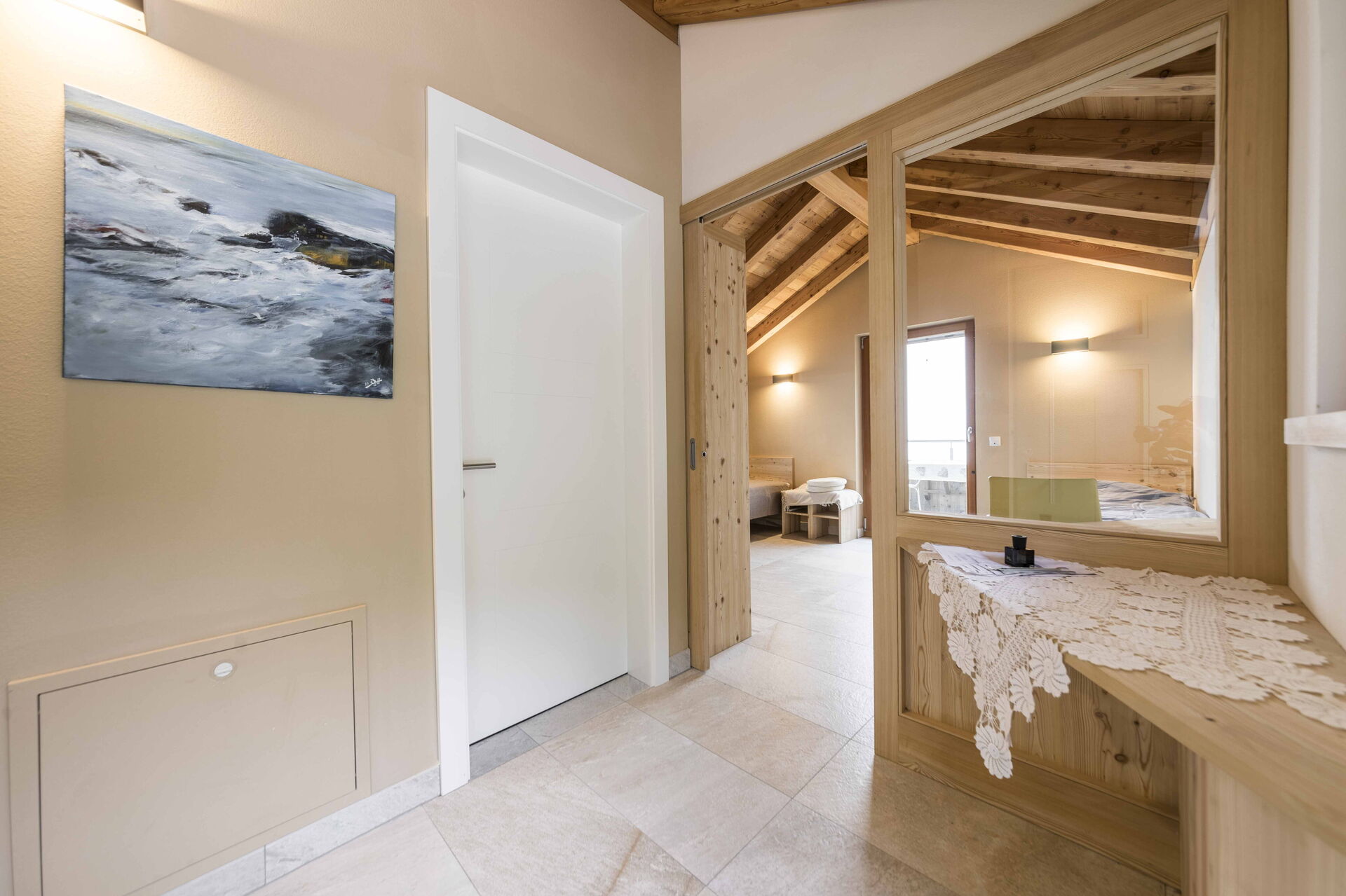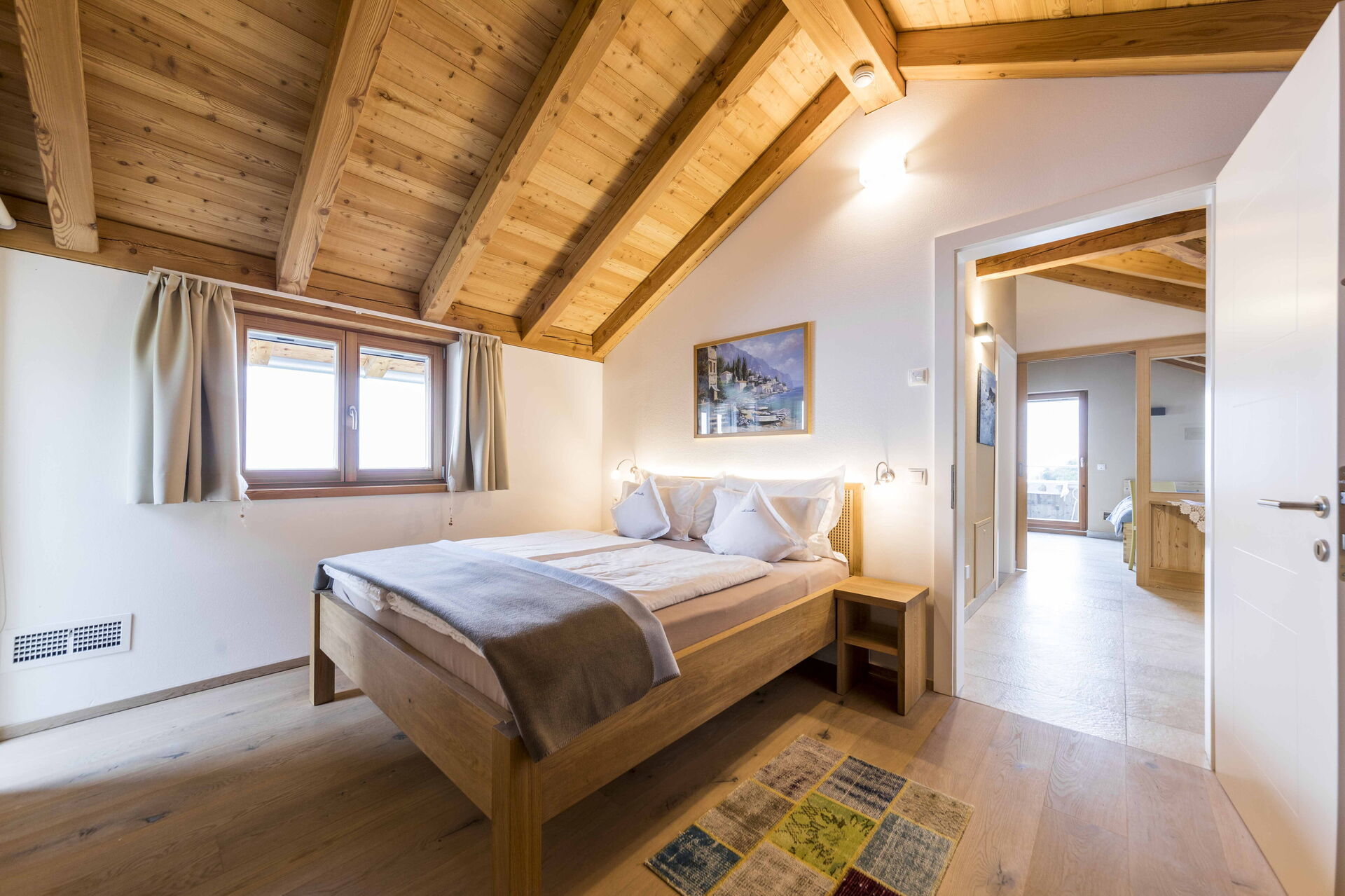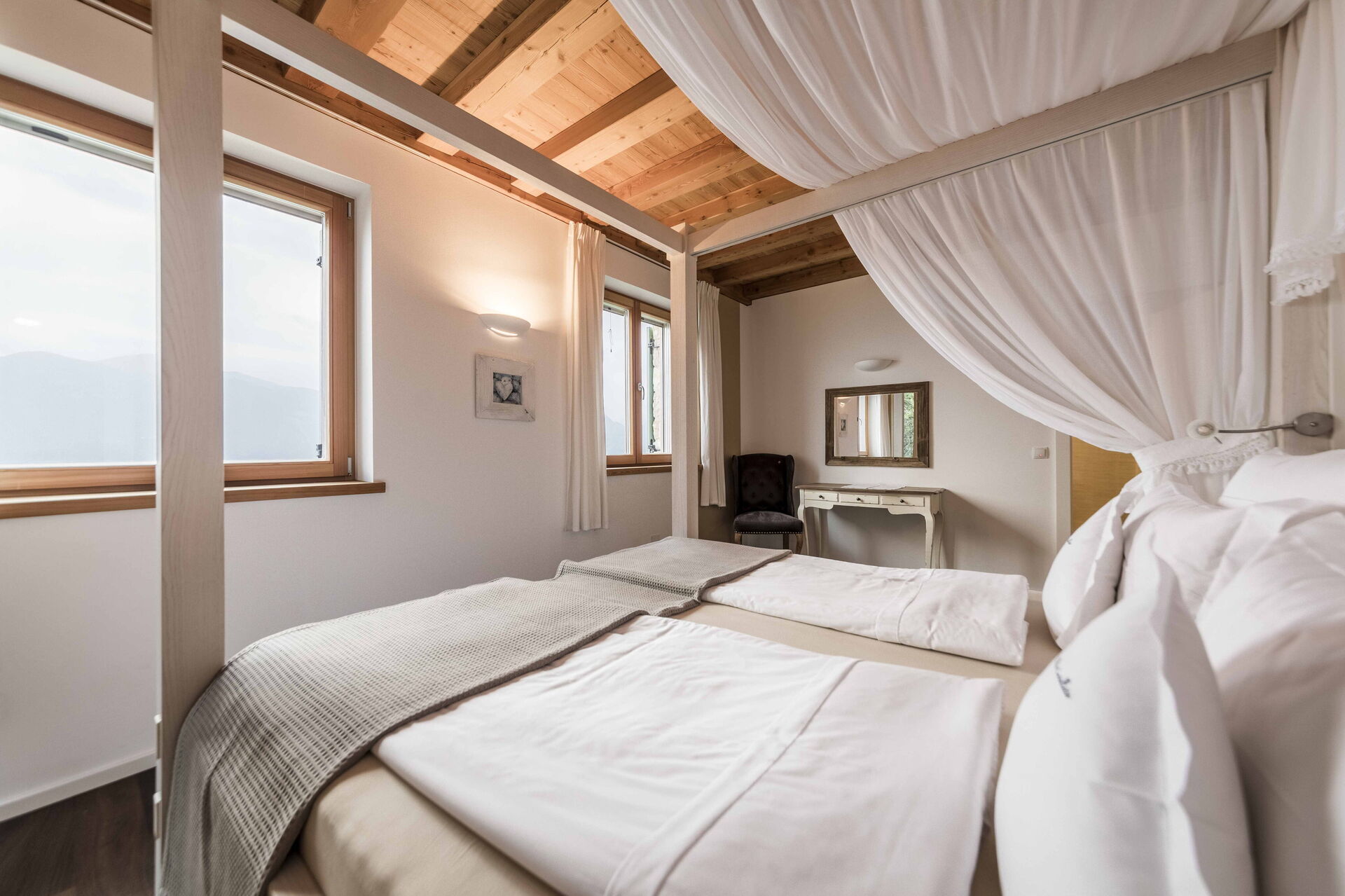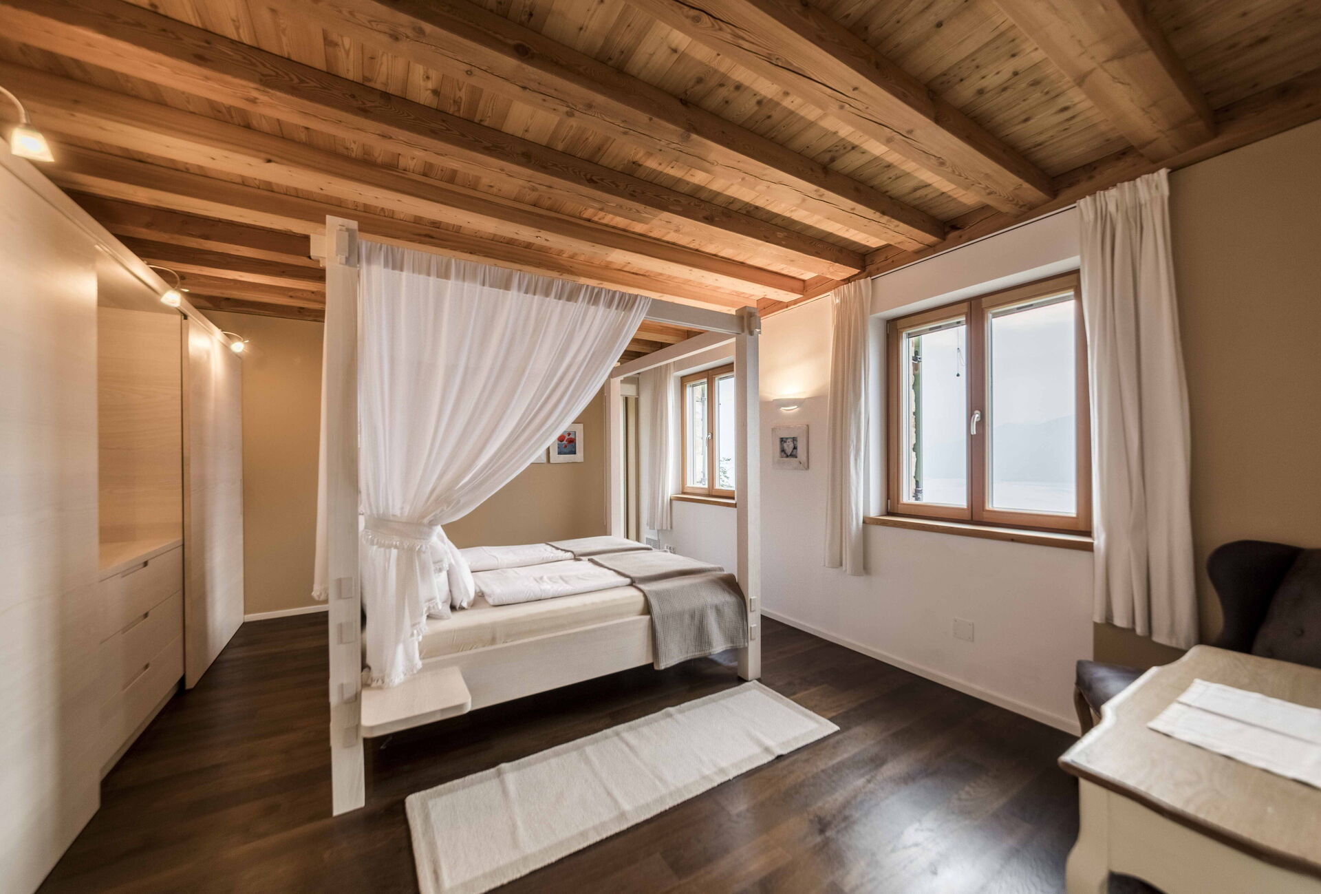 Au premier étage, il y a 2 chambres avec salle de bain privée tandis qu'à l'étage la zone nuit offre 2 autres chambres, toutes avec vue sur le lac et avec salle de bain partagée. L'environnement ici est également vraiment unique : des poutres en bois, comme dans le reste de la maison, pour les plafonds mais aussi du bois pour les sols et la plupart des meubles. Un mélange parfait qui rend l'ensemble de l'environnement vraiment respectueux de l'environnement.