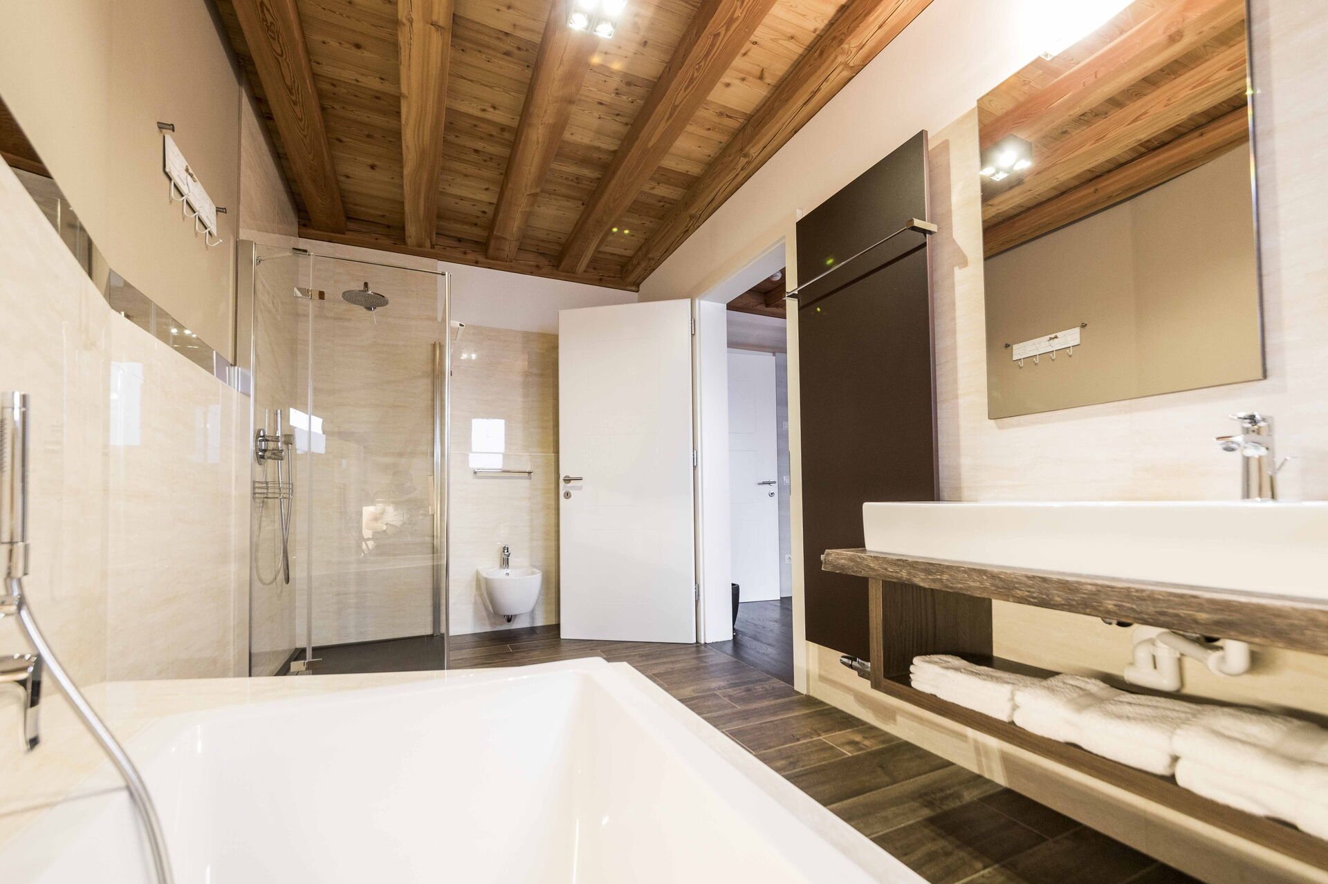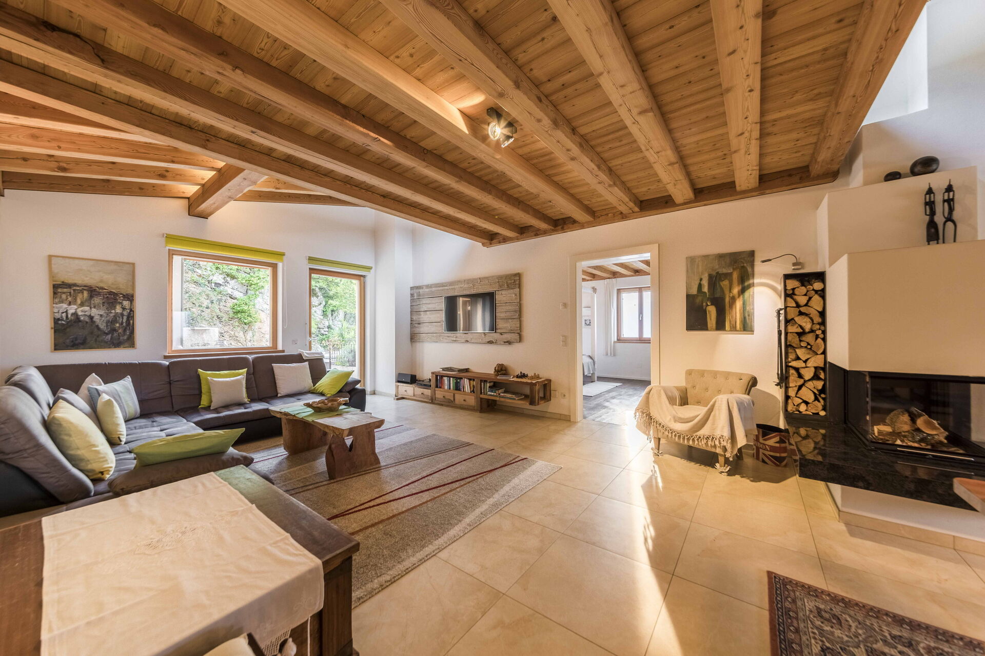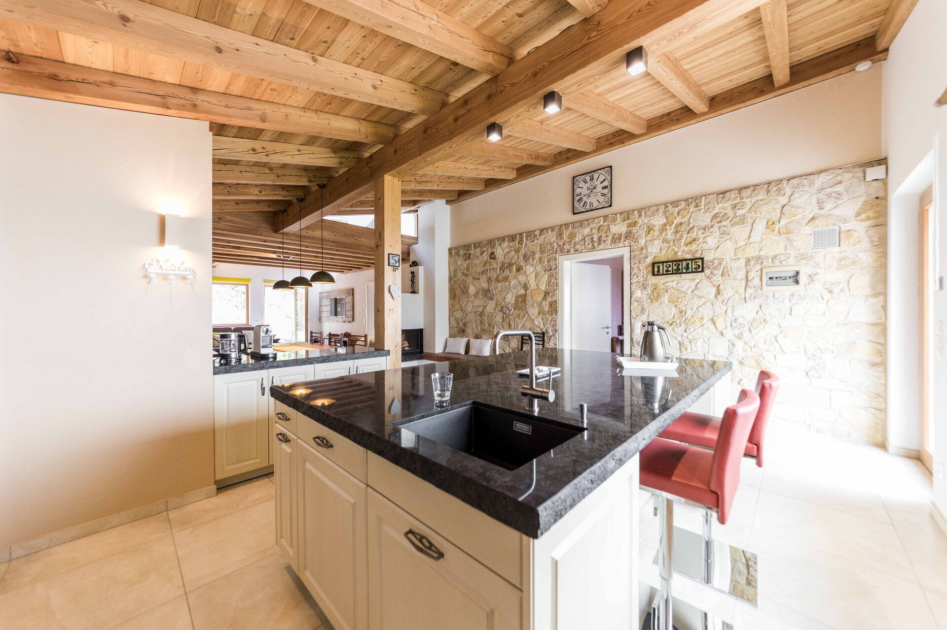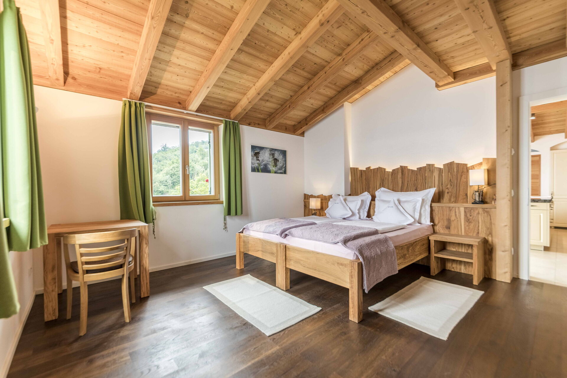 Au premier étage, il y a 2 chambres avec salle de bain privée tandis qu'à l'étage la zone nuit offre 2 autres chambres, toutes avec vue sur le lac et avec salle de bain partagée. L'environnement ici est également vraiment unique : des poutres en bois, comme dans le reste de la maison, pour les plafonds mais aussi du bois pour les sols et la plupart des meubles. Un mélange parfait qui rend l'ensemble de l'environnement vraiment respectueux de l'environnement.