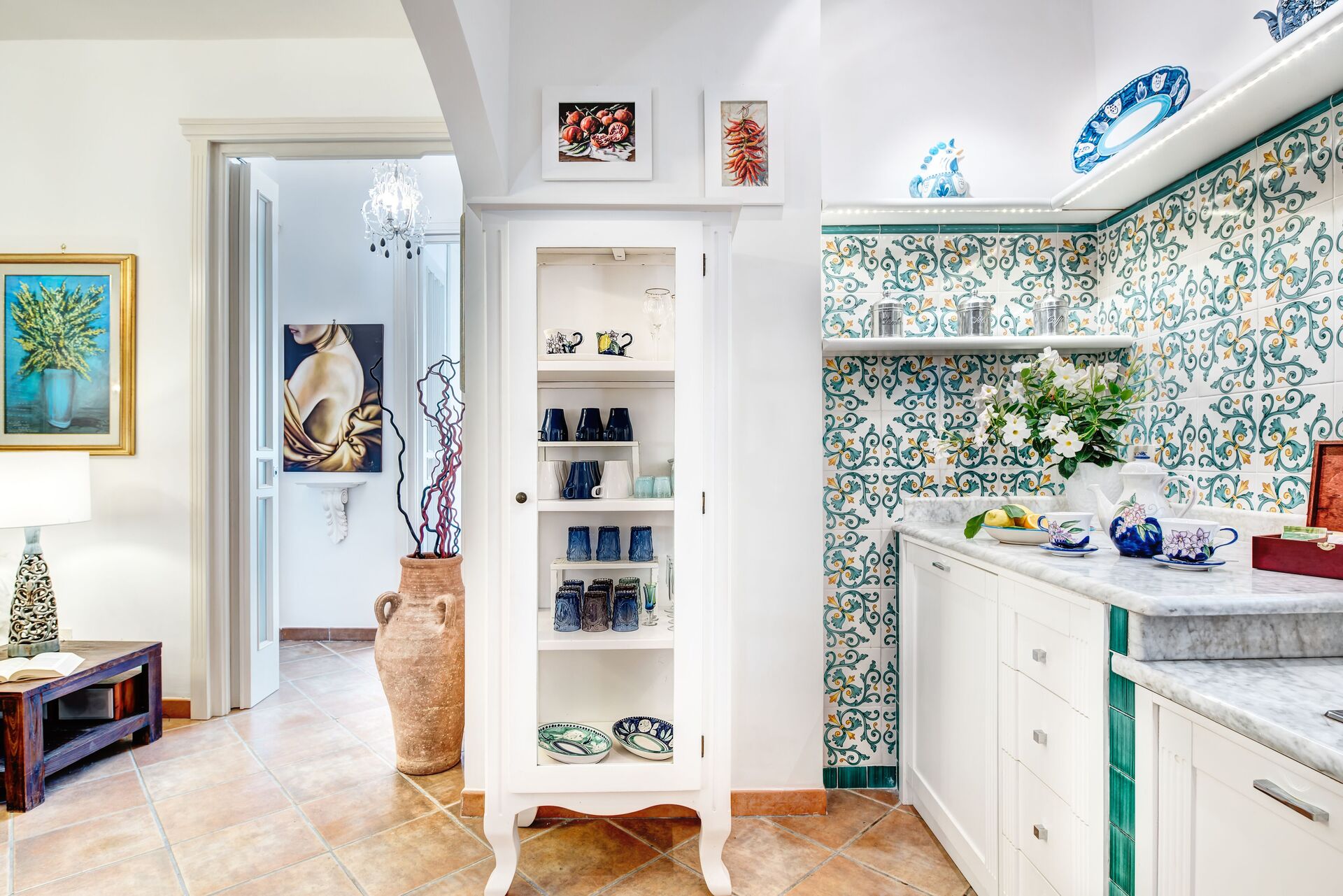 La cucina con piano in marmo e piastrelle mediterranee sono una caratteristica fondamentale della cucina recentemente rinnovata. L'angolo cottura è ordinato e semplicemente attrezzato con tutti gli utensili da cucina necessari per spuntini leggeri e preparazione dei pasti e comprende: un piano cottura a gas a quattro fuochi, forno, frigorifero con congelatore, bollitore e tostapane.