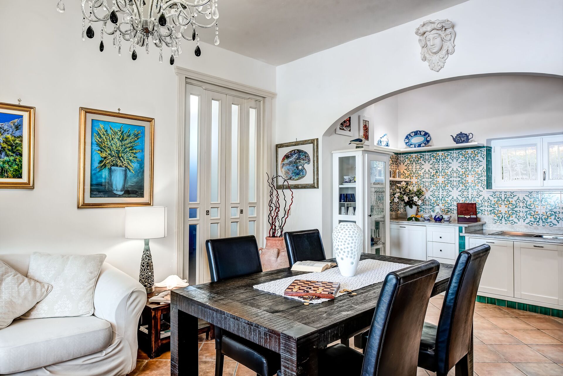 Medusa and the Seahorse Villa ospita fino a 4 persone in una disposizione matrimoniale e due letti singoli. L'ingresso dell'appartamento si apre su una zona soggiorno / pranzo a pianta aperta arredata con tavolo da pranzo in legno e sedie in pelle per 4, un salotto a due posti e una TV a schermo piatto.