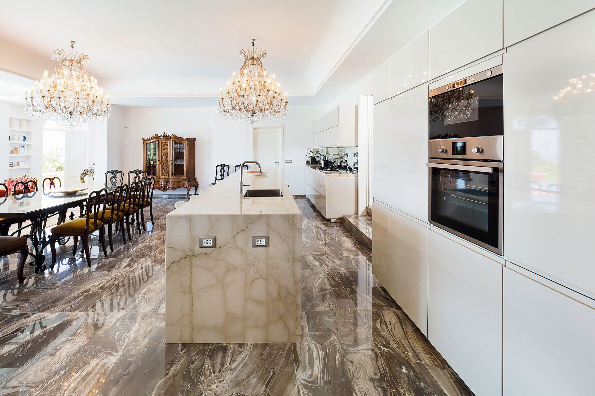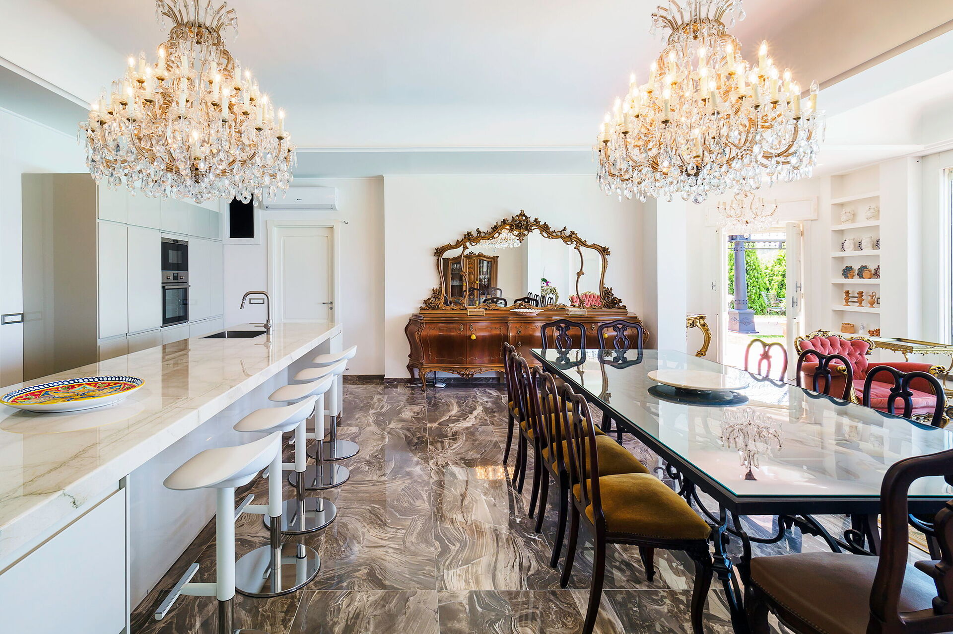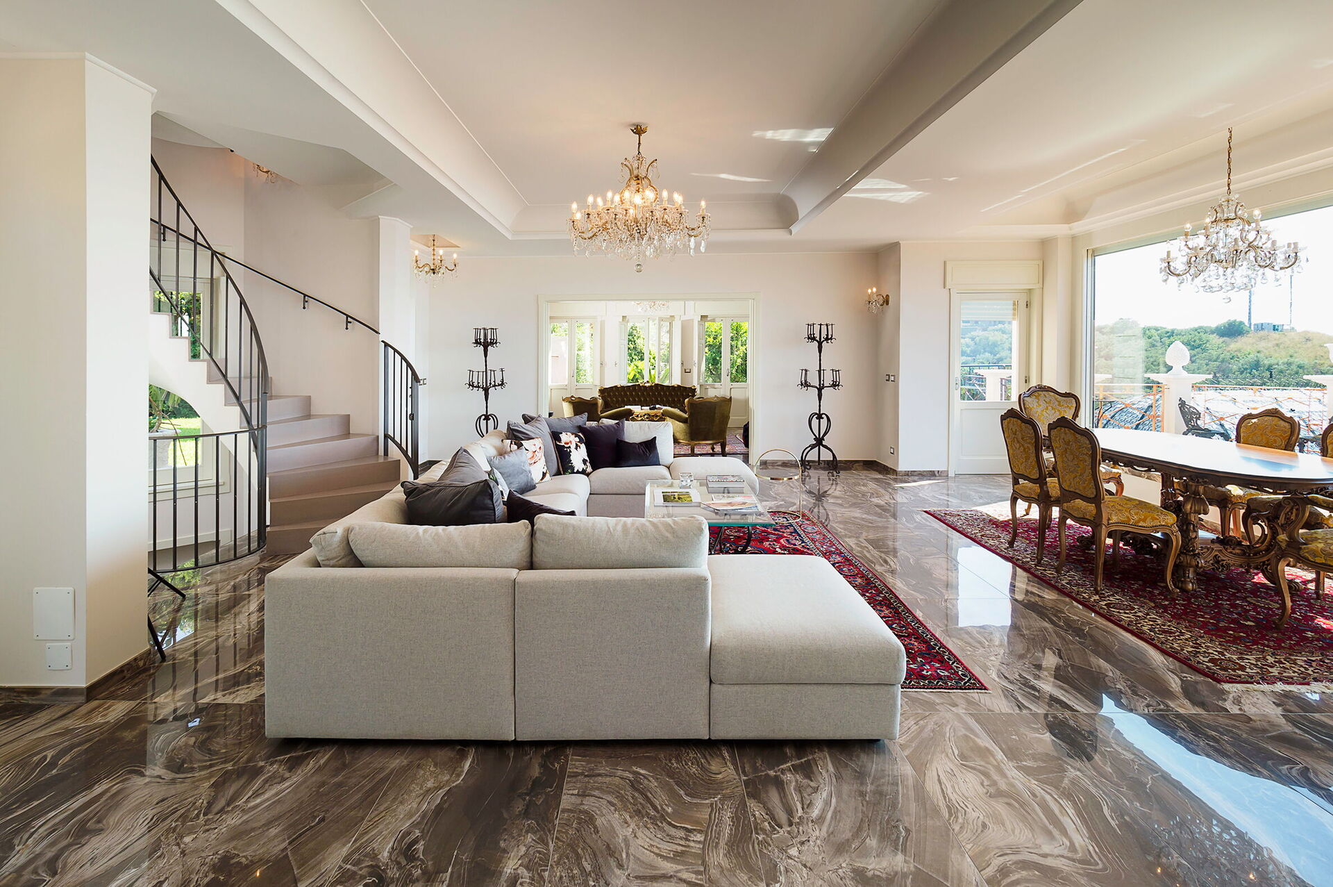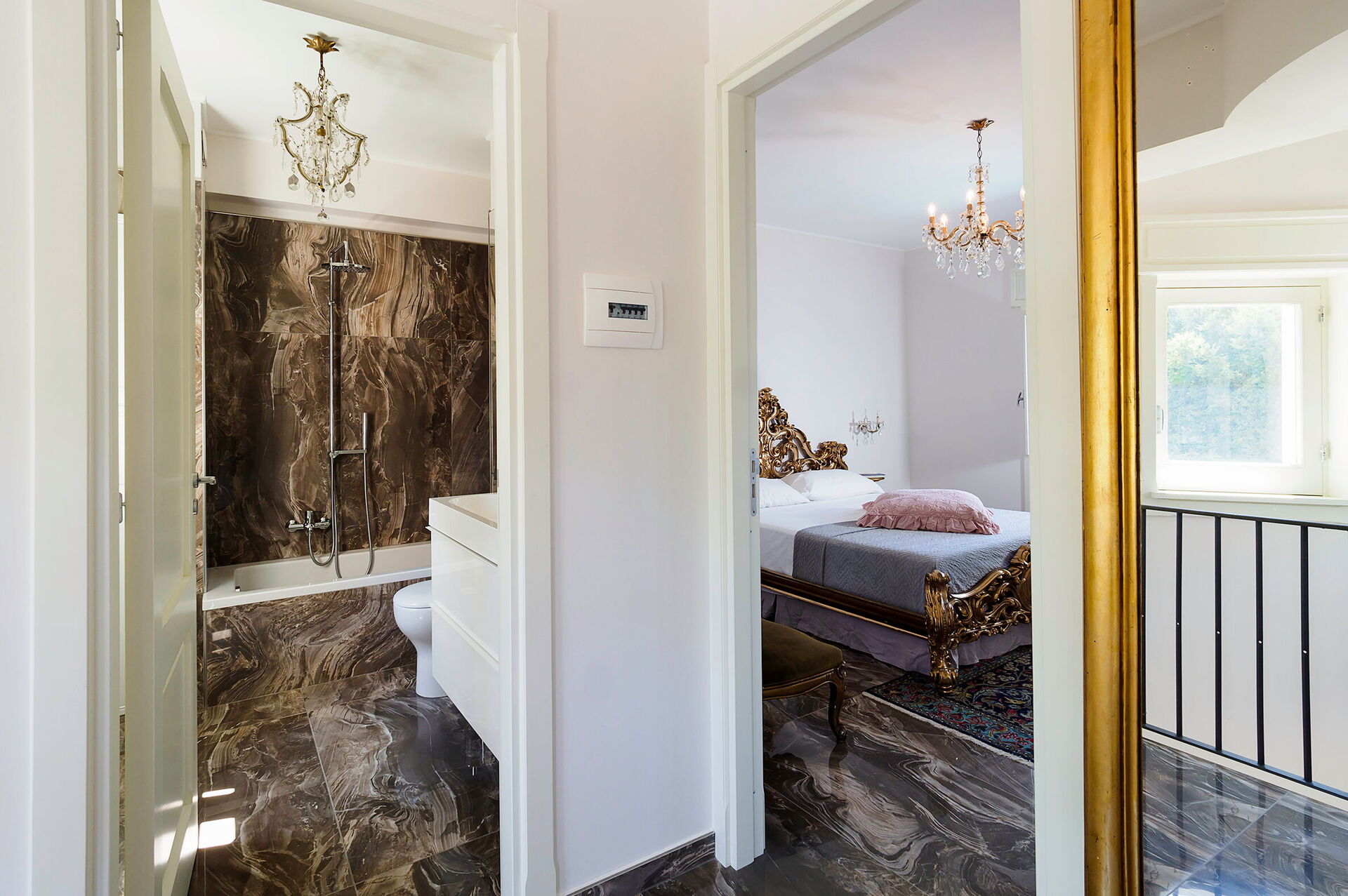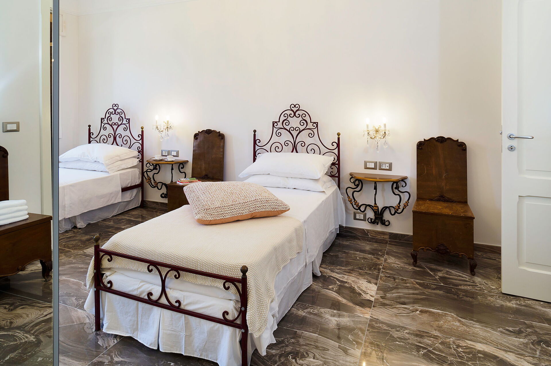 Piano Terra: soggiorno-pranzo, cucina, 1 bagno, lavanderia, 1 camera matrimoniale con bagno con doccia, 1 camera doppia con bagno con doccia, 1 camera matrimoniale, 1 bagno con vasca. Primo Piano: salotto con pianoforte, soggiorno-pranzo, cucina, terrazza. Secondo Piano: 1 camera matrimoniale con bagno con doccia, 1 camera matrimoniale, 1 bagno con vasca.