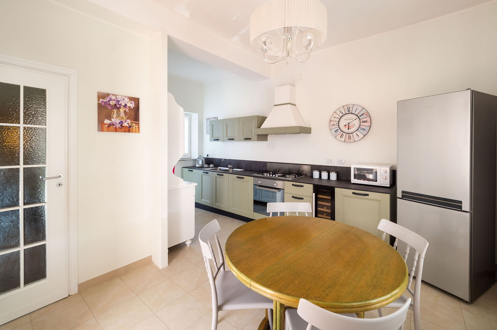 Cucina ben attrezzata, Divano, Forno, Freezer, Frigo, Internet WiFi, Lavastoviglie, Macchina da caffè americano, Rilevatore di fumo, Tavolo da pranzo, Tostapane, Aria condizionata, TV Satellitare, Microonde, Seggiolone, Uscita sulla terrazza