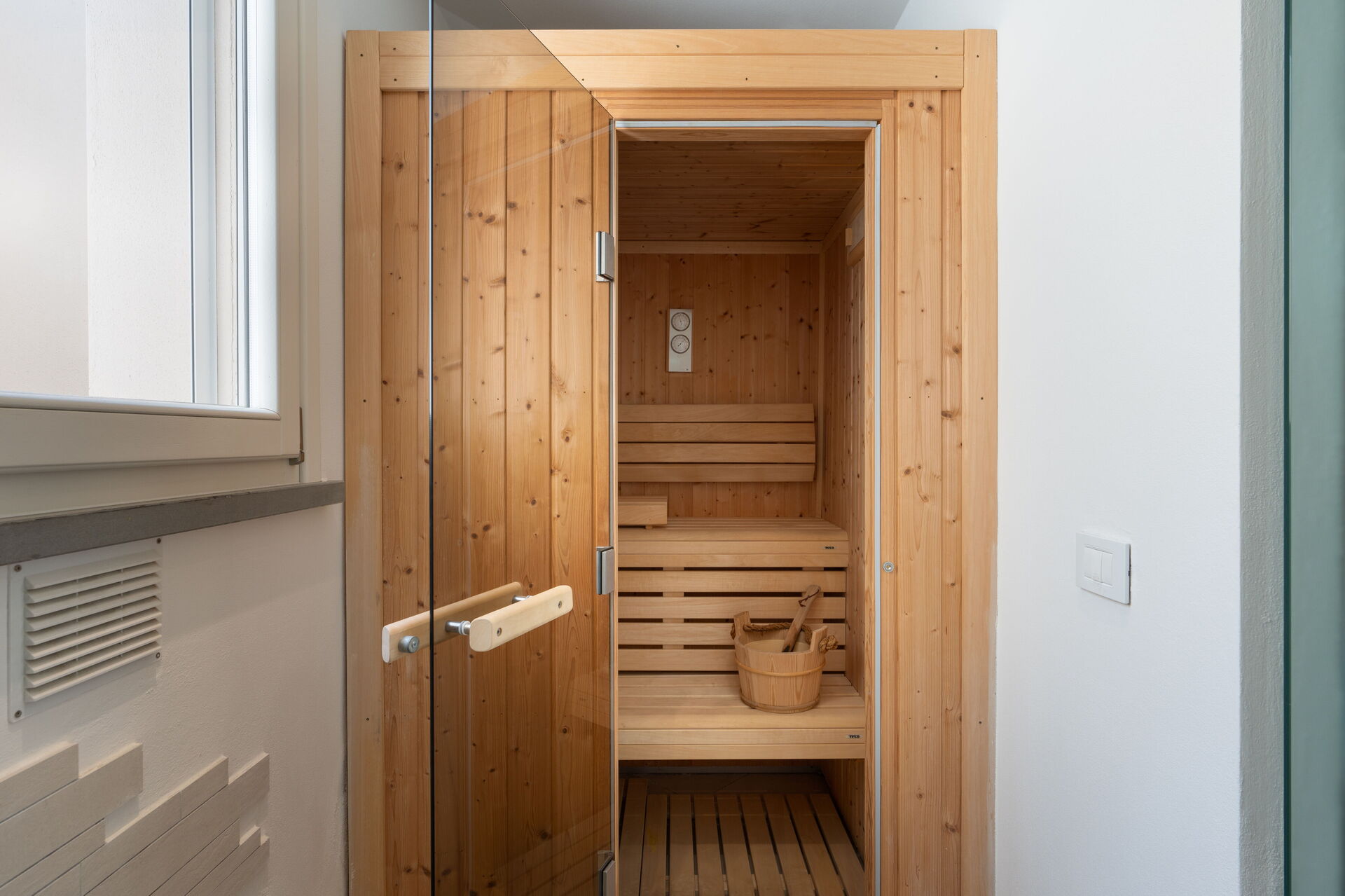 Camera matrimoniale con bagno en suite con doccia , vasca idromassaggio per 8 persone, sauna.