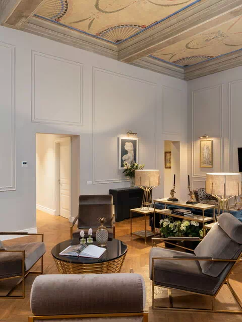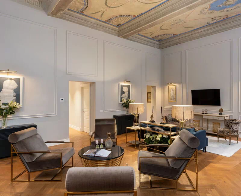 Il soggiorno, impreziosito da affreschi originali del '500, offre un'atmosfera unica ed elegante. Qui troverete un magnifico tavolo da pranzo per 10 persone, comode sedute e una SMART TV da 60 pollici per serate di puro svago. La casa dispone anche di una hall per chiamate lavorative o incontri business.