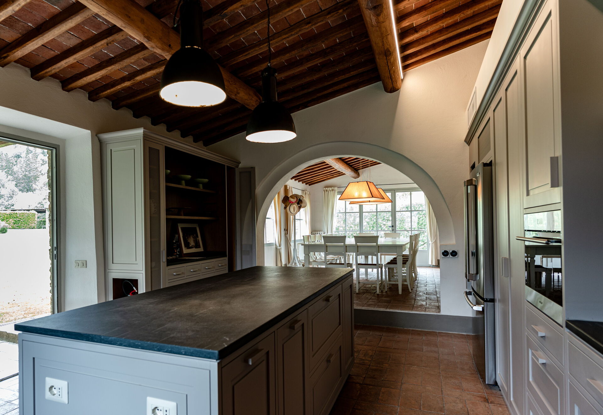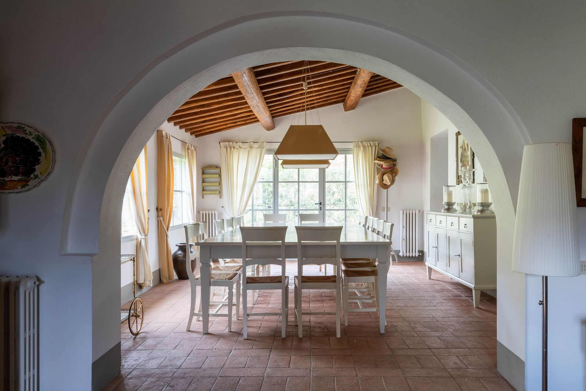 Il cuore pulsante della casa è l’ampia cucina in stile classico, affiancata da una luminosa sala da pranzo che si apre su una veranda avvolta dalle rose. Lo spazioso soggiorno con camino è perfetto per le serate più fresche, mentre la sala TV offre un angolo intimo per rilassarsi. Gli spazi esterni sono un invito alla convivialità: una pergola attrezzata, una zona barbecue e ampi angoli relax dove godere della bellezza del giardino fino a tarda notte.