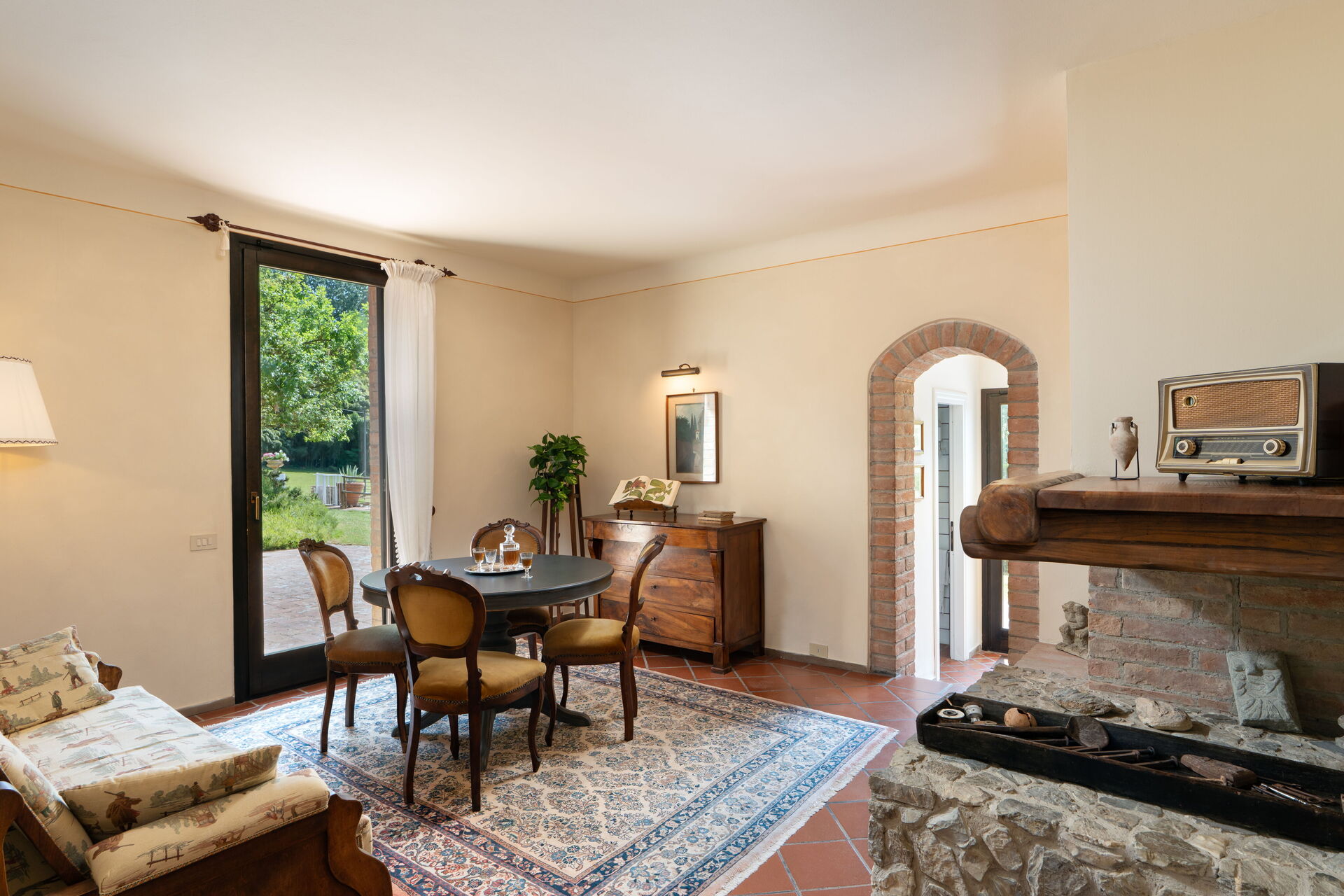 Villa Tramonto è composta al piano terra da una stanza da lettura con il camino incassato, il soggiorno con un altro grande camino storico, un'ampia cucina e una sala da pranzo.