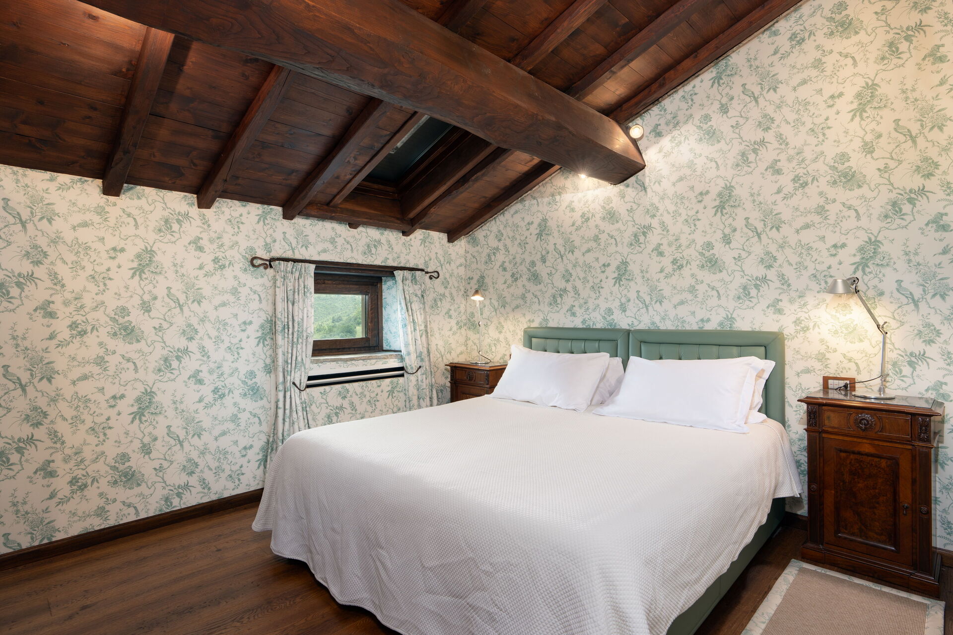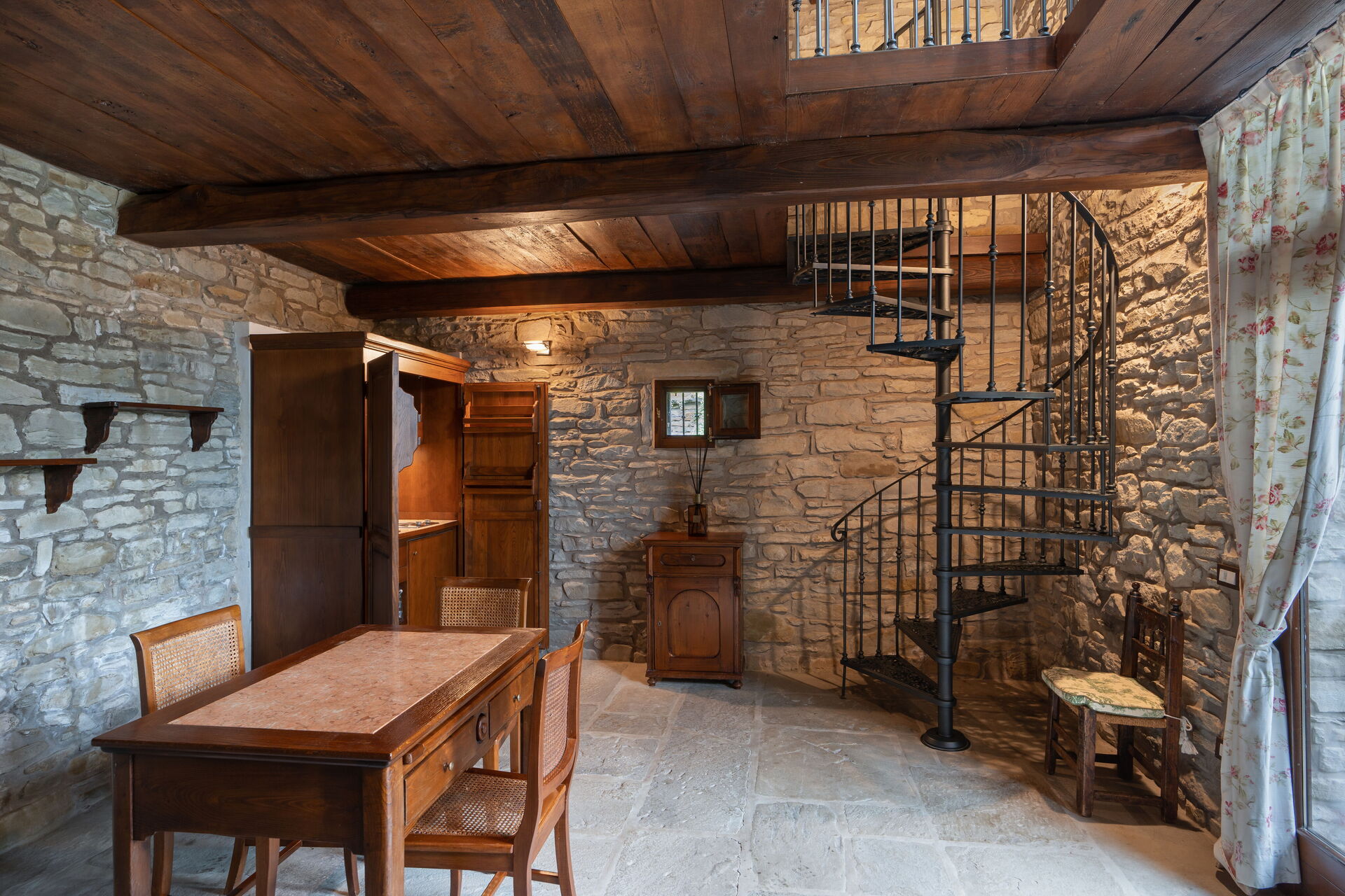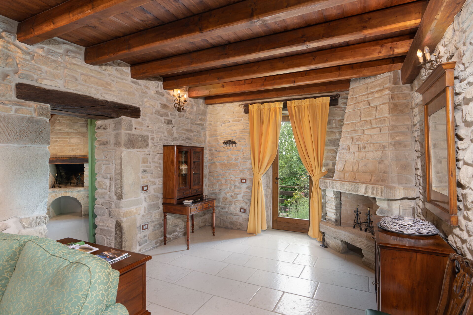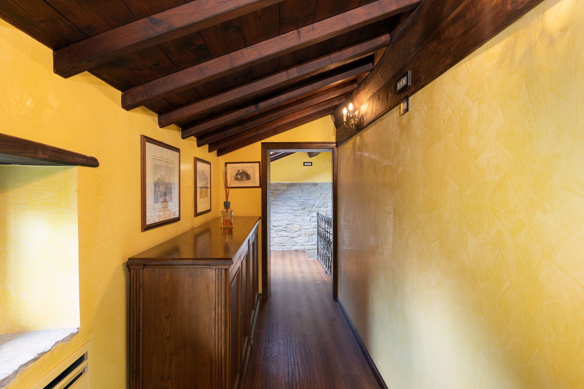 Composta da quattro edifici. Al piano terra del corpo principale troviamo il soggiorno, poltrone e scrittoio, un secondo soggiorno con divani, poltrone e due televisioni, sala da pranzo, due cucine comunicanti una con isola centrale con il caminetto, l'altra in acciaio con piano cottura con fuochi, bagno. Al secondo piano si trovano due camere da letto comunicanti (una con letto matrimoniale e una con due letti singoli) con un bagno in comune, oltre a due camere da letto matrimoniali con il proprio bagno. Un altro edificio ha una cucina con camino al piano terra, un soggiorno con camino, due camere da letto con bagno privato al primo piano (accesso all'esterno). Un ex fienile ospita un soggiorno con divano letto e un armadio con angolo cottura, al primo piano c'è una camera con letto matrimoniale e bagno. La casa più piccola, ma molto graziosa, ha una zona con divano, un bagno e due letti singoli al primo piano.