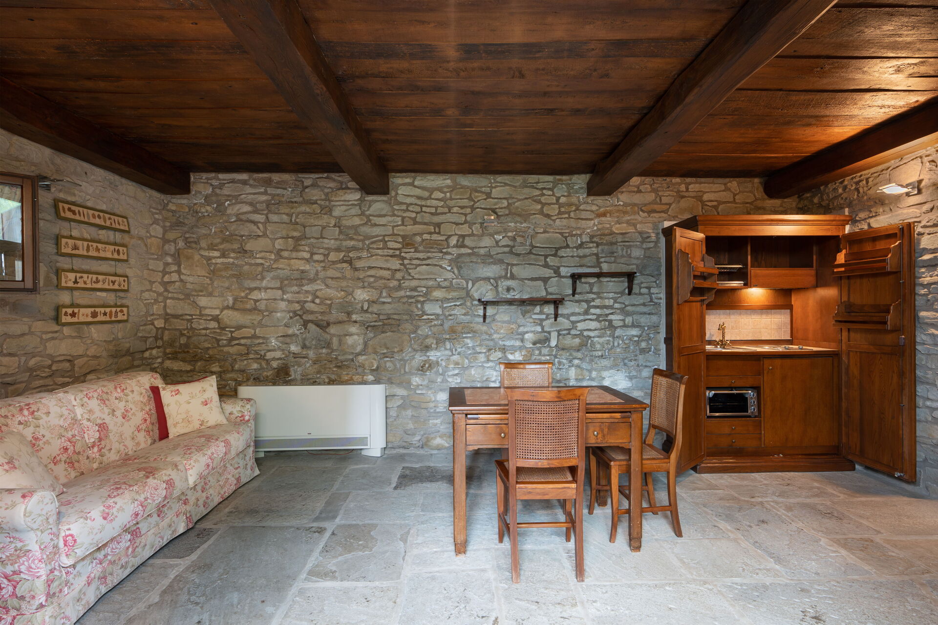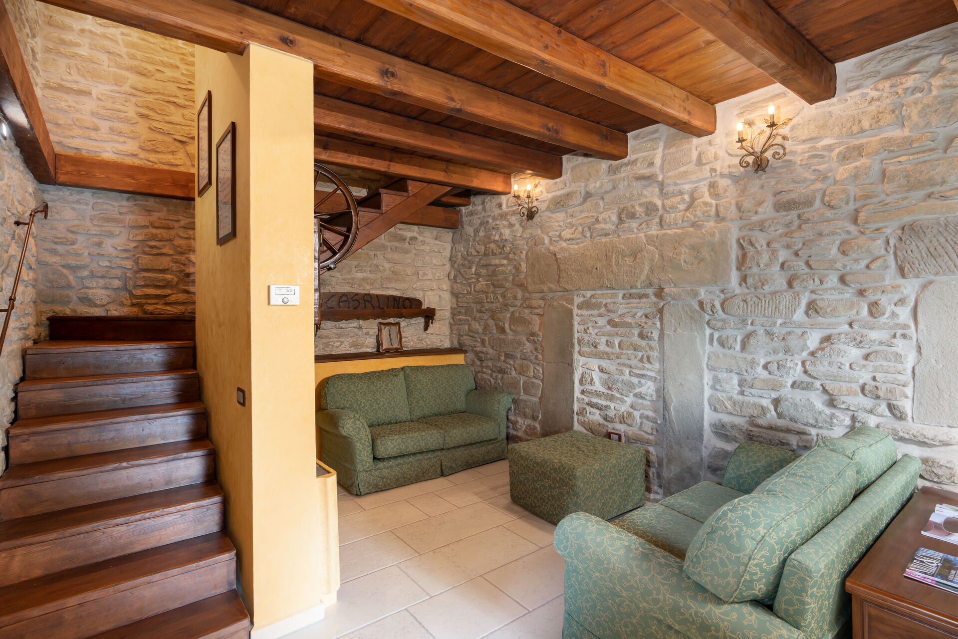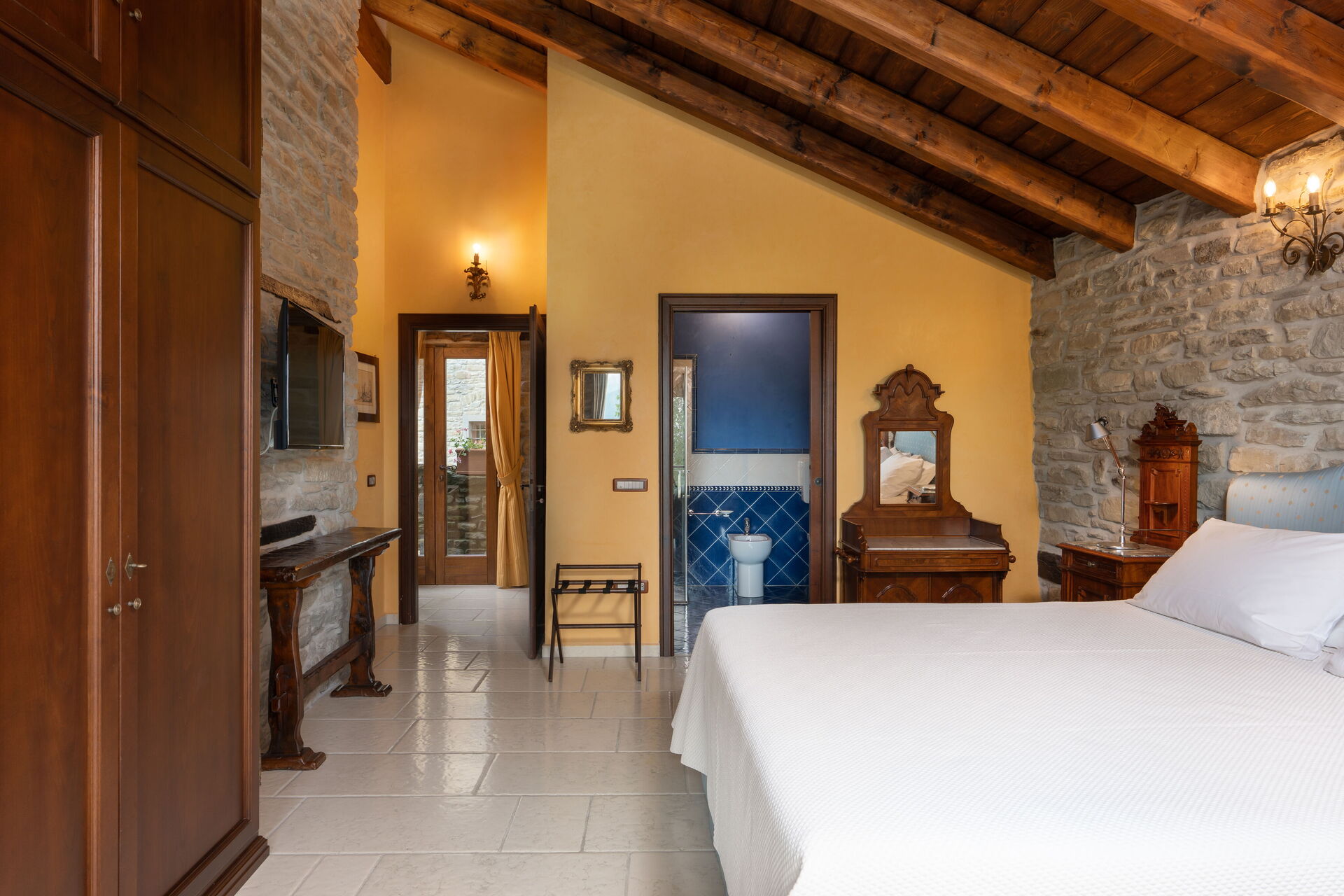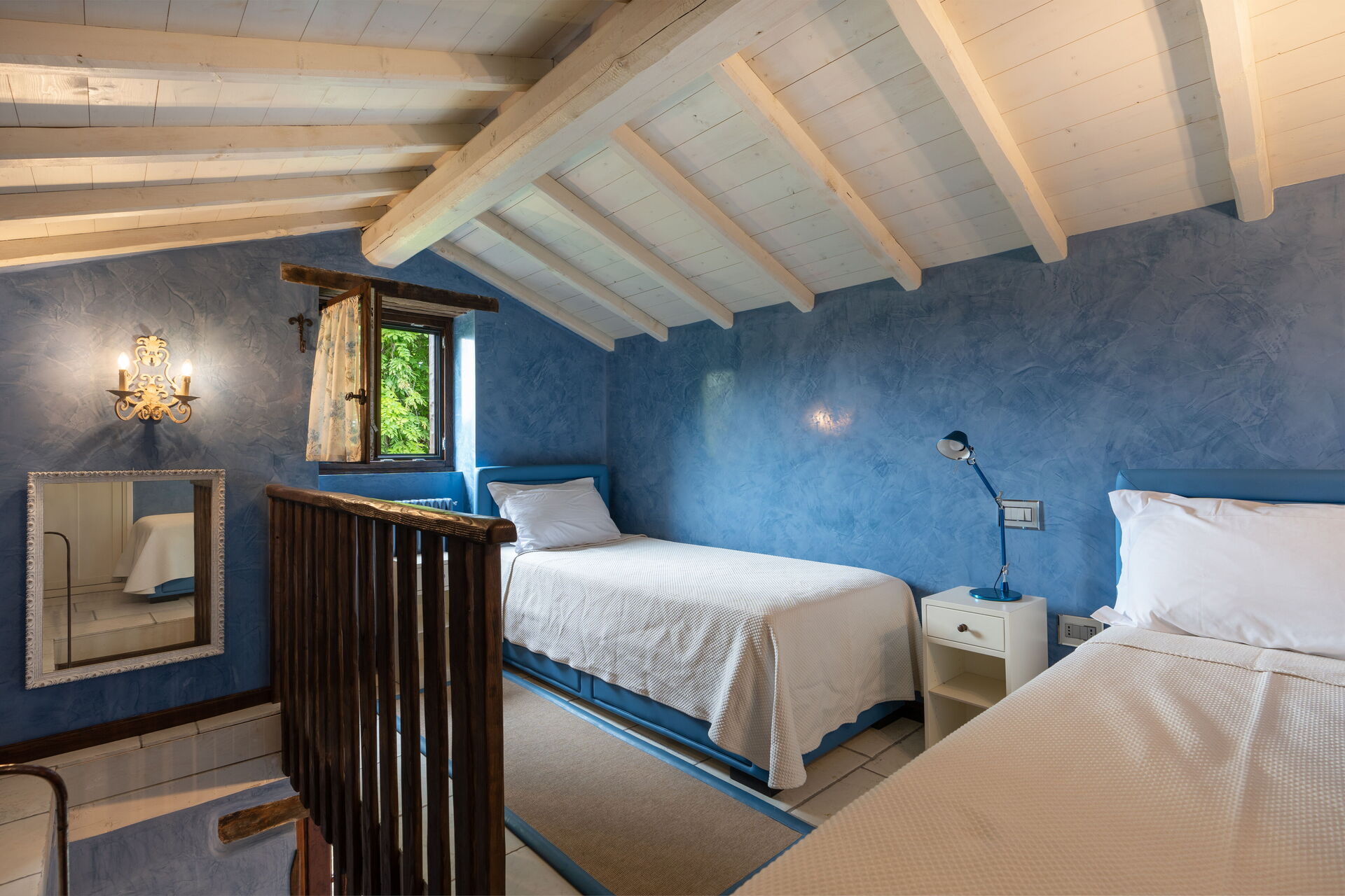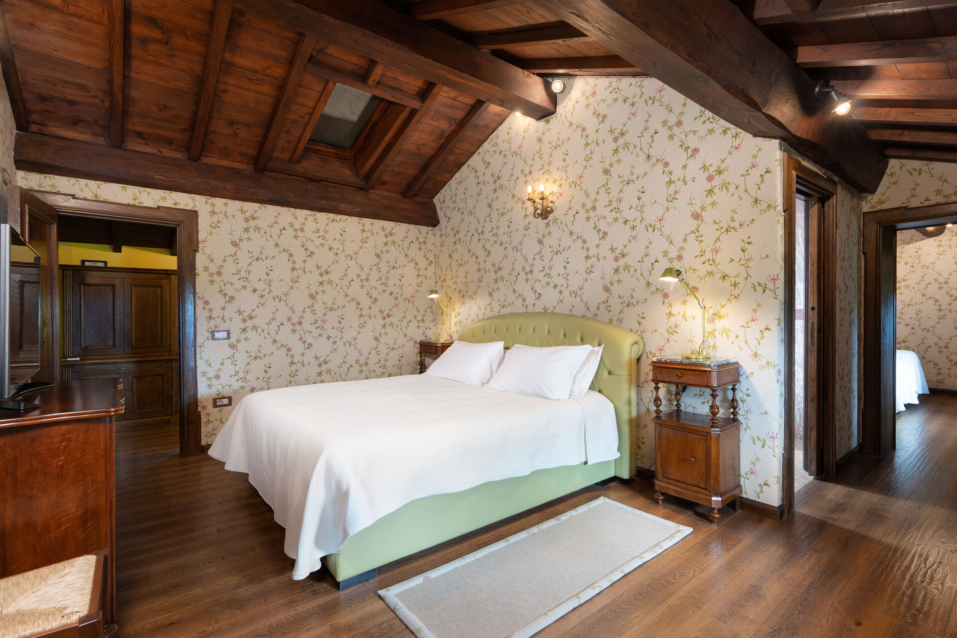 Composta da quattro edifici. Al piano terra del corpo principale troviamo il soggiorno, poltrone e scrittoio, un secondo soggiorno con divani, poltrone e due televisioni, sala da pranzo, due cucine comunicanti una con isola centrale con il caminetto, l'altra in acciaio con piano cottura con fuochi, bagno. Al secondo piano si trovano due camere da letto comunicanti (una con letto matrimoniale e una con due letti singoli) con un bagno in comune, oltre a due camere da letto matrimoniali con il proprio bagno. Un altro edificio ha una cucina con camino al piano terra, un soggiorno con camino, due camere da letto con bagno privato al primo piano (accesso all'esterno). Un ex fienile ospita un soggiorno con divano letto e un armadio con angolo cottura, al primo piano c'è una camera con letto matrimoniale e bagno. La casa più piccola, ma molto graziosa, ha una zona con divano, un bagno e due letti singoli al primo piano.