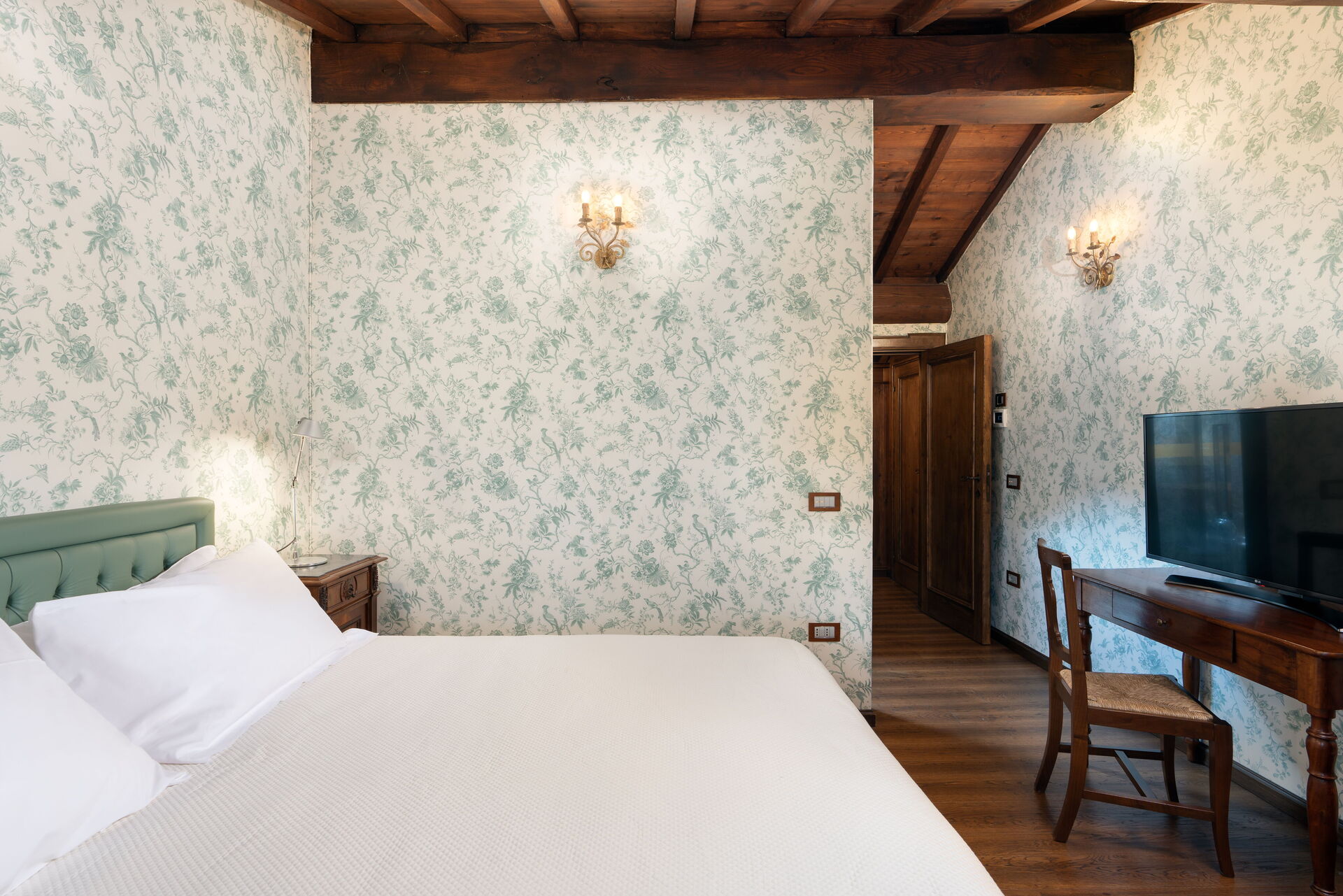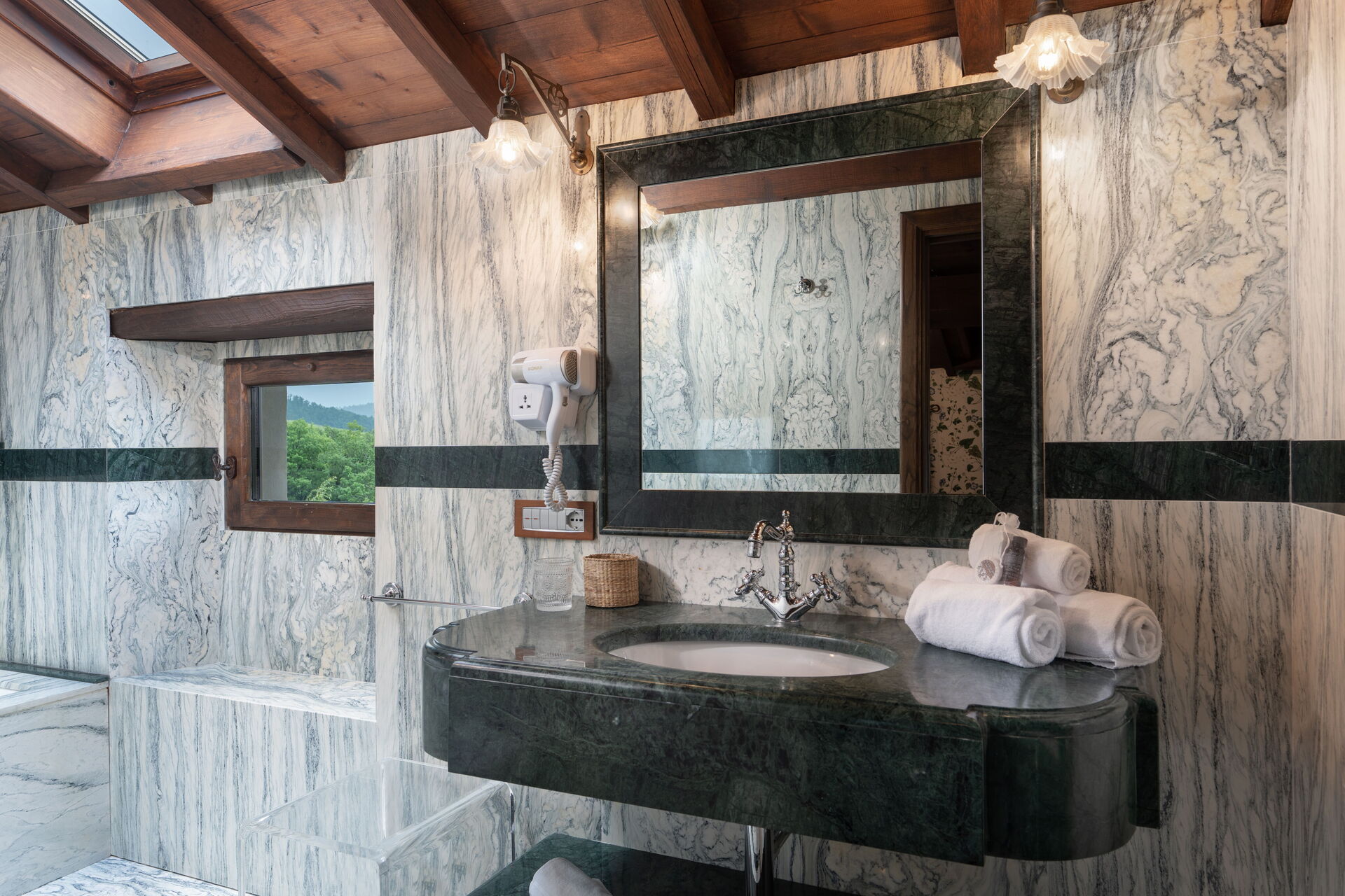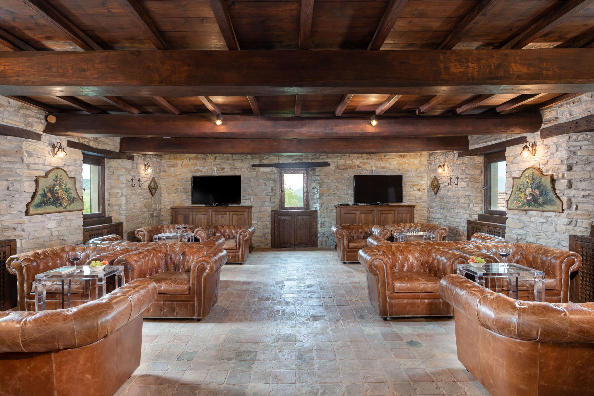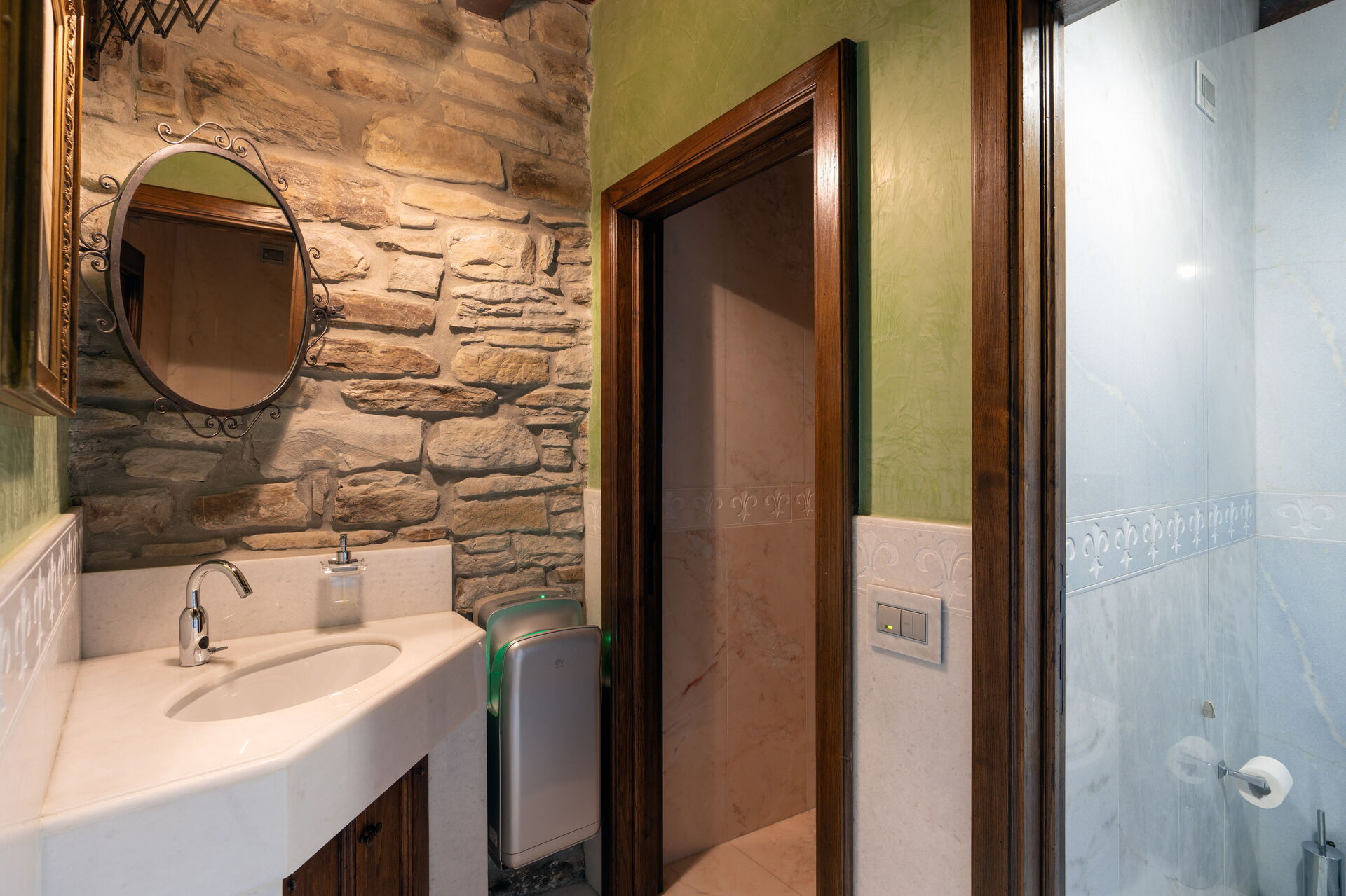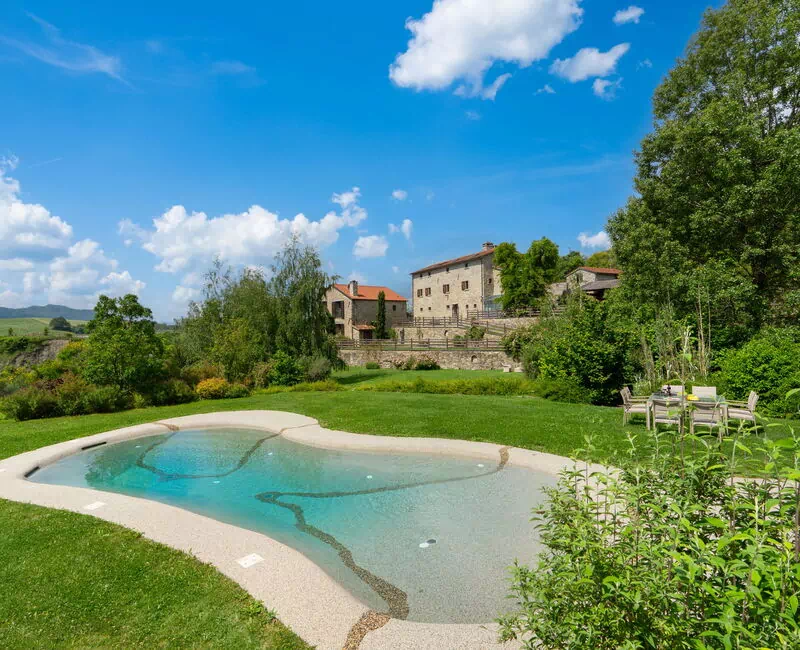 Composta da quattro edifici. Al piano terra del corpo principale troviamo il soggiorno, poltrone e scrittoio, un secondo soggiorno con divani, poltrone e due televisioni, sala da pranzo, due cucine comunicanti una con isola centrale con il caminetto, l'altra in acciaio con piano cottura con fuochi, bagno. Al secondo piano si trovano due camere da letto comunicanti (una con letto matrimoniale e una con due letti singoli) con un bagno in comune, oltre a due camere da letto matrimoniali con il proprio bagno. Un altro edificio ha una cucina con camino al piano terra, un soggiorno con camino, due camere da letto con bagno privato al primo piano (accesso all'esterno). Un ex fienile ospita un soggiorno con divano letto e un armadio con angolo cottura, al primo piano c'è una camera con letto matrimoniale e bagno. La casa più piccola, ma molto graziosa, ha una zona con divano, un bagno e due letti singoli al primo piano.