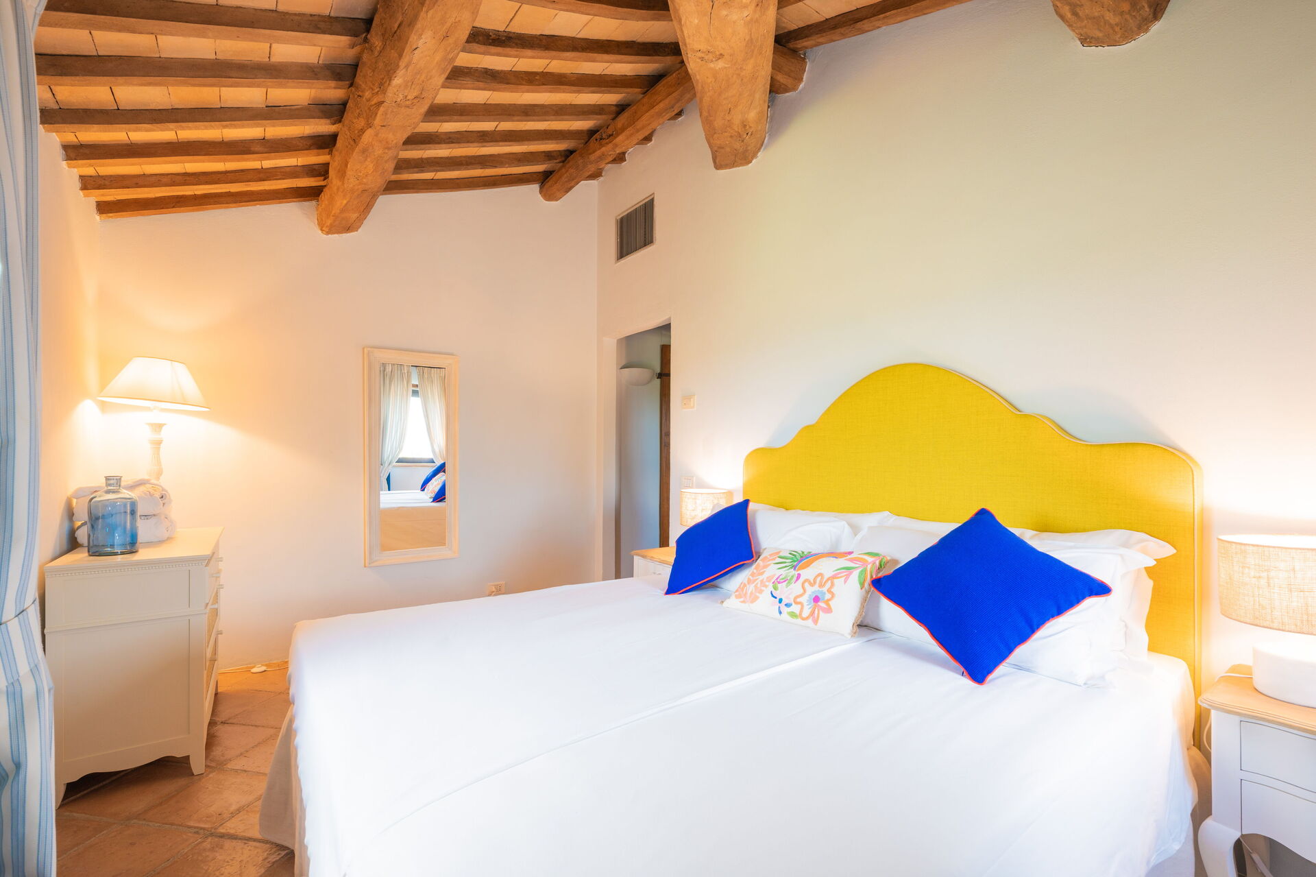 Le camere da letto sono distribuite tra la sontuosa villa principale e l'accogliente appartamento. All'interno della villa principale, si trovano tre eleganti camere da letto con lussuosi letti king size e bagni privati, mentre altre tre camere da letto offrono due comodi letti singoli ciascuna, una delle quali dotata di bagno en-suite.