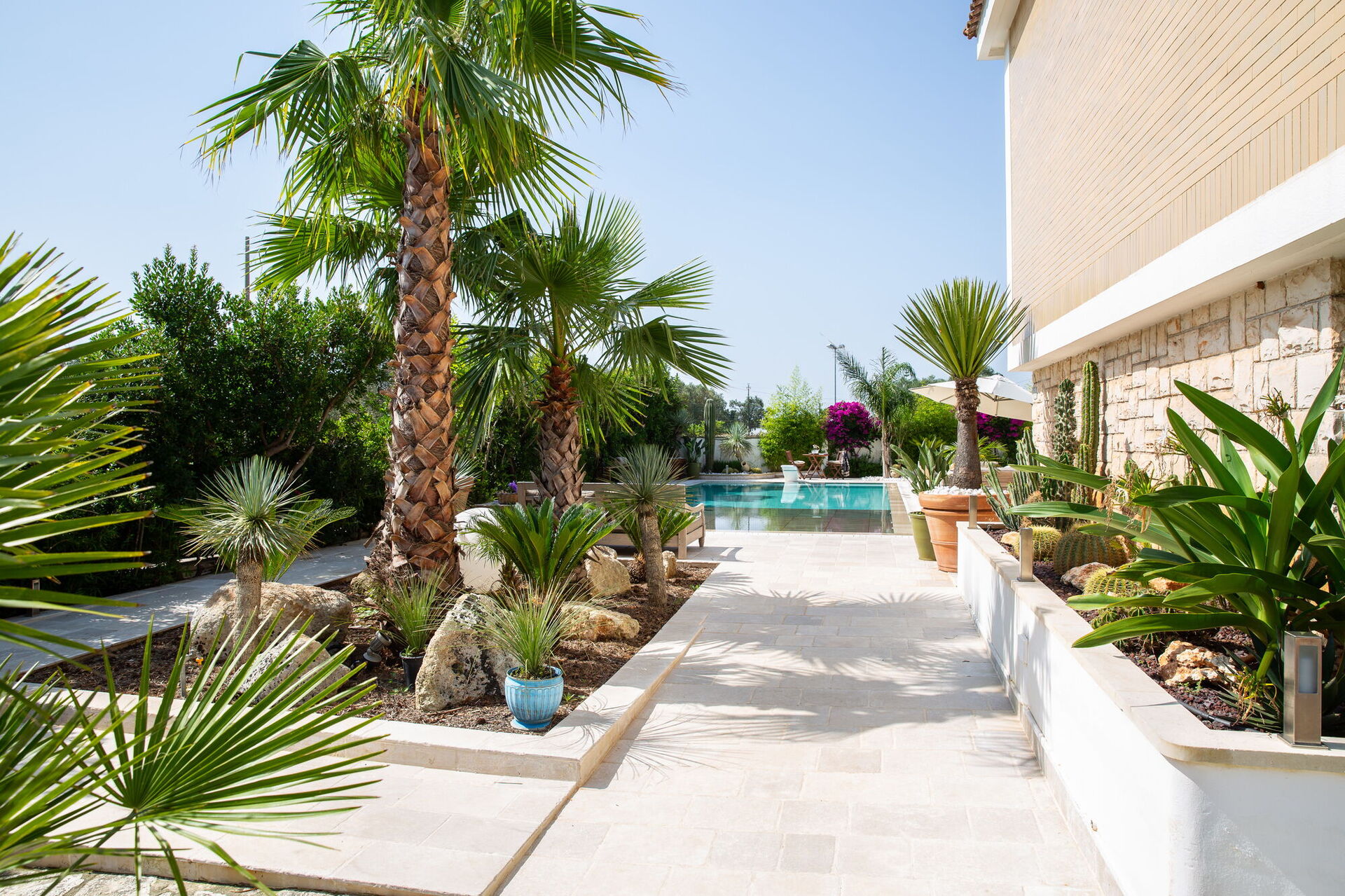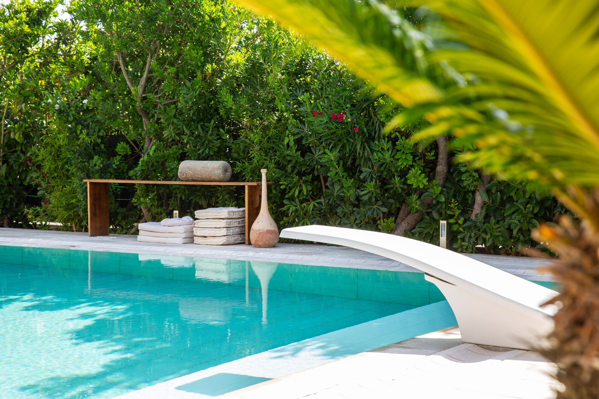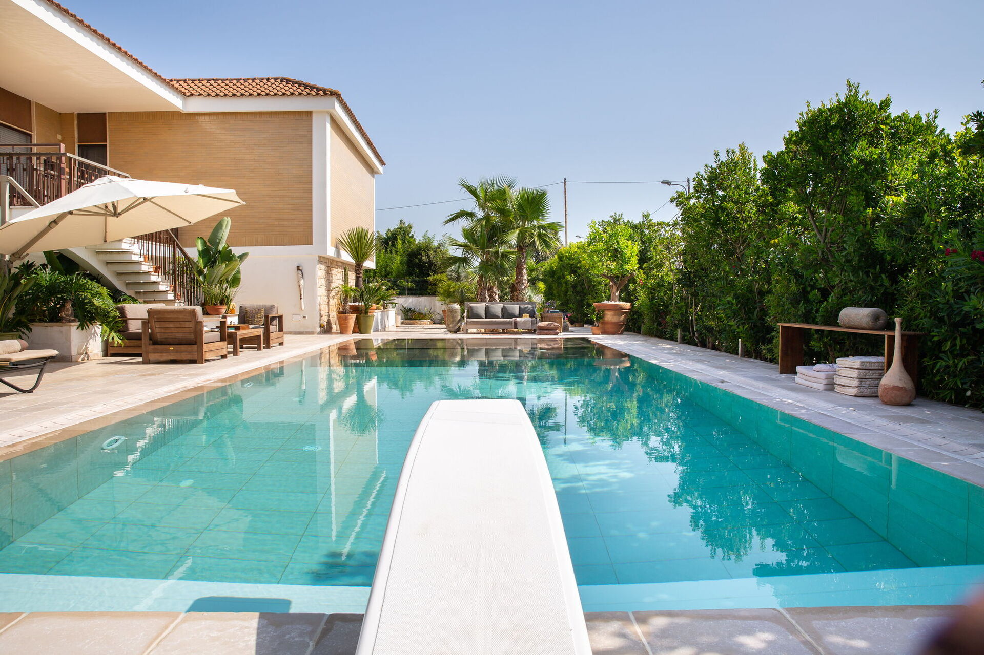 Completely surrounded by balconies overlooking the garden, the Villa will welcome you in its verdant open spaces between palm trees and tall hedges that will guarantee you absolute privacy. At your disposal an extraordinary swimming pool with diving board whose pool is arranged on several levels making it also suitable for children. On it opens a large patio equipped with sofas, armchairs and small tables. By the pool there is also a beautiful stone solarium with sun loungers and parasols.