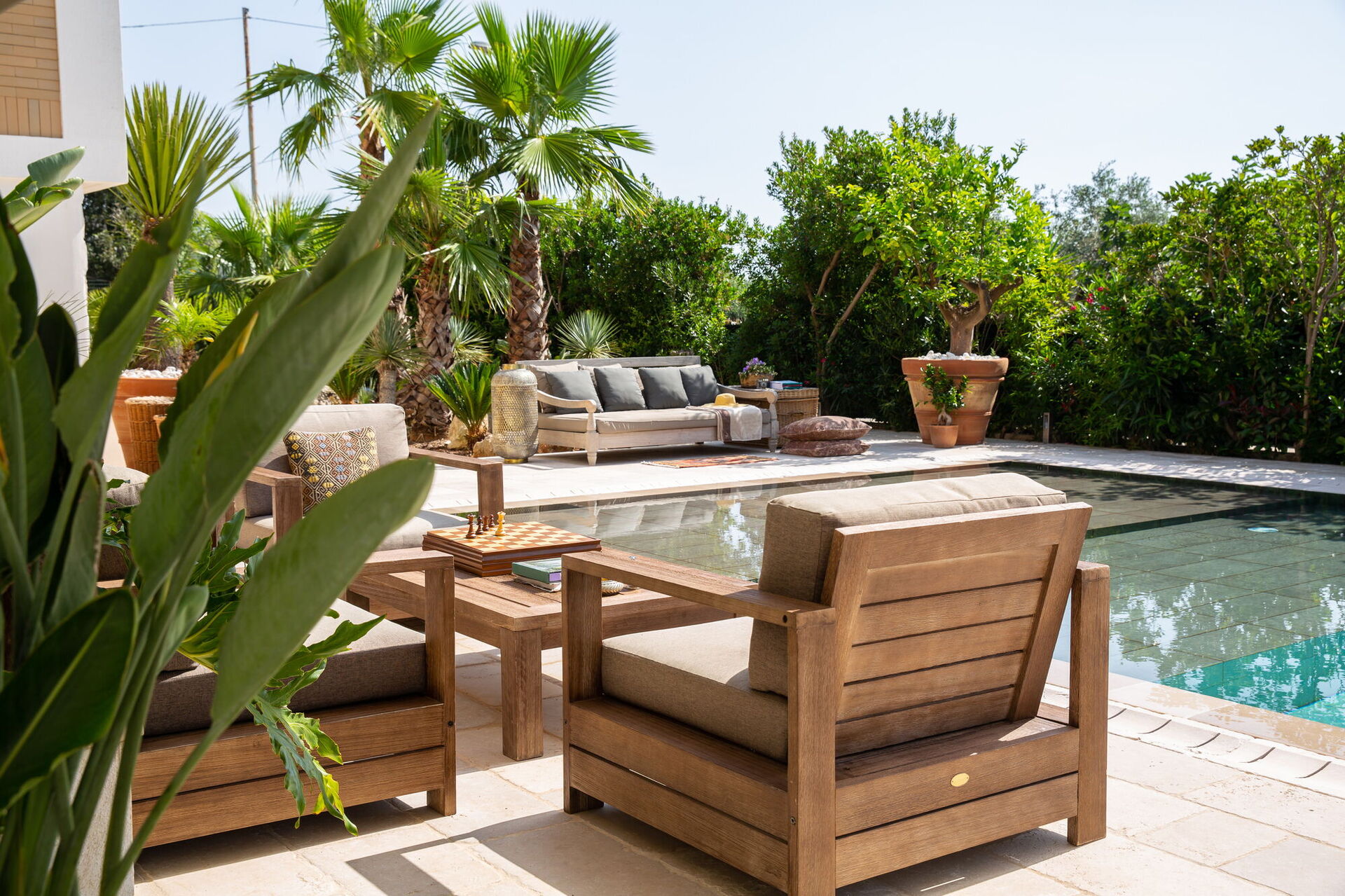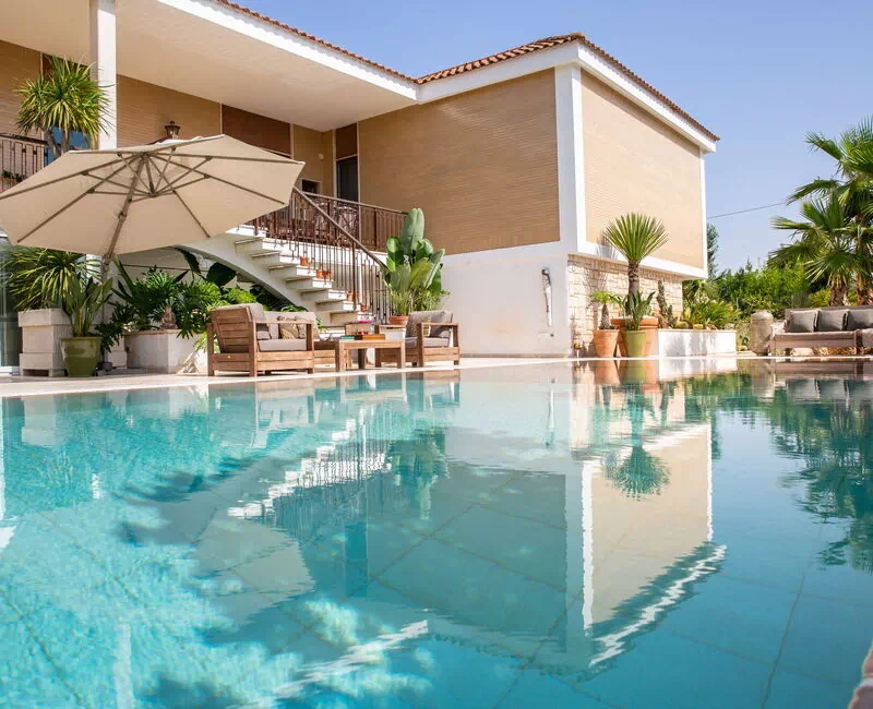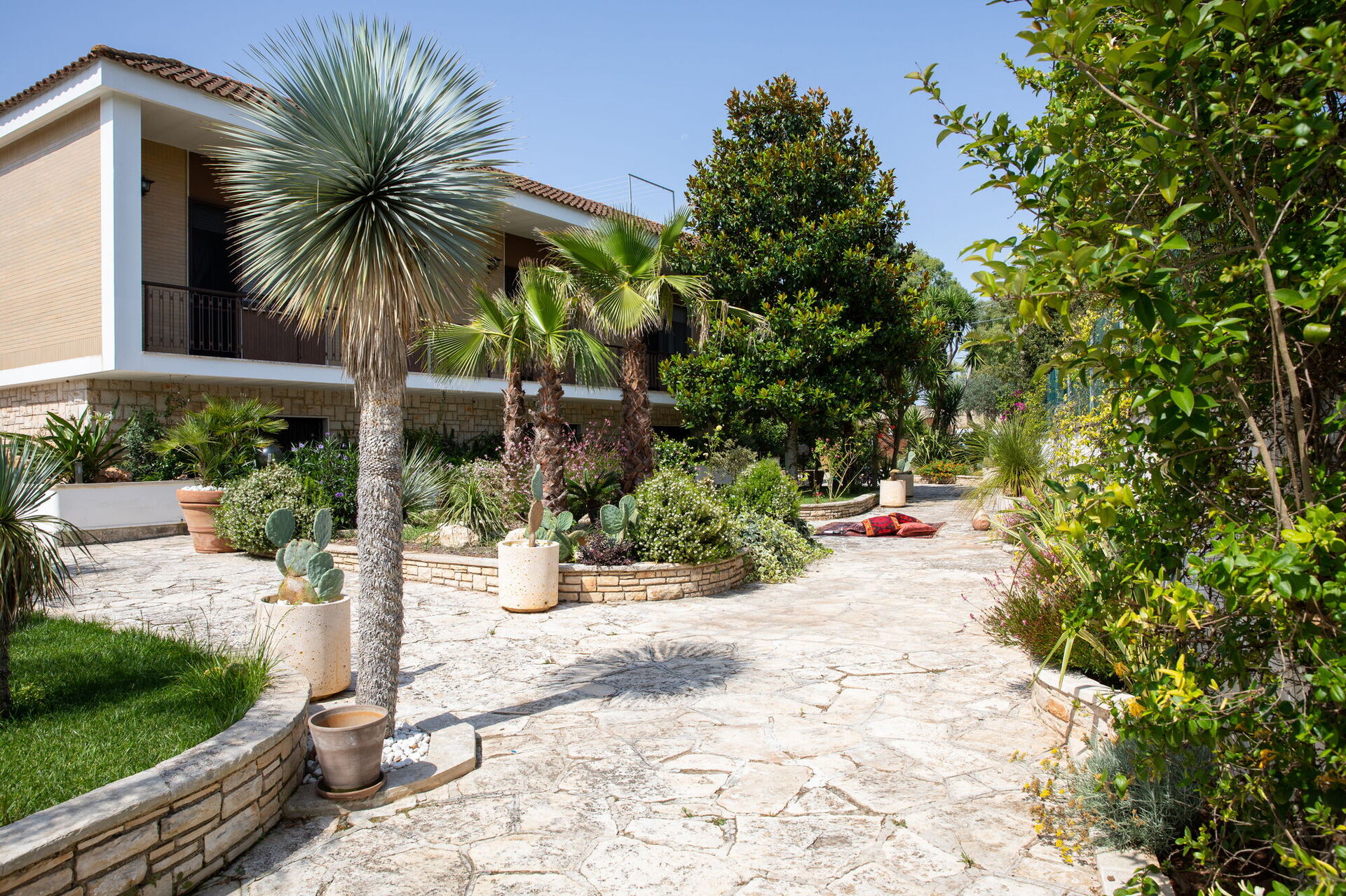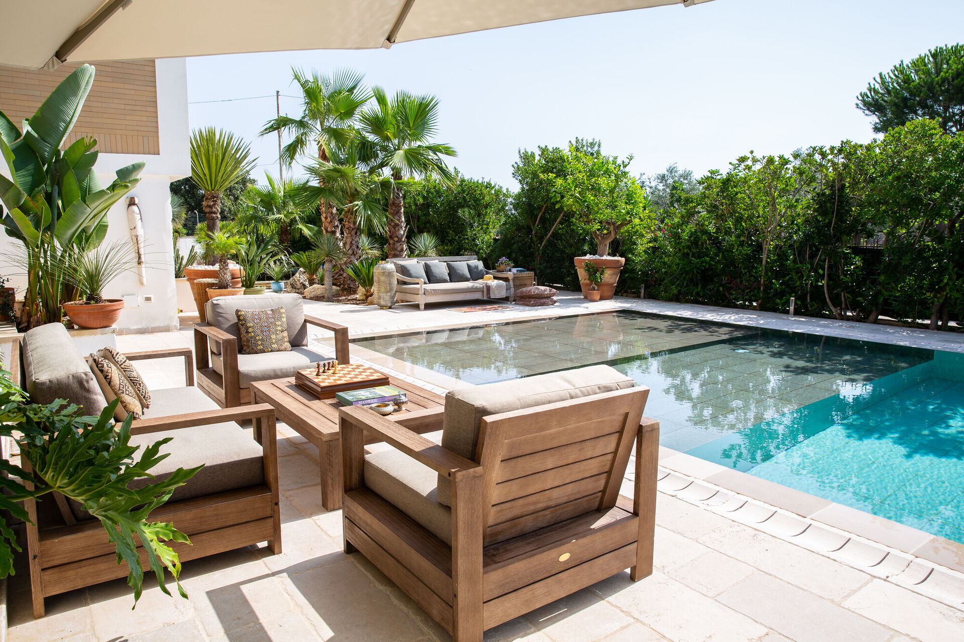 Completely surrounded by balconies overlooking the garden, the Villa will welcome you in its verdant open spaces between palm trees and tall hedges that will guarantee you absolute privacy. At your disposal an extraordinary swimming pool with diving board whose pool is arranged on several levels making it also suitable for children. On it opens a large patio equipped with sofas, armchairs and small tables. By the pool there is also a beautiful stone solarium with sun loungers and parasols.