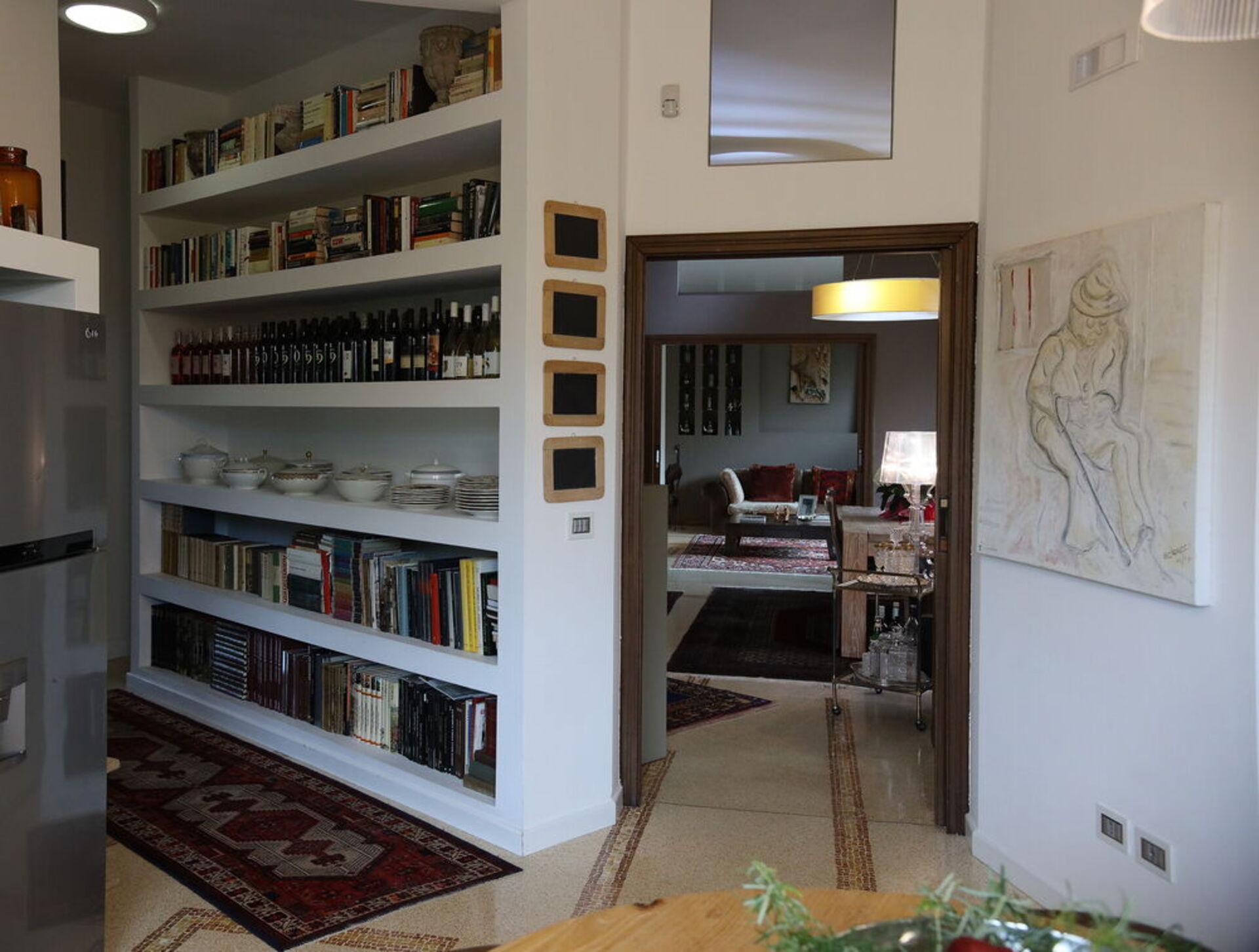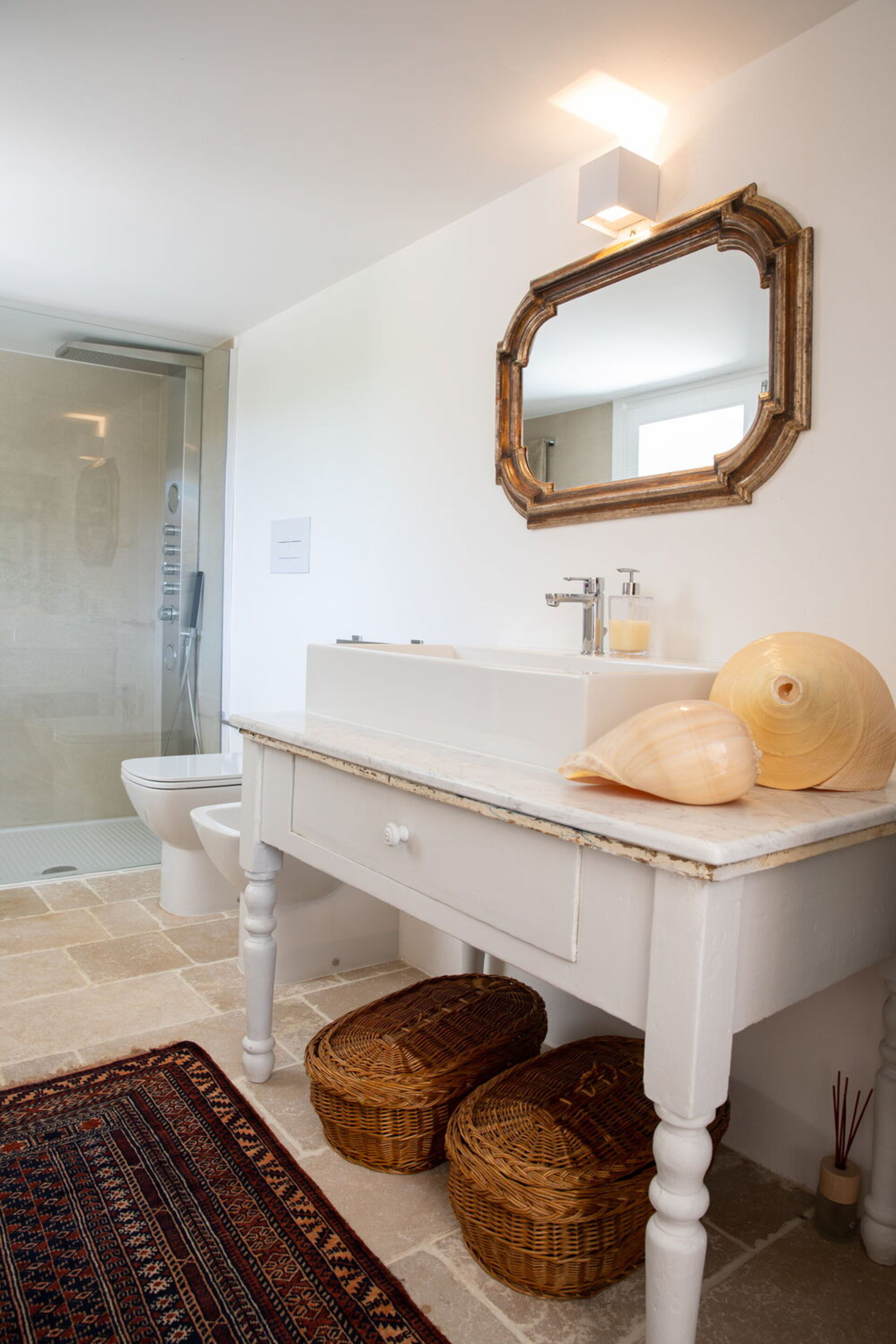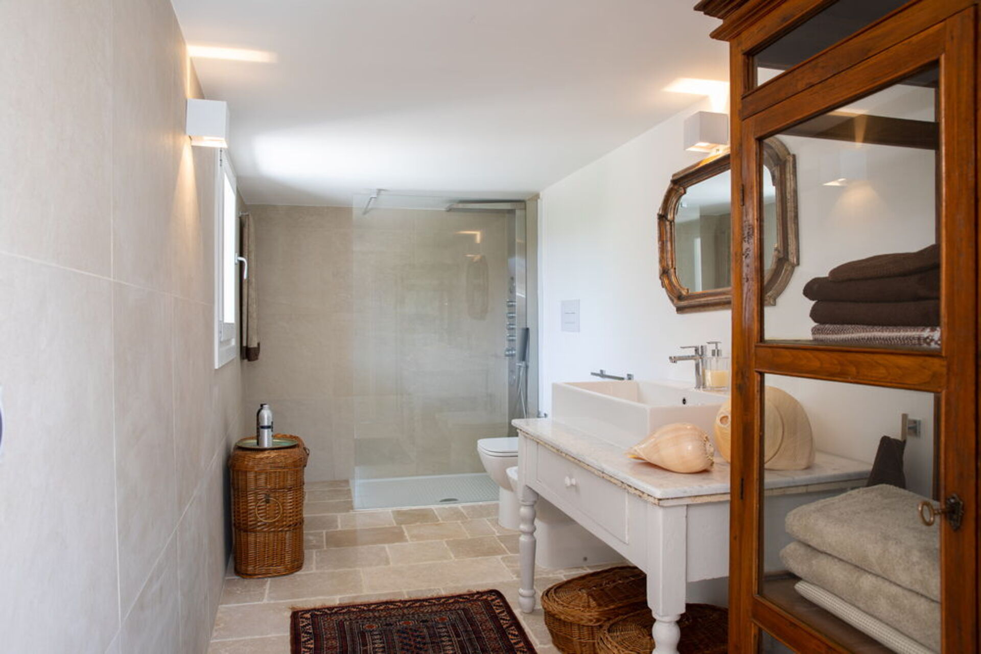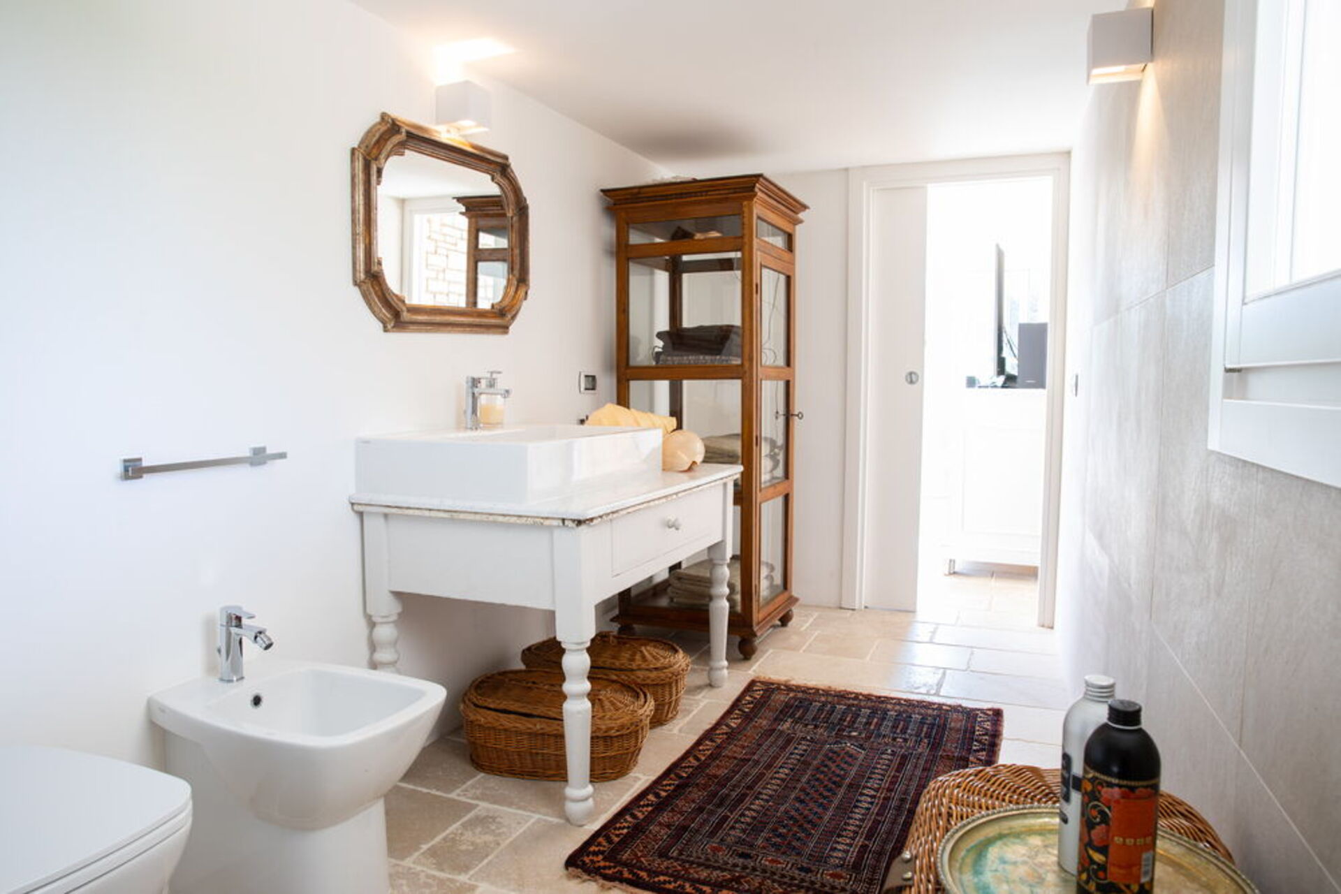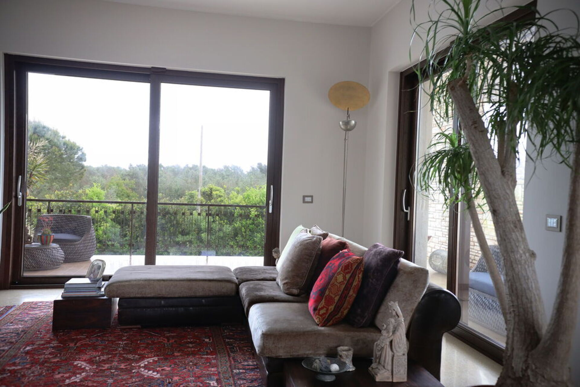 The interior spaces are welcoming and bright and endowed with a great personality with fine furniture and unique finishes. Wooden window frames with large openings, colored carpets on the floor, designer lamps, will mark your enchanted passage from one room to another throughout the living area where low tables, armchairs and chaise longues will invite you to truly disconnect from everyday life, giving peace even to your gaze.