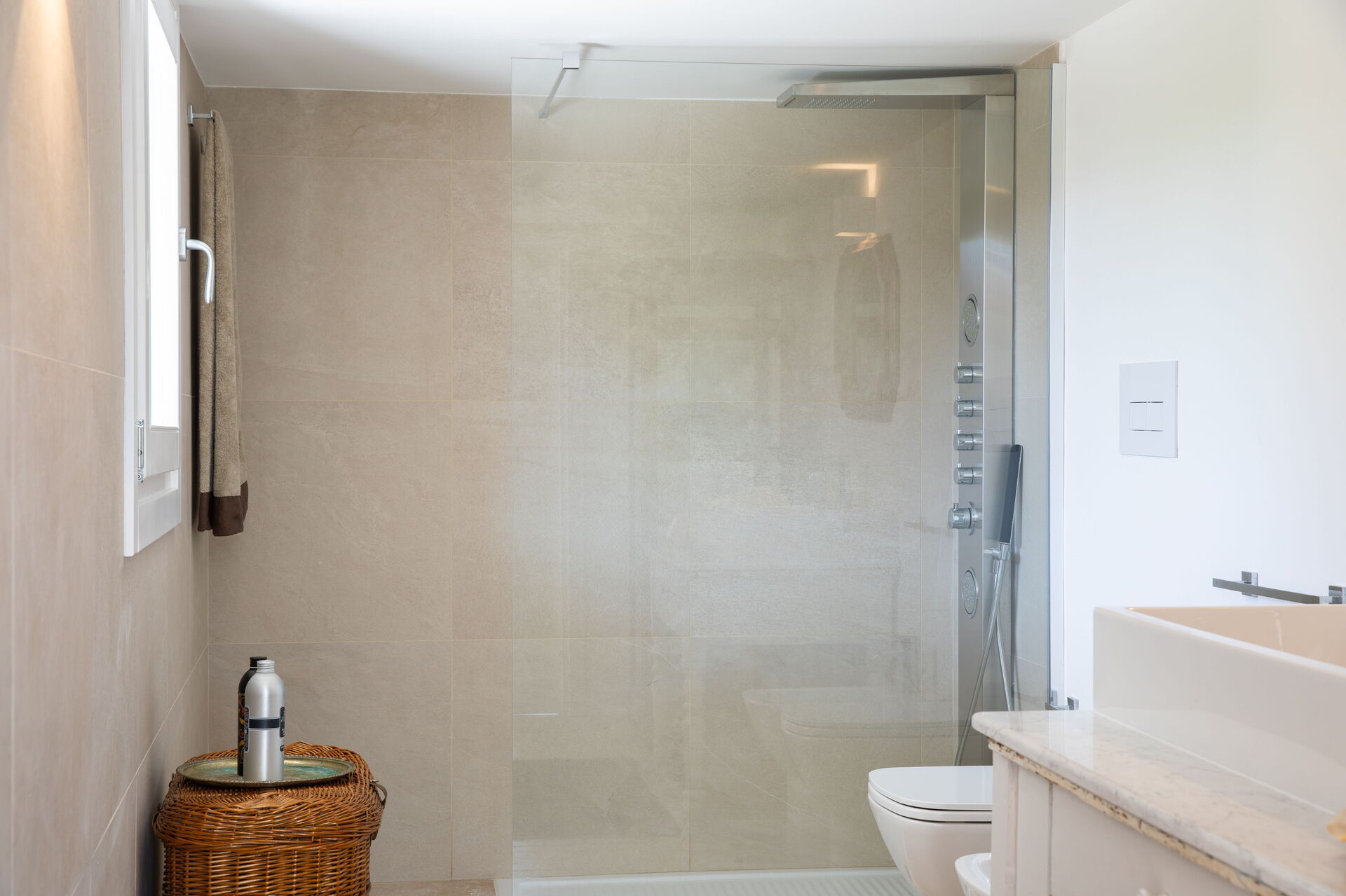 Surrounded by greenery, with huge outdoor spaces, the house can accommodate up to 13 people with its 5 bedrooms all equipped with bathrooms.