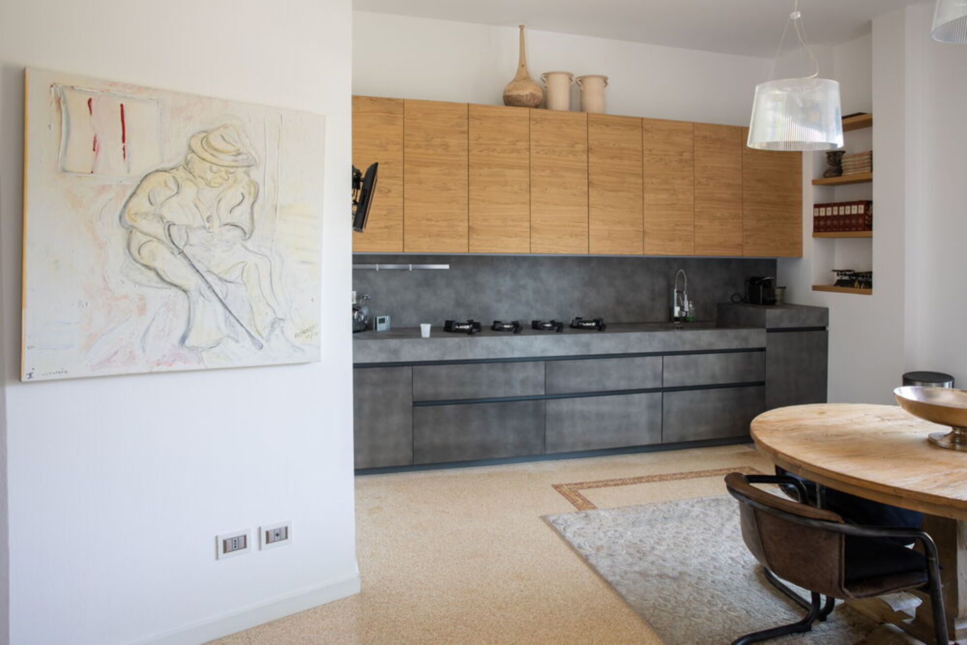 At the service of the outdoor area there is also a modular space with a round table and wicker armchairs for 6 people and a large and bright kitchen with double-hinged American fridge, dishwasher, oven, microwave, sink and coffee machine. There is also a barbecue area outside.