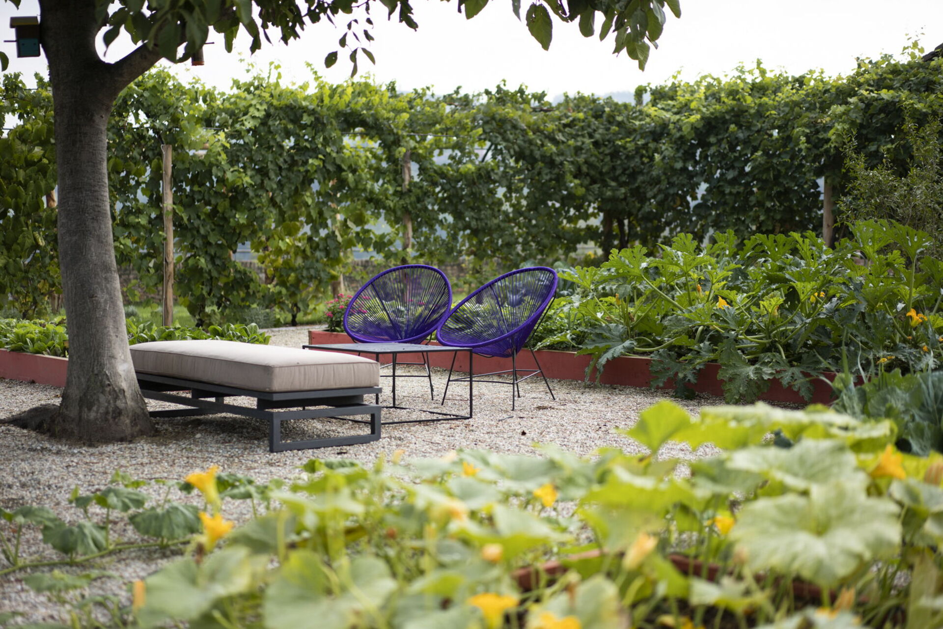 The Relais develops around the ancient farmyard, perfumed with roses and aromatic plants. A pergola of centuries-old vines, a vegetable garden with an antique flavour and a swimming pool reflecting the sky and rows of vines surround a rare maritime pine, silent guardian of three hundred years of life.