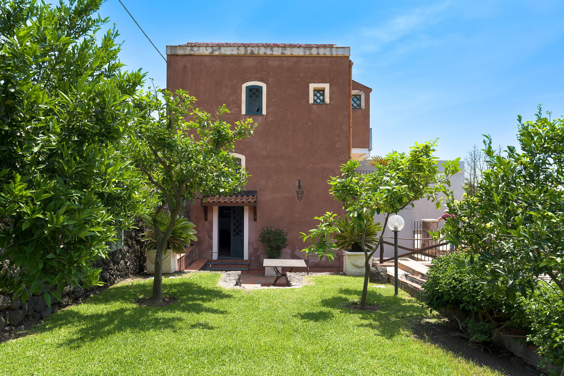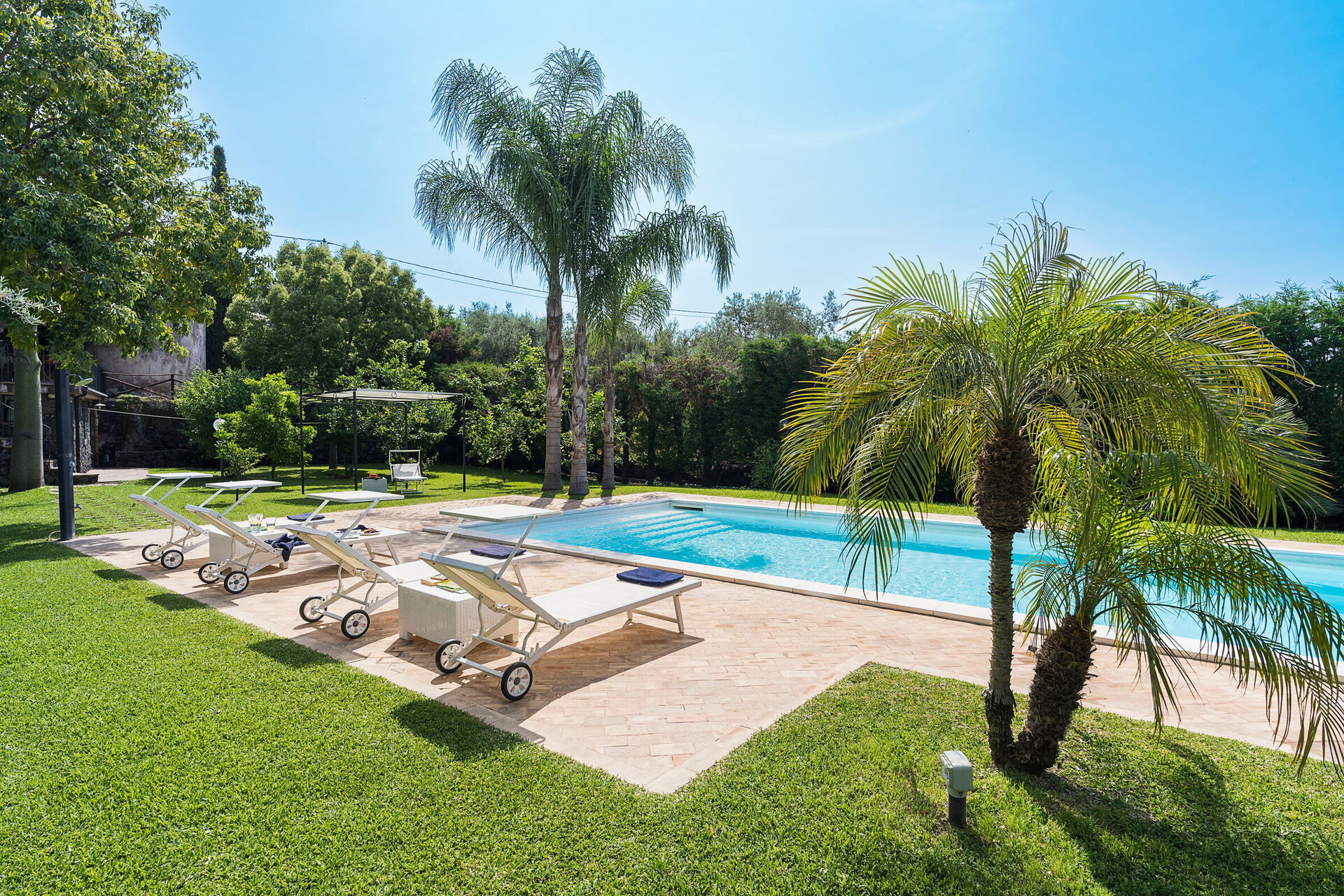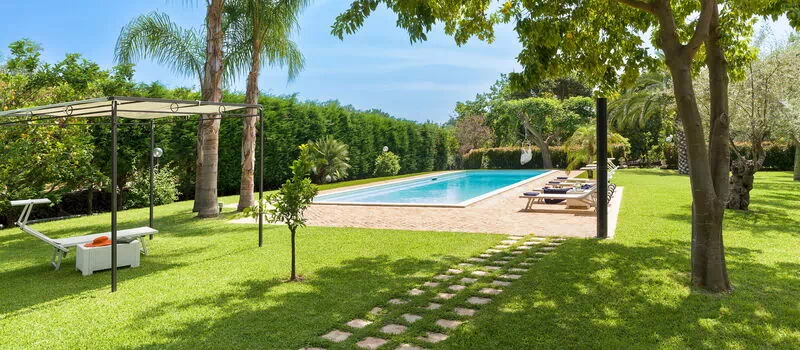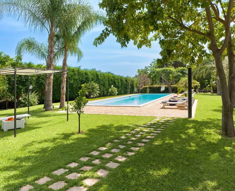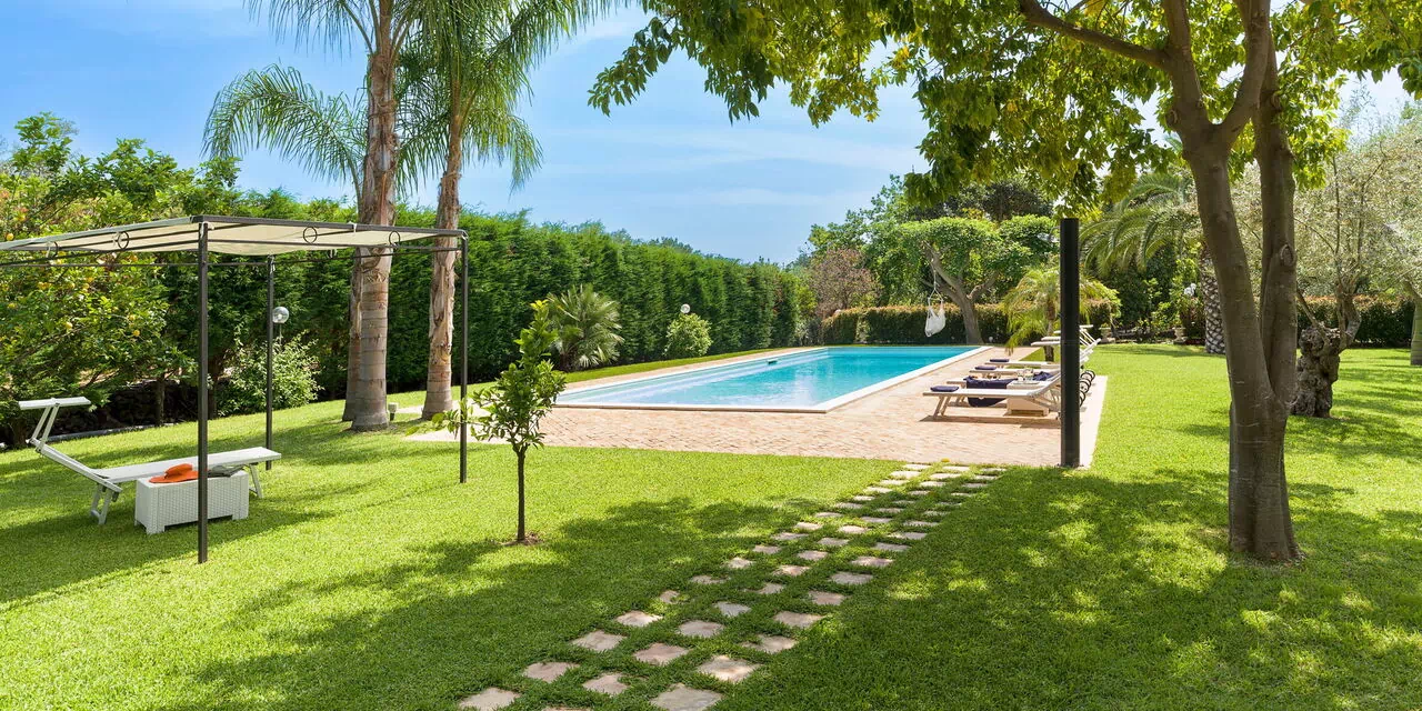 Oasi Verde is a splendid villa with salt swimming pool (5x18 m, depth 1.00-2.00 m) located near Acireale, a few kilometers from Catania in eastern Sicily. The house extends over 2 floors and is surrounded by a garden with lawn, large well-kept terraces equipped for relaxation, and a tavern with fireplace and barbecue, equipped for outdoor dining. With its recent renovation, the residence offers a combination of elegant interior spaces and large, well-kept outdoor areas. Ideal location to easily reach various locations on the Ionian Riviera, including Acireale, Aci Trezza, Aci Castello, Etna and other characteristic foothill villages. The famous tourist resorts of Giardini Naxos, Taormina, Catania and Syracuse are a short distance away.