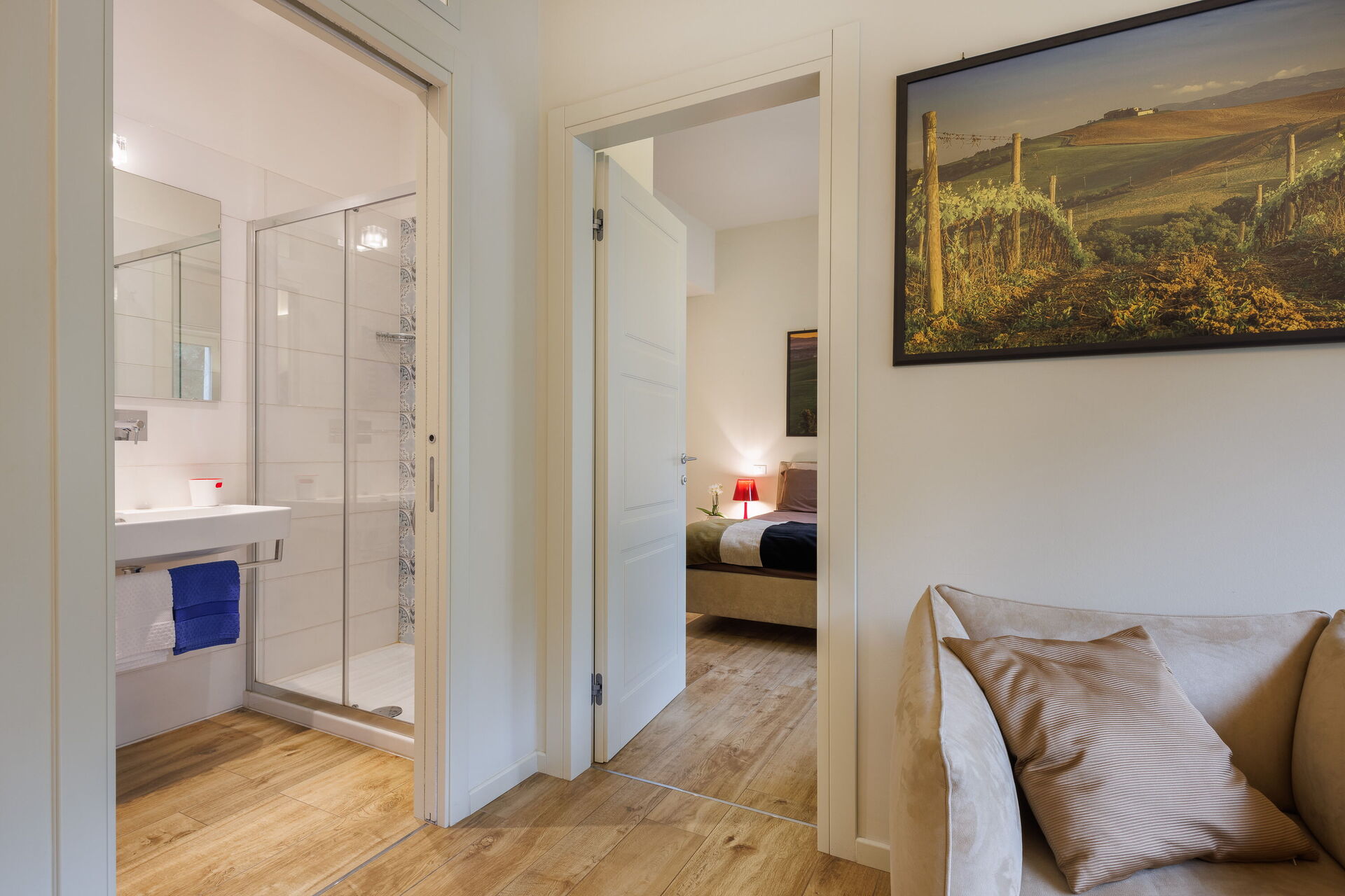 Betty Charming Apartment is a modern flat with a living room with kitchenette, the sleeping area consists of a suite with a double bedroom, bathroom with shower and an adjoining living room with a single bed and armchairs. A double bedroom with en-suite bathroom with shower and exit to the balcony. One bedroom with single bed and bathroom with shower.