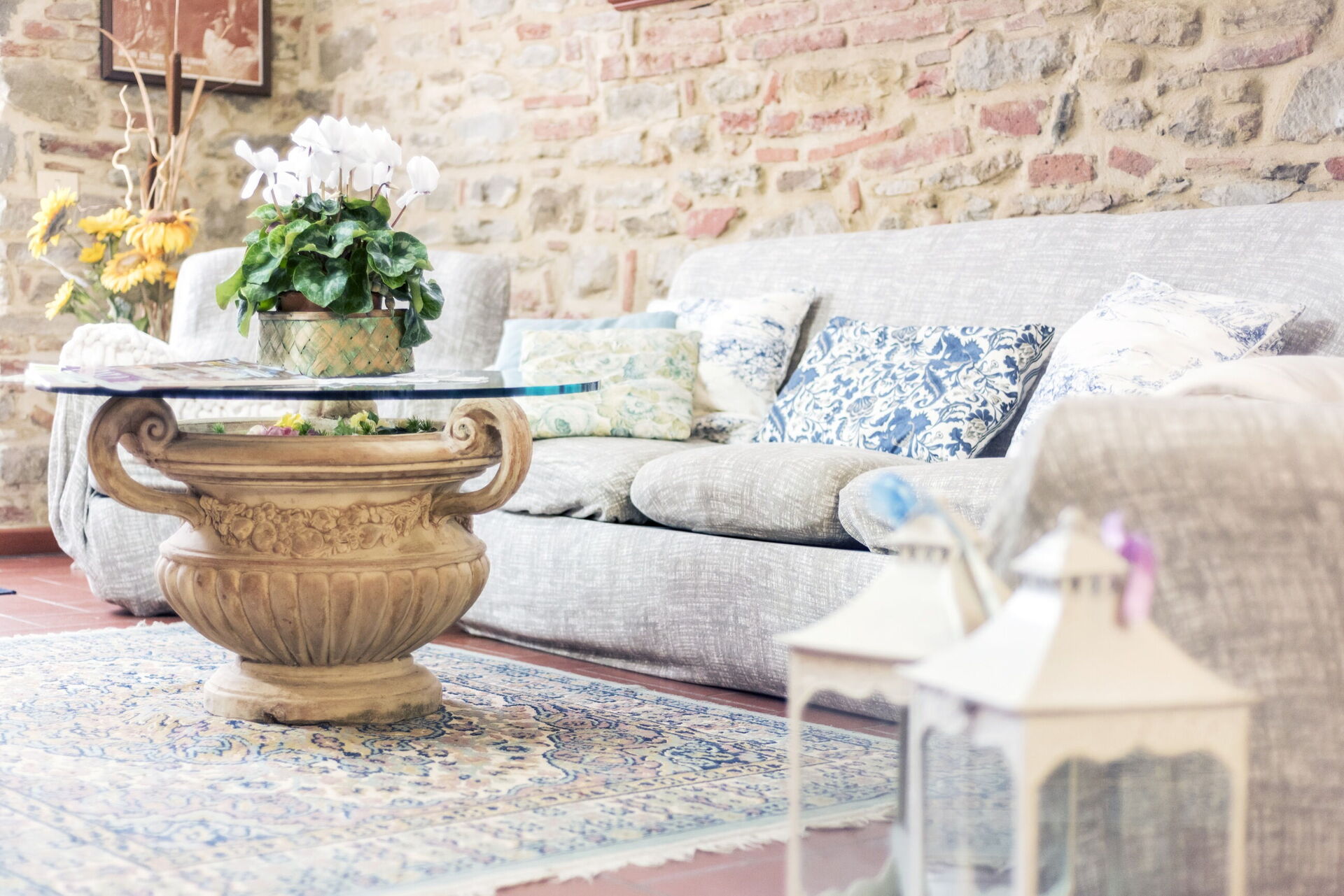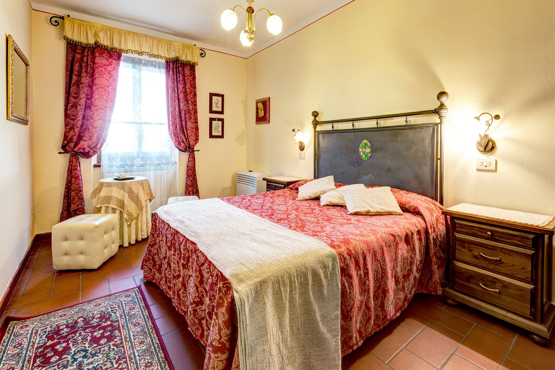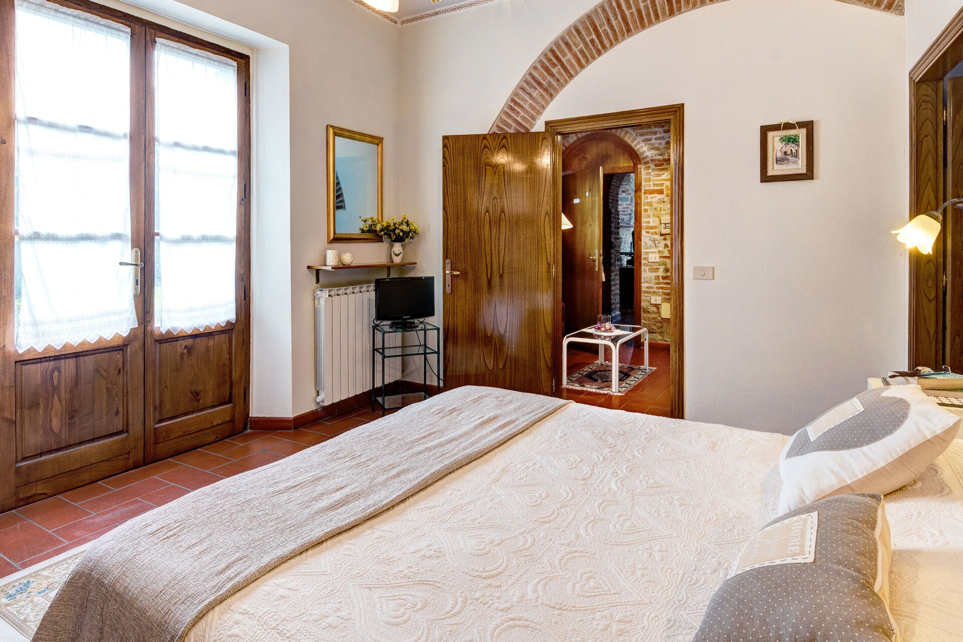 Equipped with a beautiful outdoor patio with breathtaking views of the garden and the Cortonese hill, the apartment, completely independent, allows guests to preserve their privacy and enjoy moments of absolute relaxation. The interiors preserve the traditional Tuscan style with terracotta floors, exposed wooden beams and stone walls that, combining with modern elements, gives an undisputed charm to the environment. The kitchen is fully equipped and has an adjacent living area and complete with sofa (transformable into a sofa bed) and TV.
