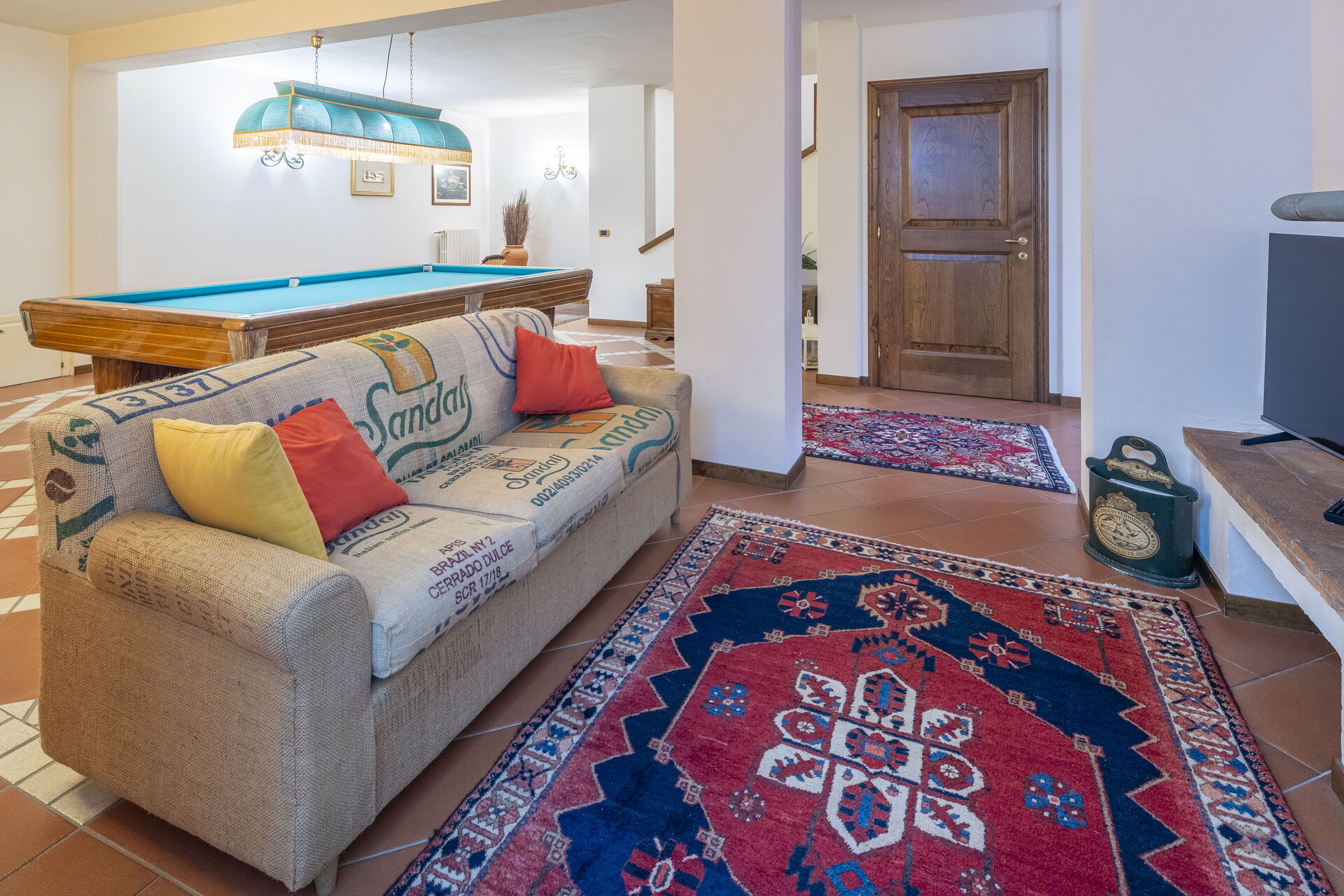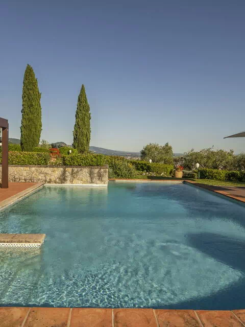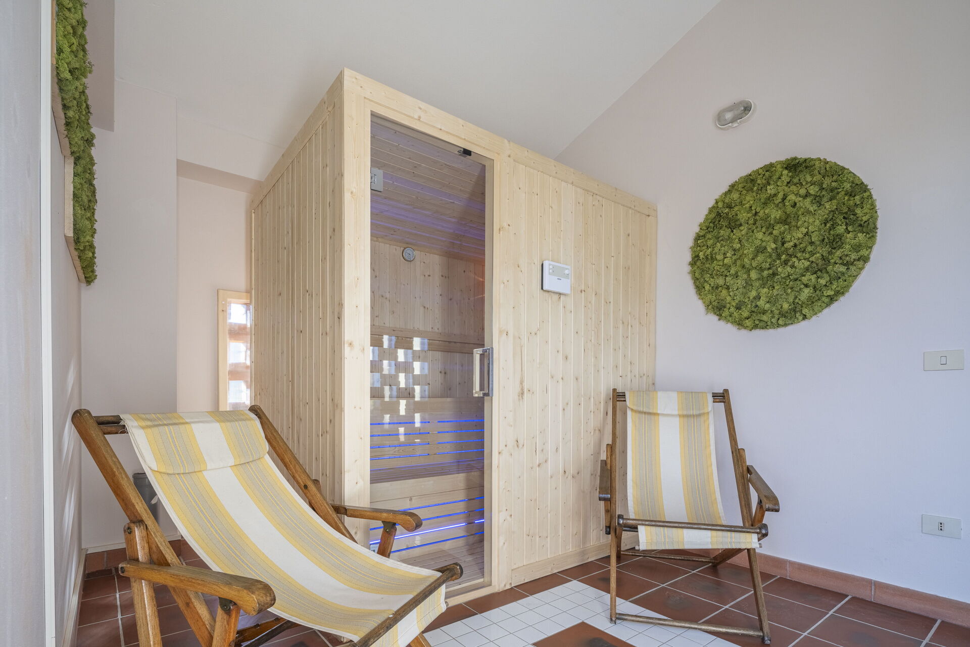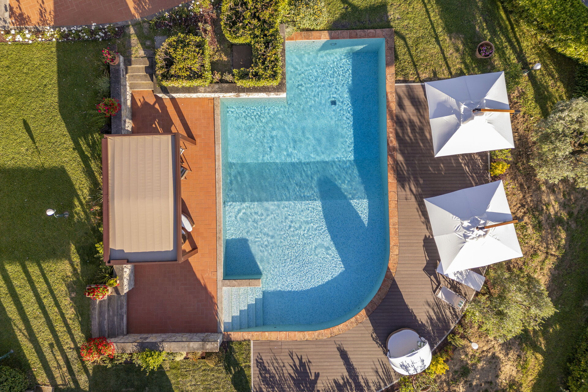 The swimming pool, with a stone edge, is rectangular in shape and has a Roman staircase for access; the pool measures 15 x 8 m, has a depth ranging from 1.3 to 2.50 m and is equipped with indoor lighting, with a gazebo equipped with a sofa and a mobile bar. All around is the sunbathing area, which covers an area of 200 sq. m. of lined and a further 500 sq. m. of lawn and is equipped with lighting. The sunbathing area is equipped with parasols, sun loungers, tables and DayBad to offer guests maximum comfort. The pool area is also equipped with hot and cold showers and the wellness area with whirlpool and sauna.