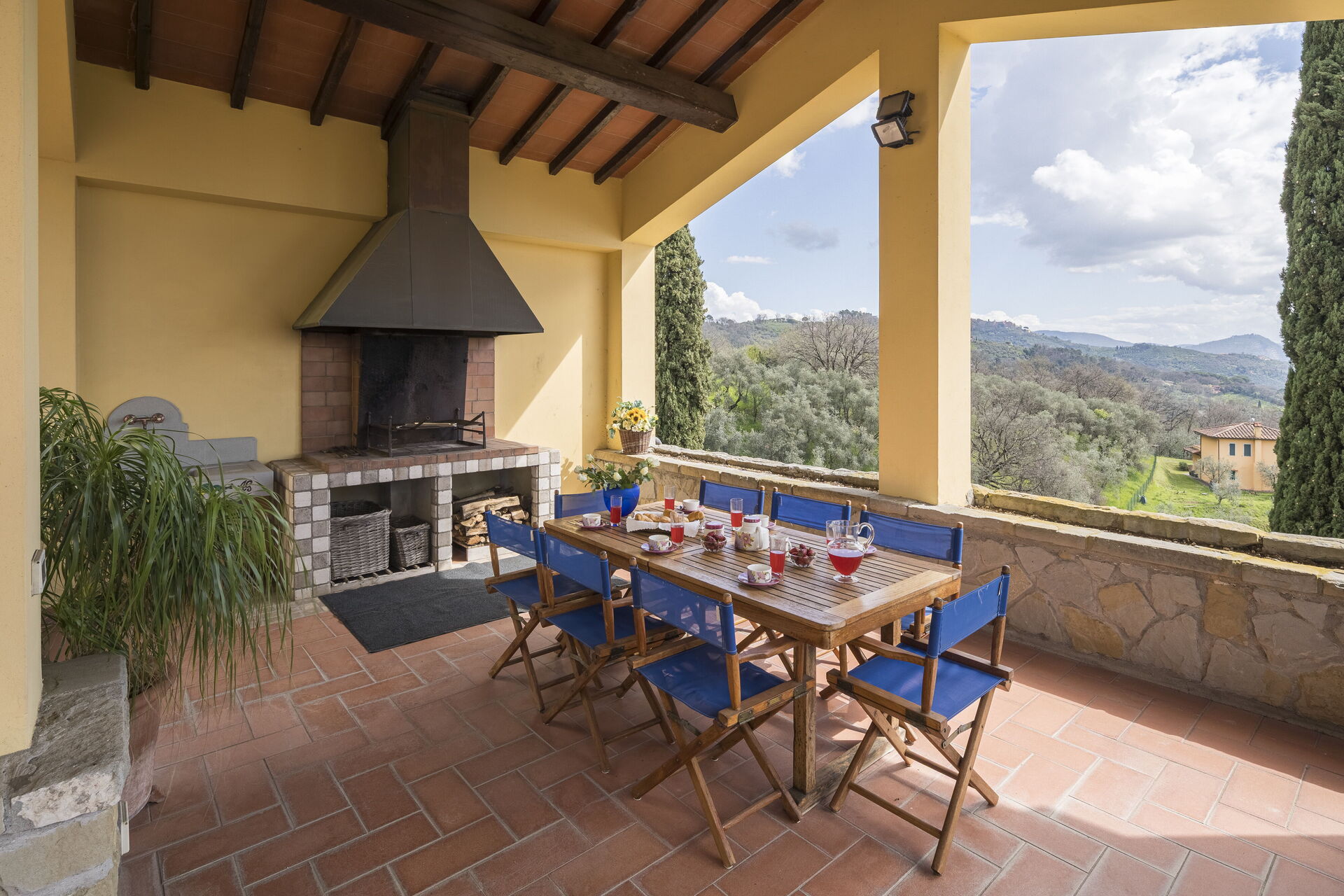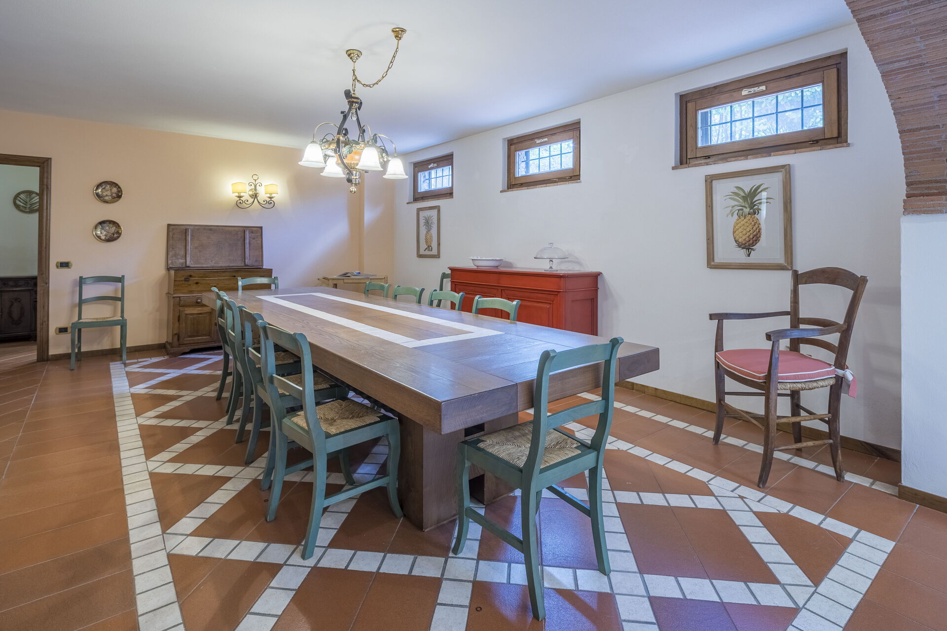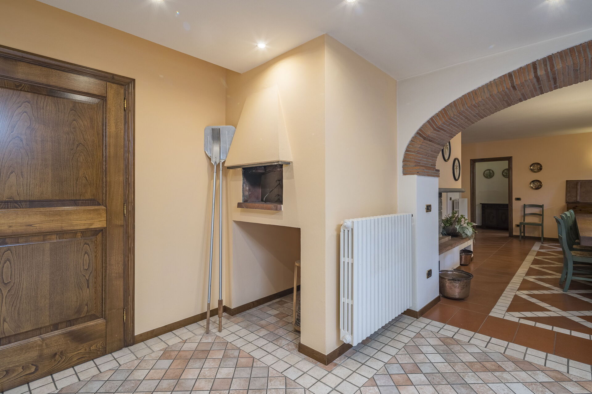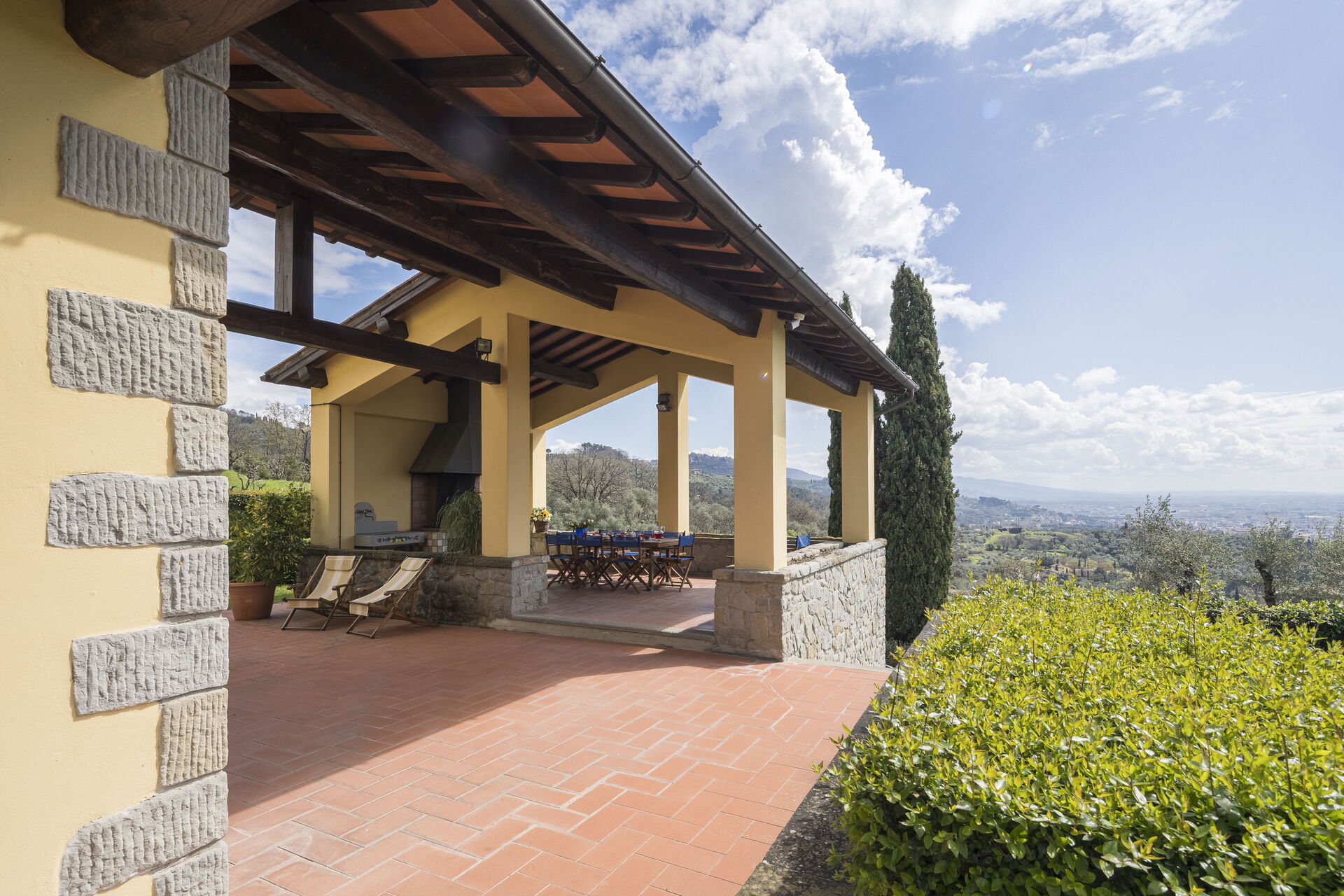 The outdoor spaces are surrounded by greenery, with manicured gardens to enjoy the panorama of the rural landscapes of the Valdinievole. The beautiful fenced park surrounding the house is full of hedges marking the boundary to safeguard your privacy and the characteristic olive trees, a symbol par excellence of Tuscany. The well-kept lawn is trimmed in English style and offers natural shady areas and lush scented vegetation such as roses, oleanders and aromatic plants. The outdoor dining area is equipped with a brick barbecue and a wood-burning oven.
