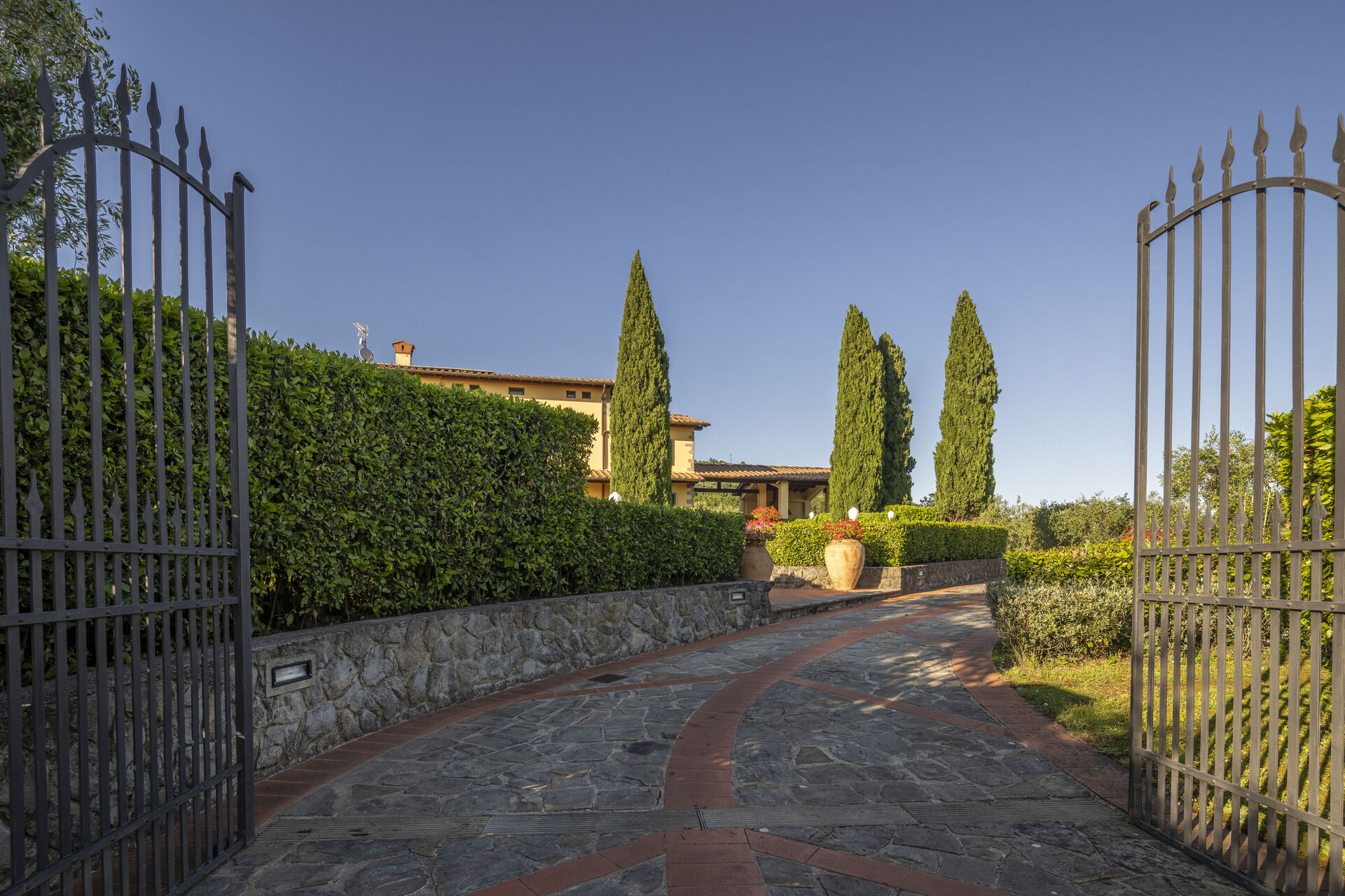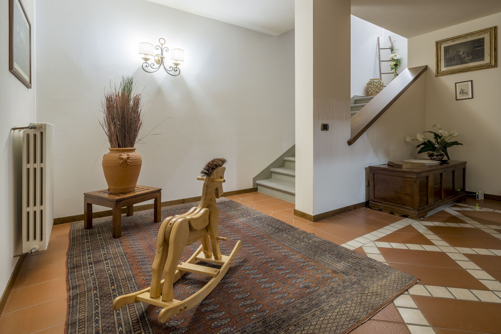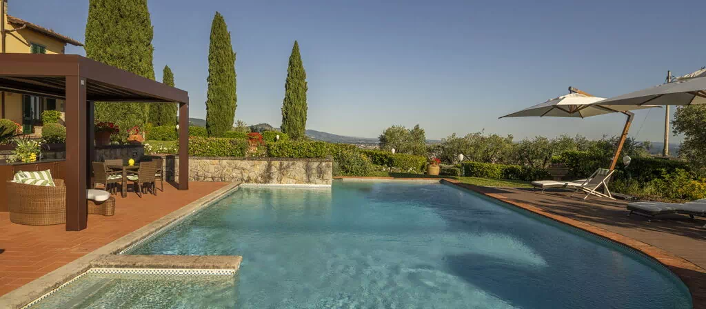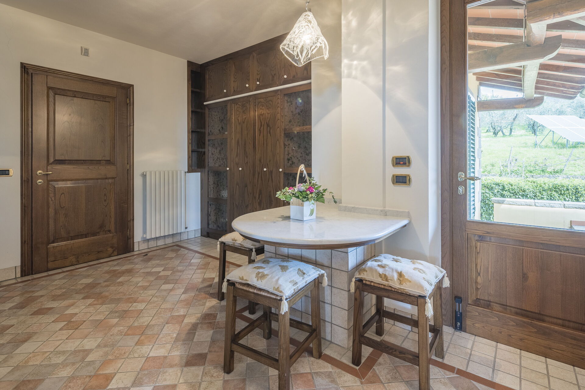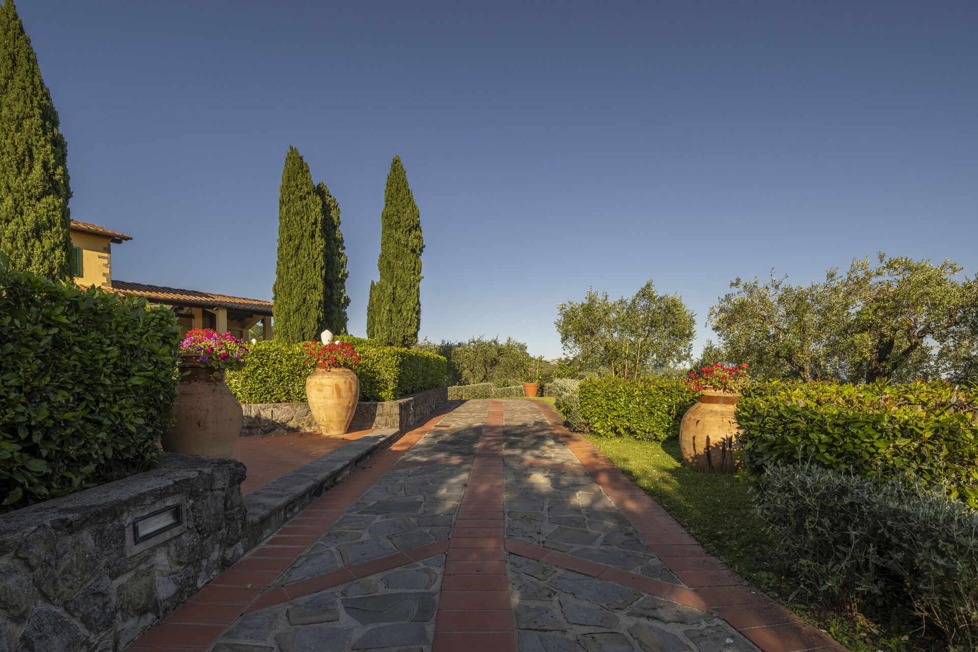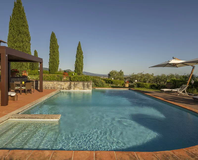 The outdoor spaces are surrounded by greenery, with manicured gardens to enjoy the panorama of the rural landscapes of the Valdinievole. The beautiful fenced park surrounding the house is full of hedges marking the boundary to safeguard your privacy and the characteristic olive trees, a symbol par excellence of Tuscany. The well-kept lawn is trimmed in English style and offers natural shady areas and lush scented vegetation such as roses, oleanders and aromatic plants. The outdoor dining area is equipped with a brick barbecue and a wood-burning oven.